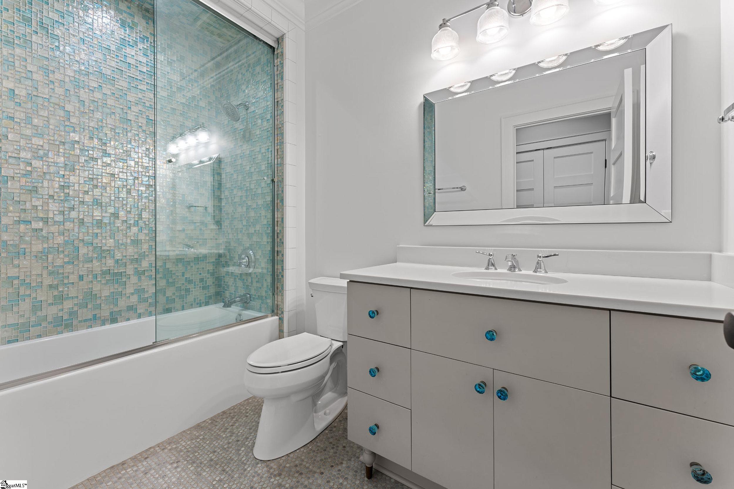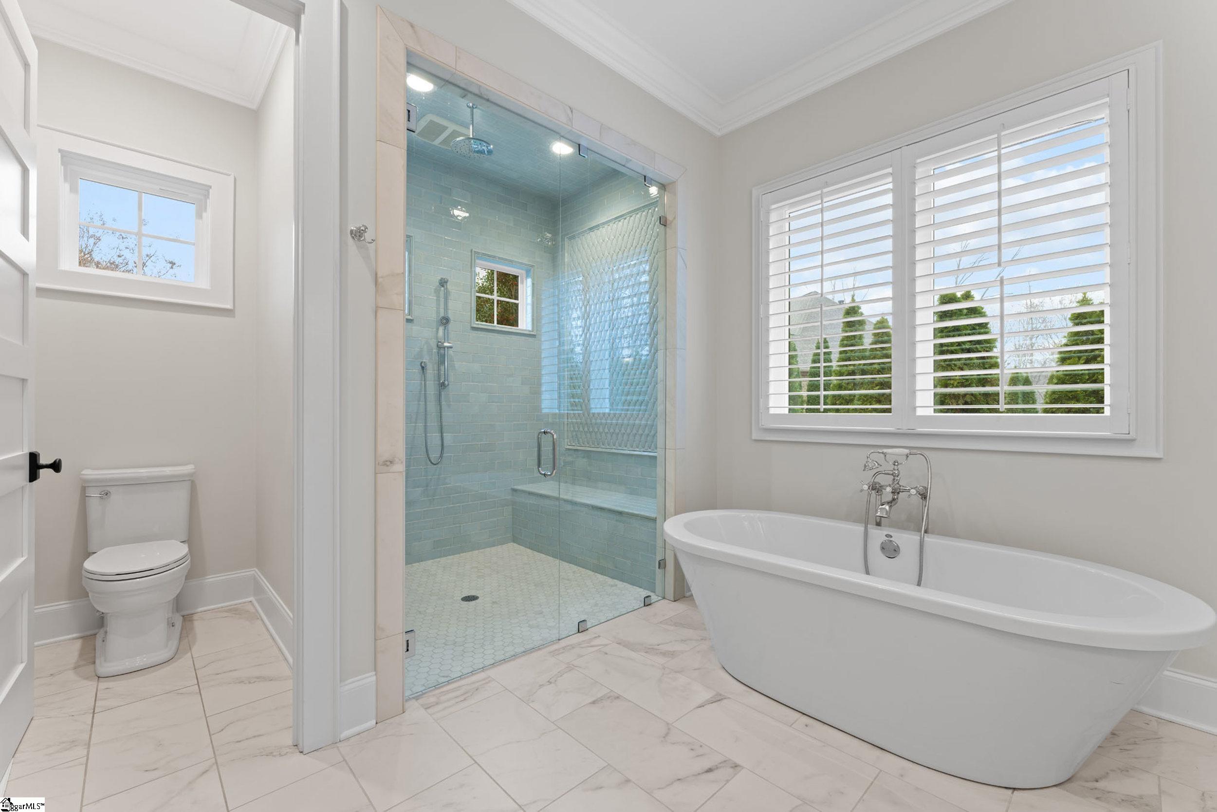 Nestled in the heart of Greenville’s Eastside, this custom-built home is truly one-of-a-kind. At the end of a quiet cul-de-sac, it is positioned on an exceptionally private lot in a small, gated community. This meticulously crafted residence is rich in architectural detail. Leaded glass mahogany front doors and a stone front porch set the tone for the exceptional quality found throughout. Inside, you’ll find beautiful tongue-and-groove coffered ceilings, hardwood floors, and a stunning living room that showcases a large and cozy brick fireplace. Designed for both everyday living and grand entertaining, the chef’s kitchen is outfitted with a Wolf 6-burner range, double ovens, warming drawer, Sub-Zero refrigerator, quartz countertops, and floor-to-ceiling custom cabinetry. A well-appointed butler’s pantry is every cook’s dream and enhances functionality and storage space with floor to ceiling cabinets, a U-Line beverage refrigerator, ice maker, and built-in microwave. All appliances are included in the transaction (including brand new LG washer and dryer). Outdoor living reaches new heights with a screened porch (showcasing a wood-burning fireplace with gas starter and TV) that opens onto a stone patio overlooking the truly spectacular and private retreat surrounded by trees. This backyard sanctuary features expansive, low-maintenance synthetic turf, multiple outdoor entertaining spaces, and a heated luxury Latham saltwater pool with a sleek retractable cover (the ultimate for safety and utility). A backyard basketball court with a rebounder wall (for tennis or pickleball) completes this amazing outdoor oasis, offering both recreation and serenity. The main-level primary suite provides a peaceful escape with direct porch access, an oversized custom walk-in closet, and a spa-inspired bathroom. A second guest suite on the main floor adds convenience and flexibility. Upstairs, you’ll find two additional ensuite bedrooms. Every bedroom has custom, built-in closets. The bonus room is perfect for a media or recreation space and the massive 80” TV and sound system convey with the property. The current owners have thoughtfully added an office/flex room in the attic, maximizing functionality and usable space. You’ll also appreciate the Sonos whole house speaker system. Additional features include endless storage in the walk-in attic and cellar, and an oversized three-car garage with epoxy flooring. Zoned for award-winning schools and ideally located between Greenville and Spartanburg, with easy access to I-85 and GSP Airport, this extraordinary home offers luxury, privacy, and convenience in perfect harmony – a rare find in the heart of Greenville. You’ll regret not seeing this one.