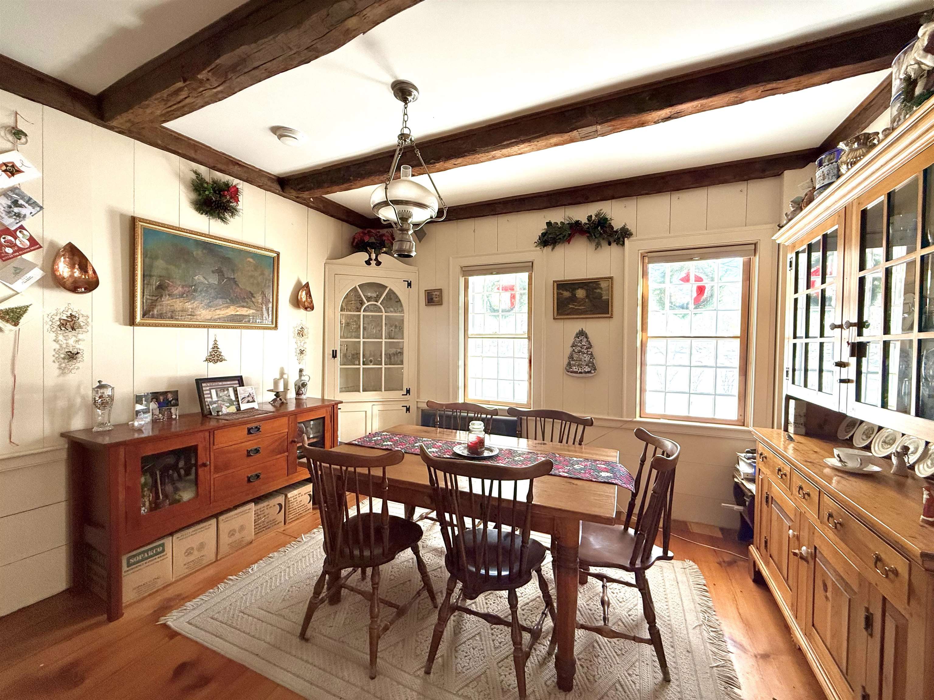 Step into timeless New England charm with this historic circa 1760's expanded Cape, offering a great blend of early craftsmanship and character. The home showcases classic timber-frame construction with hand-hewn beams, beautiful plank floors, and period details that create warmth and authenticity throughout. With three bedrooms and two full bathrooms the layout includes a highly desirable first floor primary bedroom and bath, allowing for convenient single-level living while still offering flexible space for family and guests. Set on an expansive 15. 55-acre parcel, the property provides mountain views, 47 blueberry bushes, and endless possibilities for agricultural, equestrian, or recreational use. A fantastic, paved driveway offers easy access to the home and leads to an oversized Four car garage, providing ample space for vehicles, equipment, and storage. An additional three and a half car garage and a large barn enhance the property’s versatility, ideal for car collectors, hobbyists, creative pursuits, or ample additional storage needs. of the most captivating features is the large scenic pond complete with a small charming, renovated boathouse perfect for peaceful mornings, outdoor gatherings, or simply enjoying the natural setting year-round. Ideally located just 10 minutes from the base of Mount Ascutney offering endless hiking and outdoor adventure, and within 25 minutes of Okemo Mountain and many other ski mountain options.