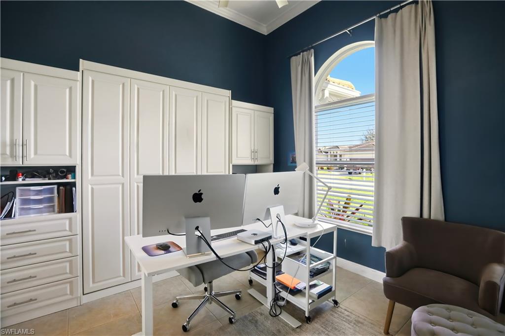Designed for flexible living, the home includes a large office with built-in storage and a Murphy bed, allowing the space to easily convert into an additional bedroom if desired. At the front of the home, a separate seating area and formal dining space provide versatility, while the open concept living area adjacent to the kitchen creates an ideal setting for everyday living and entertaining. The living area opens beautifully onto the expansive covered lanai and pool area, creating a seamless indoor-outdoor flow.