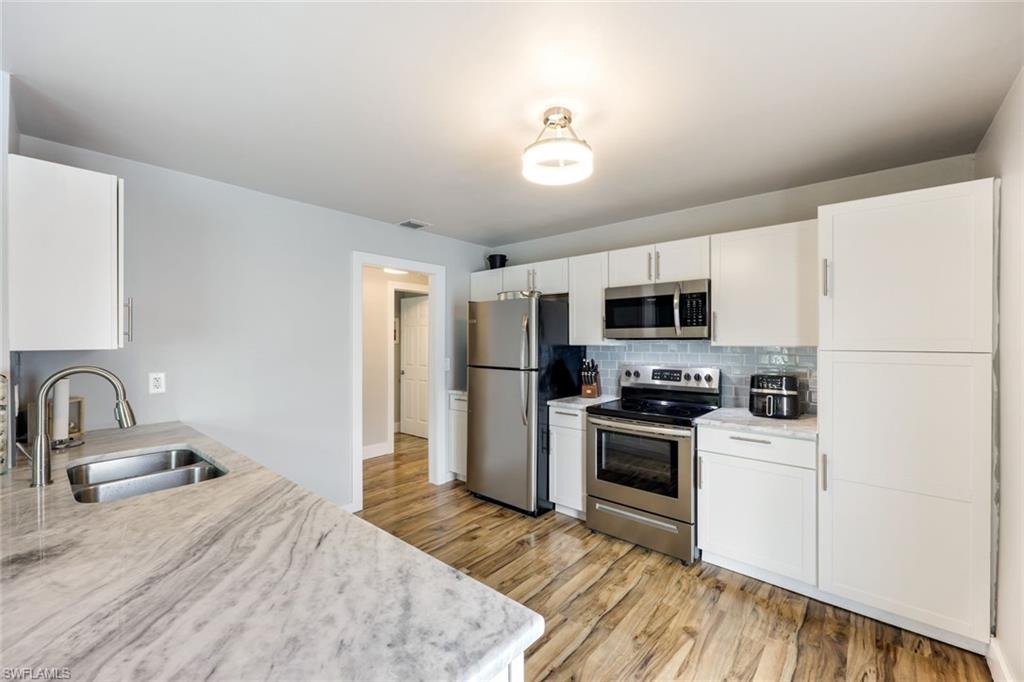 Thoughtfully updated with an effortless coastal living! This 3/2 residence offers the beach lifestyle of your dreams in this prime location blocks to the white sugar sand! The light-filled interior showcases an open kitchen with crisp white cabinetry, quartz countertops, stainless steel appliances, and a glass mosaic backsplash, complemented by updated flooring. The French door leads directly to your barbecue area right outside of the kitchen! Curated lighting and fixtures, and fresh interior including trendy white exterior paint! Both bathrooms have been nicely updated and refreshed, and the primary suite features a customized walk-in closet. The home opens to a private, tropical-style setting complete with a spa designed for relaxation and entertaining, featuring mature fruit trees. Newer 6ft privacy fence provides privacy that creates a tranquil retreat and the 2019 roof adds peace of mind!