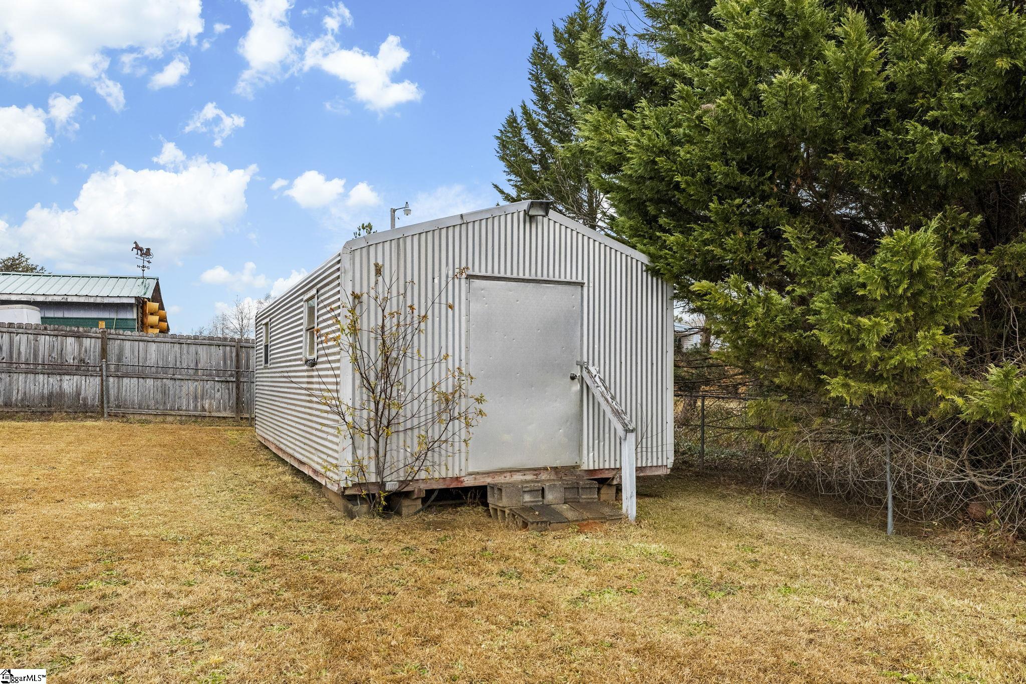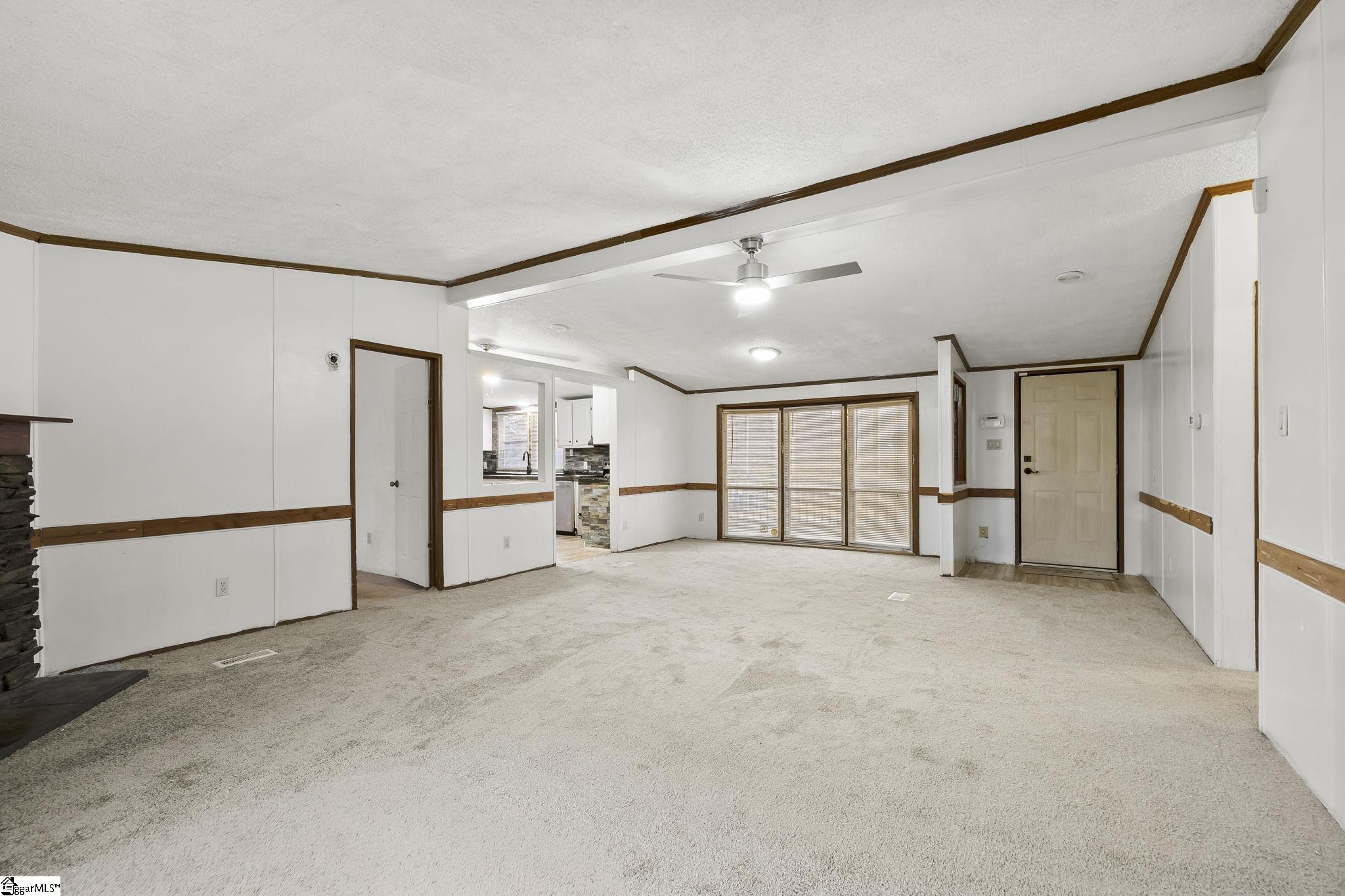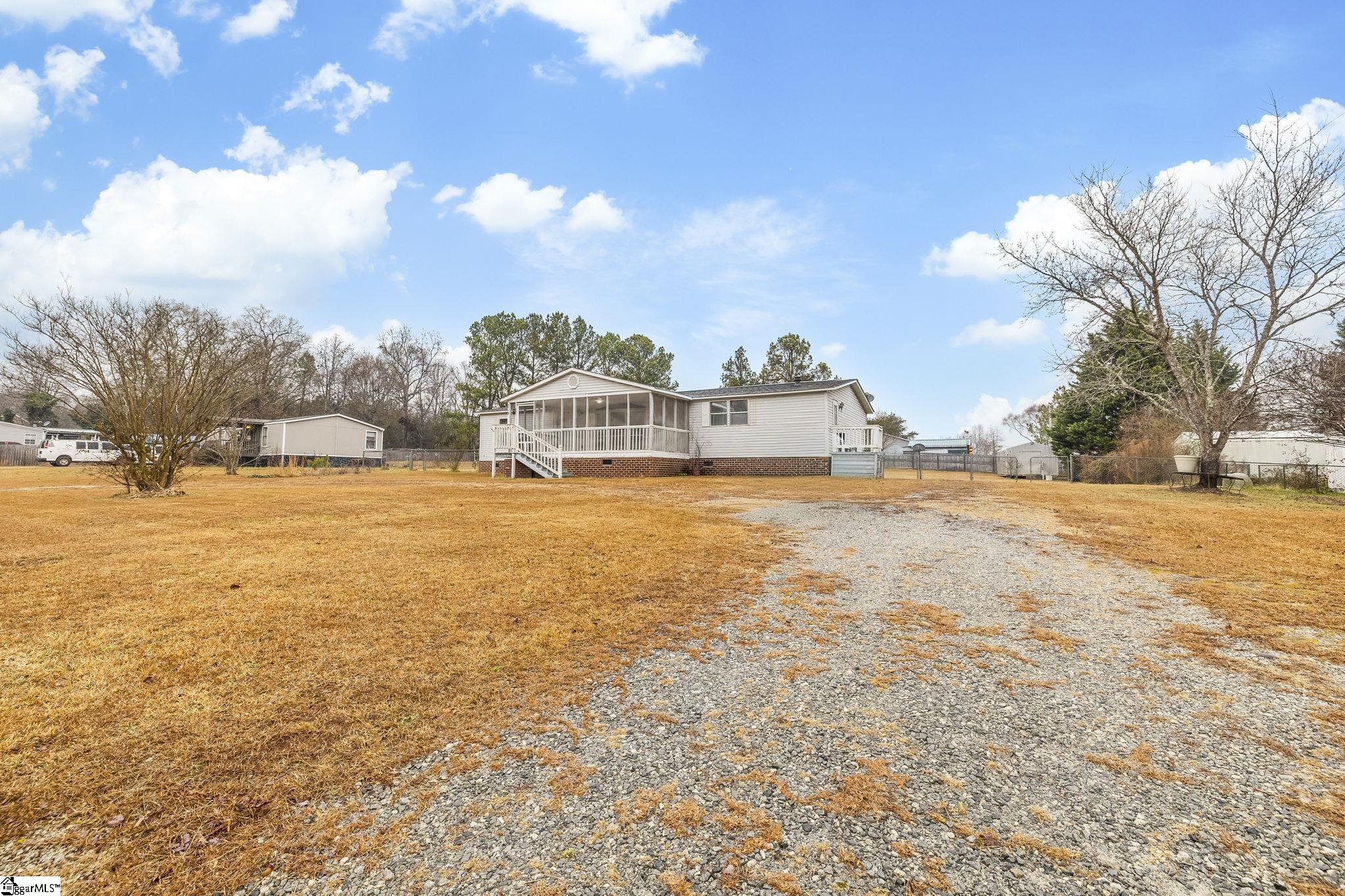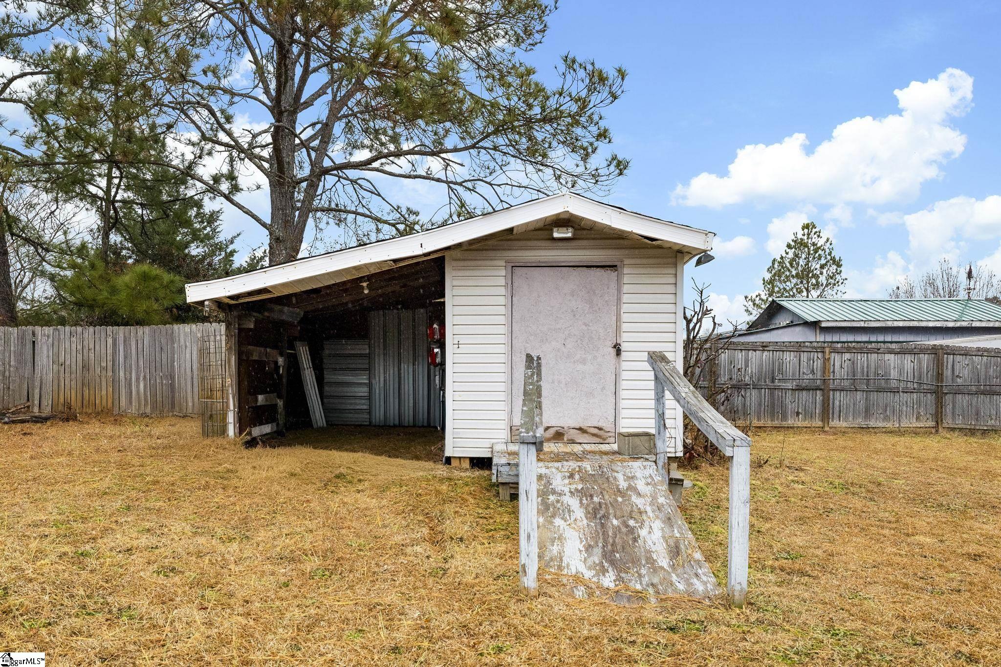 219 Campbell Lake Road offers a flexible opportunity on just over half an acre with NO HOA, conveniently located in the heart of Greer. The 3-bedroom, 2-bath home features a huge screened front porch, providing a great space for relaxing and spending time with friends and family. The open-concept floor plan includes a living room with a fireplace and a spacious dining area. The kitchen provides ample prep space and connects easily to the main living areas. A walk-in laundry room off the kitchen includes a separate exterior door for added convenience. The split bedroom floor plan allows privacy for the primary suite, which features an attached bath with dual vanities and a walk-in shower. Two secondary bedrooms share a hall bath. The large, fully fenced backyard includes multiple outbuildings suitable for workshops, storage, or even a she-shed while still offering plenty of space for gardens, playsets, and furry family members! Conveniently located just off Highway 14 in Greer and minutes from Wade Hampton Boulevard and downtown Greer’s shopping, dining, and entertainment. Sold AS IS.