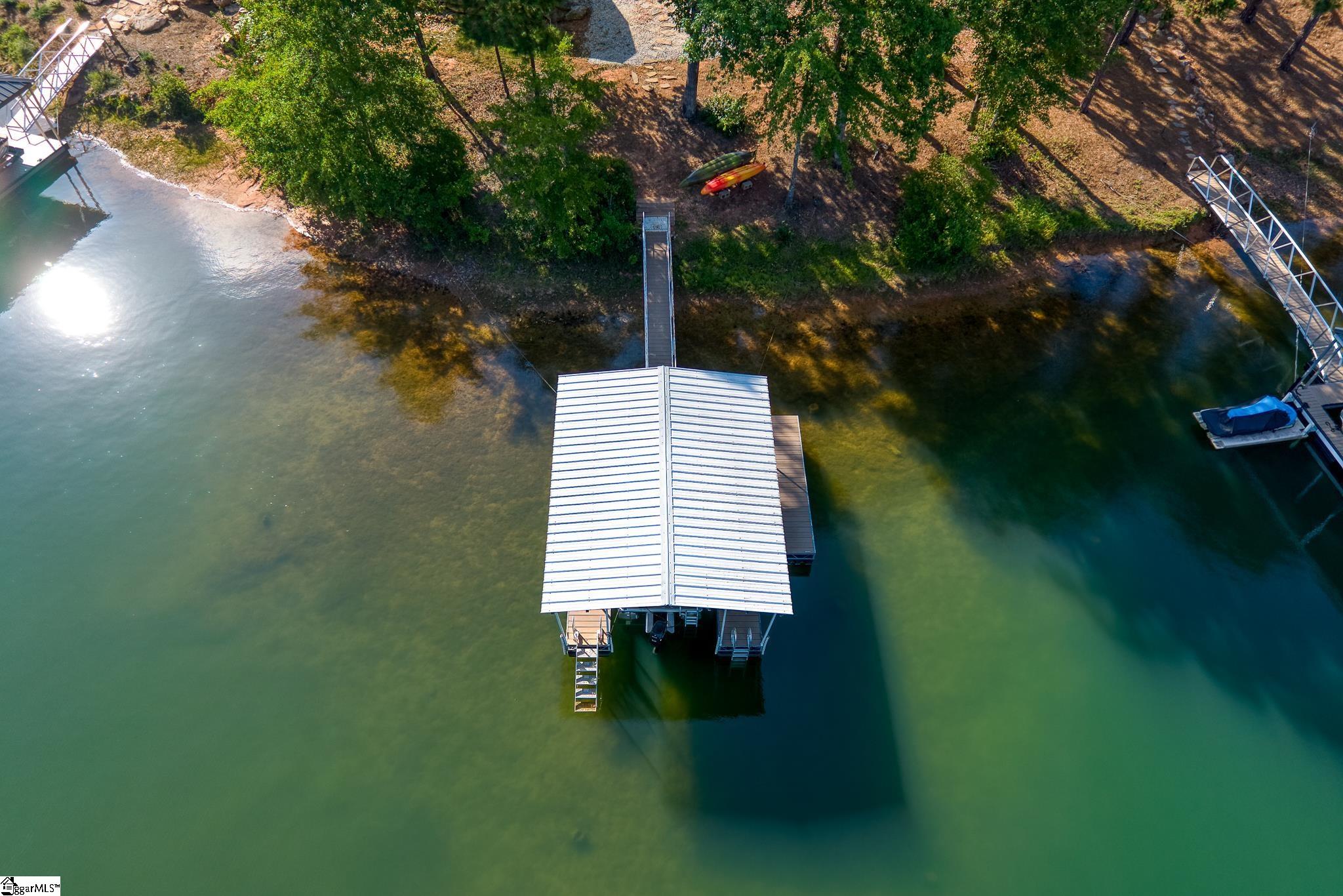 AIR BNB Short Term Leasing Allowed. No HOA Fees. Embrace lakeside living at 401 Long Ridge View Lane, a brand-new, three-level waterfront home on Lake Keowee in Seneca, SC with a short level walk to the crystal clear water shore line with a full size Covered Boat Dock-Sun Bathing Deck located in 12-13 ft deep water right off the dock . The main floor welcomes you with an open kitchen and living area featuring warm wood cabinetry, sleek appliances, and a center island—perfect for casual breakfasts or entertaining. The master bedroom is located on the main level with double vanity, beautiful walk in shower and large walk in closet. Step out onto the screened-in porch to enjoy morning coffee or sunset cocktails while taking in peaceful water views, relax on the flagstone patio that is pre-wired 220V should new owner install a Hot Tub. Water lovers will appreciate the covered dock in a deep-water cove and the handy storage building for skis and gear. Downstairs, a walk-out basement offers a spacious bonus room with a wet bar, an extra bedroom, a full bath, and a climate-controlled storage area, could be another room. Upstairs, find a bright bedroom with panoramic lake vistas plus a flexible room ideal for a home office, gym, or craft studio. The 2 car detached garage measures 24'x24' 500 SF inside the sheetrock is painted white, rafter ceiling for storage, area for work bench, the garage is located across from the lake house, there is an additional parking pad in front next to the driveway and a paved golf cart path leads to the covered dock. Seneca, SC, is a friendly lakeside town with local eateries, breweries, and easy access to Clemson University. Spend weekends boating, fishing, relaxing by the water, hiking, then explore downtown’s shops and festivals. This home isn’t just a house—it’s a lifestyle, Close To Everything ! The Stamp Creek Boat Ramp is within a mile. There is a voluntary street light and common area mowing annual fee of $ 362. Buyers to verify everything of importance. Note: Some of the inside photos show staged furnishings.