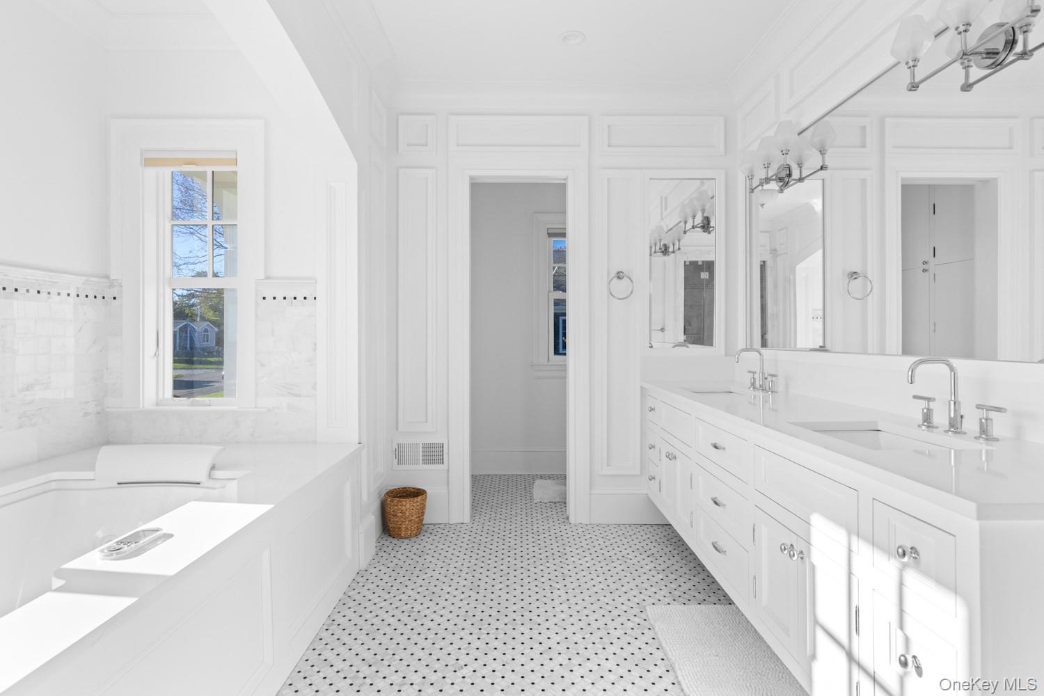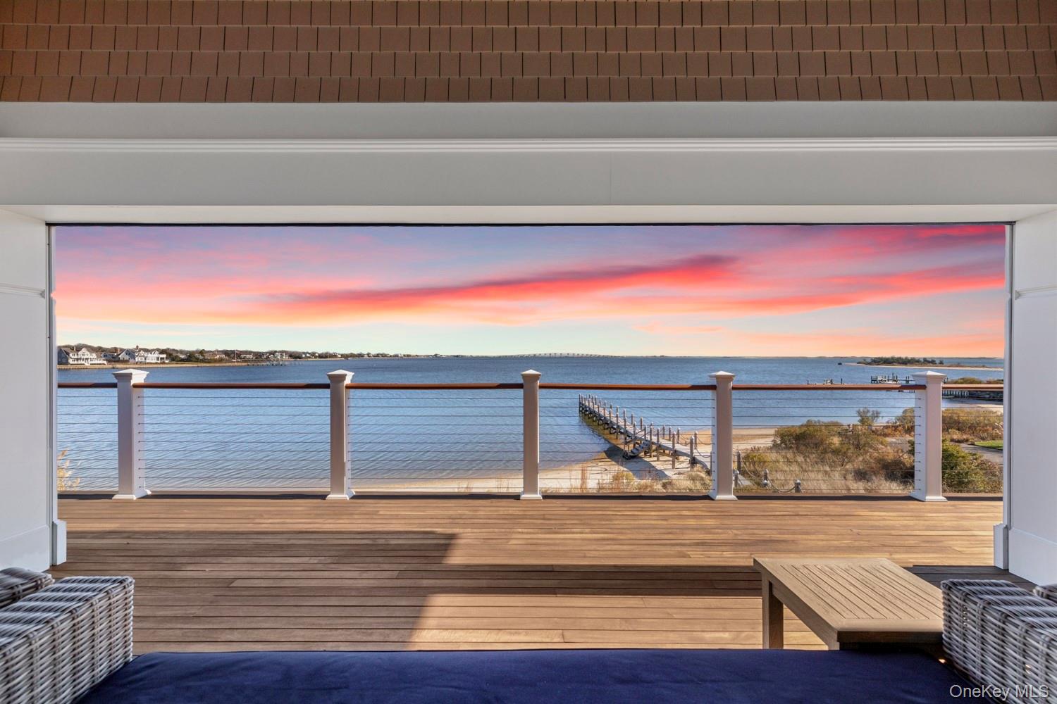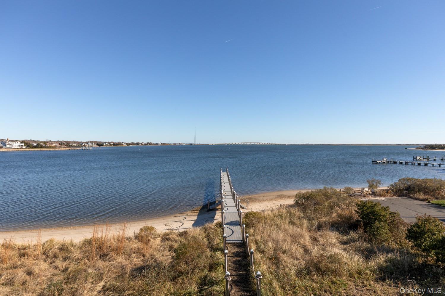 Set on 175 feet of private sandy beachfront with a 136' dock, this Shinnecock Bay waterfront residence is designed to highlight its panoramic setting and create a natural flow between interior spaces and the surrounding landscape. Multiple elevations and extensive glasswork frame open bay views from morning through evening, emphasizing light, orientation, and connection to the water. The open-concept main level includes a chef's kitchen with Wolf appliances, pantry, and a wall of glass doors that transition to the full-length mahogany deck, extending the living area directly toward the bay, infinity-edge pool, and spa. The first-floor waterfront primary suite features two walk-in closets, a spa bath with jacuzzi, and private access to the deck. A separate guest suite with private entrance, powder room, mudroom, and attached two-car garage complete the main level. The second floor offers a junior suite with terrace, a dedicated office, and a secondary living area with direct access to the upper full-length deck. Two additional en-suite bedrooms with walk-in closets, a laundry room, and a second powder room provide flexibility and privacy. Both levels include expansive rear decking, maximizing outdoor circulation and enhancing the home's orientation toward the bay. Situated south of the highway, the home is just minutes to marinas, beaches, and area dining, supporting both seasonal and year-round use. Homes offering this combination of substantial water frontage, docking capability, and modern construction are limited, making it a notable opportunity for buyers seeking direct waterfront access. This residence brings a rare alignment of features together in one setting, providing a practical and well-connected entry point to the Hamptons' coastal lifestyle.