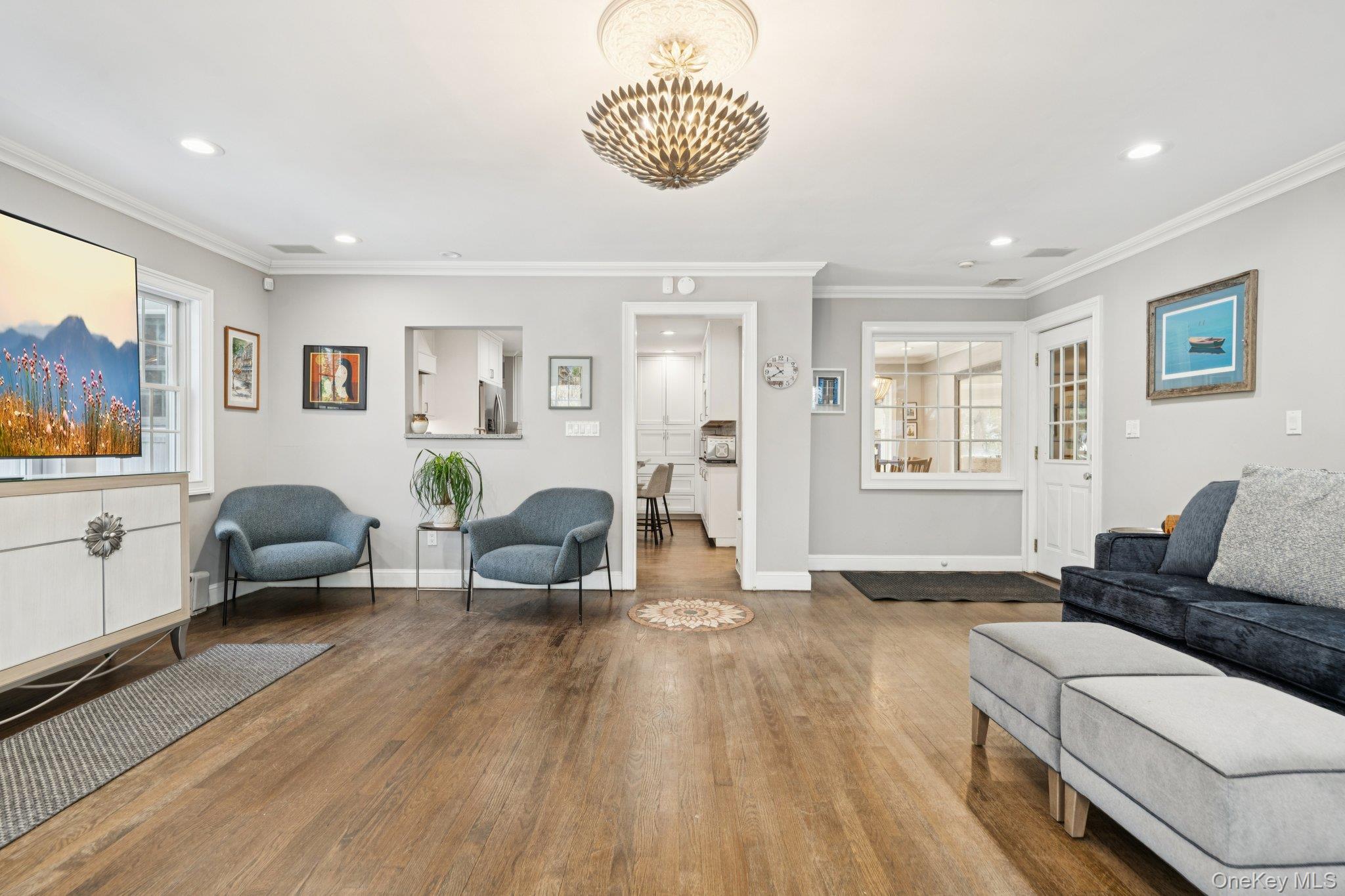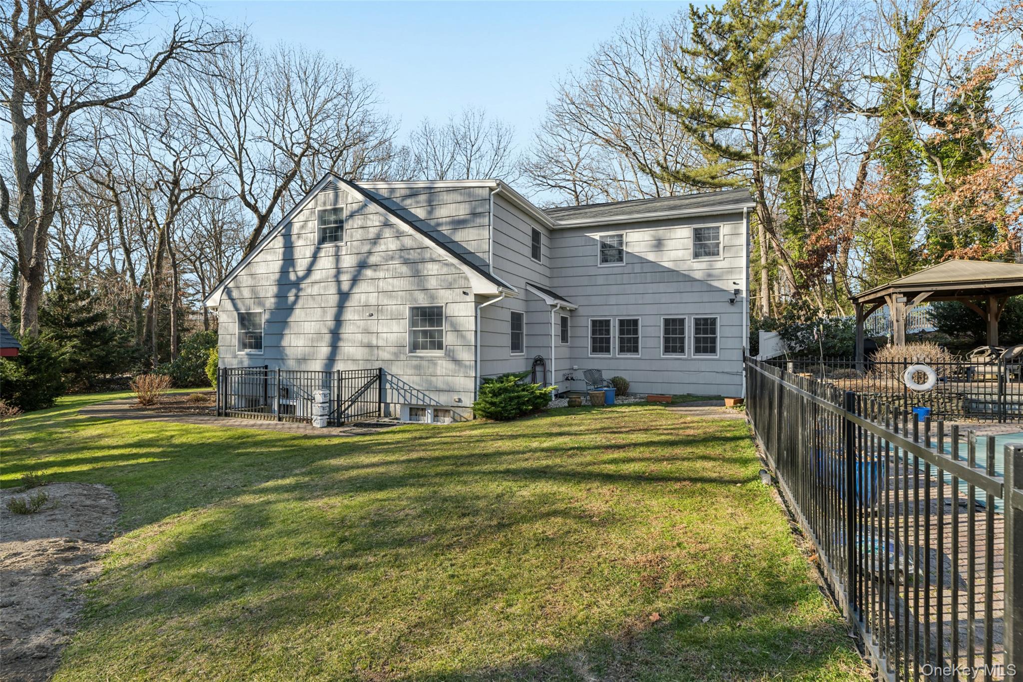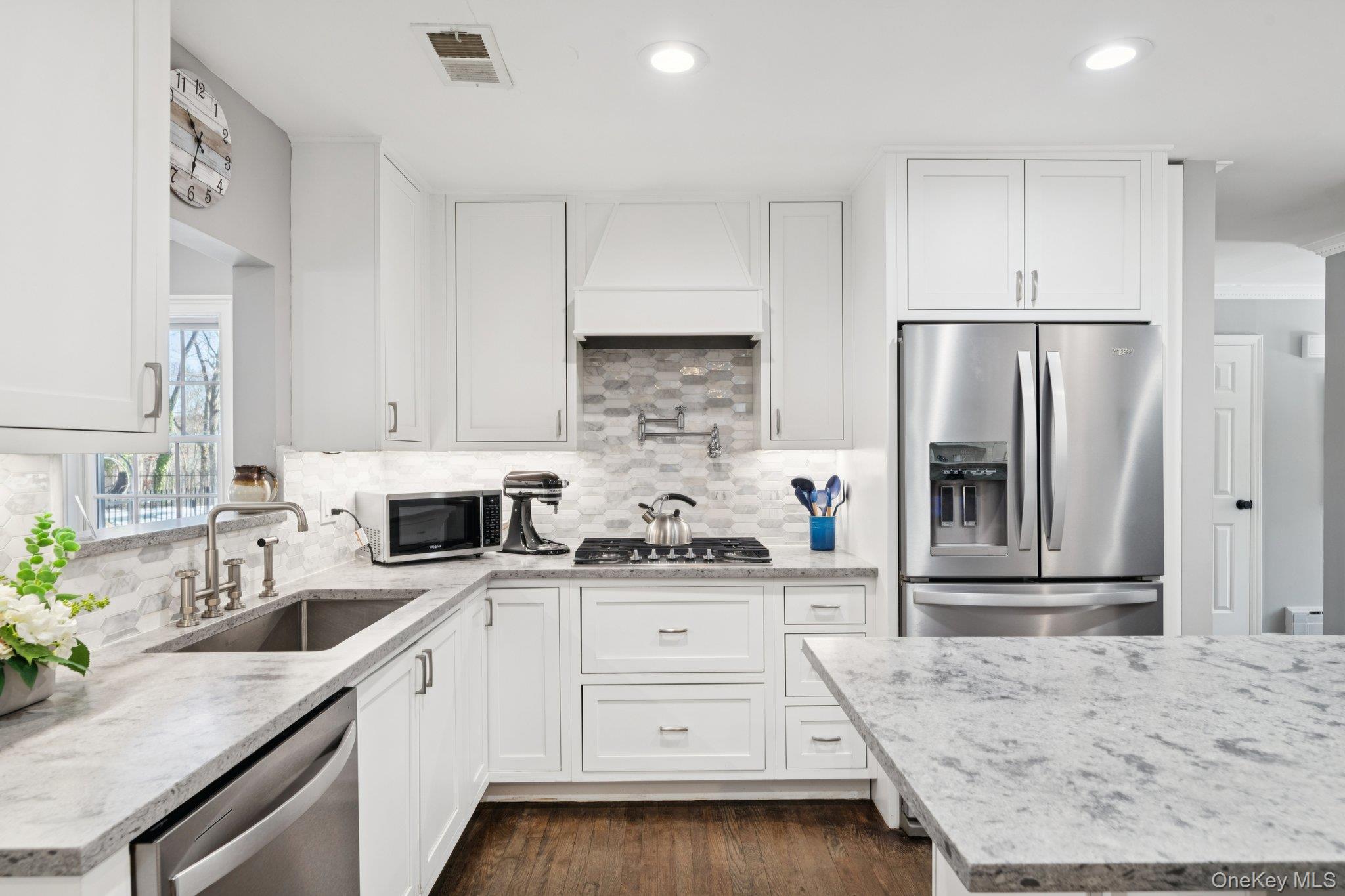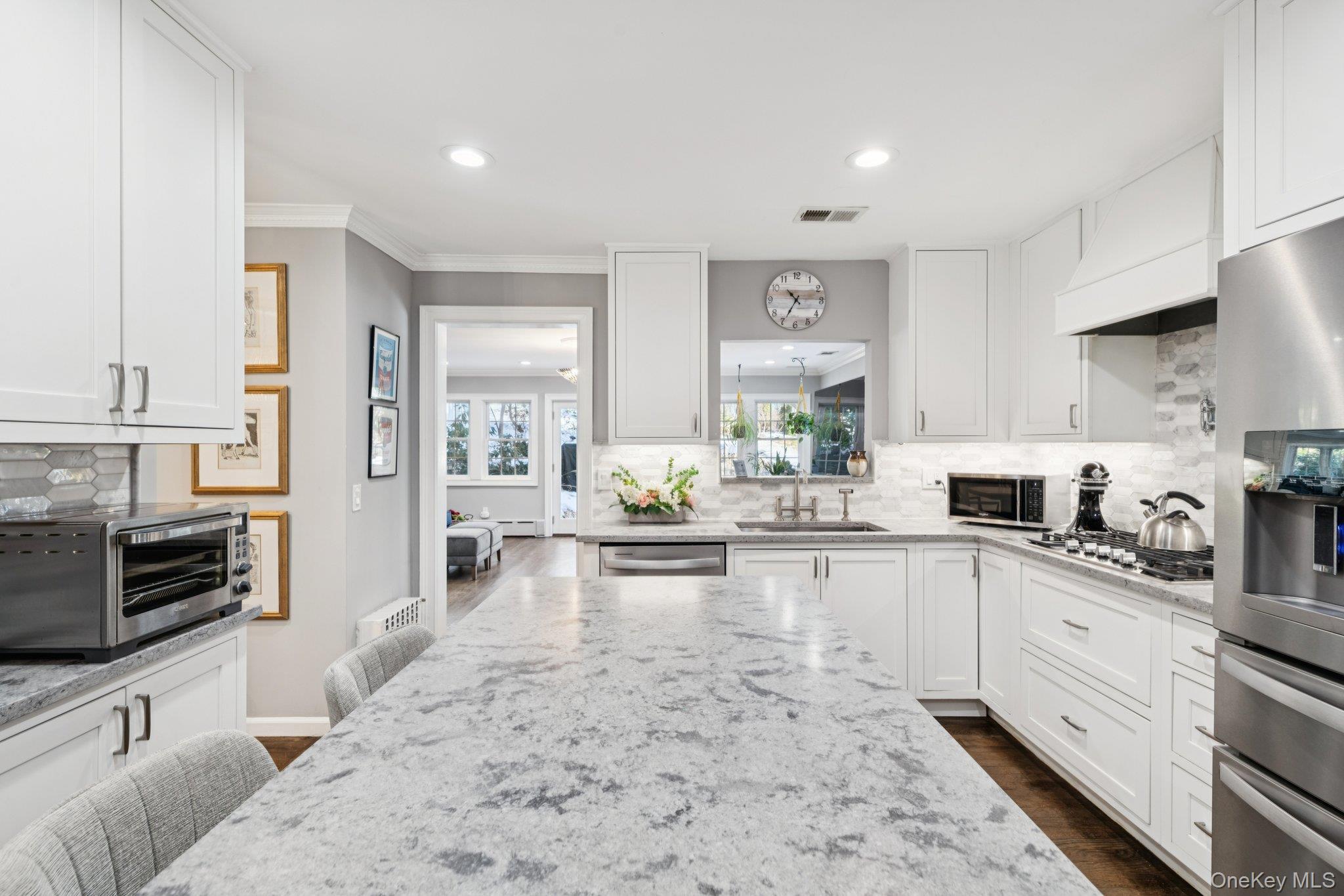 Welcome to this beautifully renovated 4-bedroom, 3-full-bath colonial, where timeless charm meets modern luxury. The heart of the home is a stunning chef’s kitchen featuring crisp white cabinetry, a large center island, quartz counter tops and tile backsplash. You will also find a double wall oven, cooktop, refrigerator, dishwasher, and an oversized farmhouse sink—perfect for both everyday living and entertaining. The spacious dining room easily accommodates gatherings, while the living room impresses with custom built-ins and a cozy wood-burning fireplace. The first floor offers exceptional flexibility with a bedroom and full bath, a spacious home office, and a convenient mudroom providing direct access to the two-car garage. Upstairs, you’ll find two generously sized bedrooms and a large full bathroom. A private hallway leads to the serene primary suite, complete with two expansive walk-in closets and a spa-like ensuite featuring a double vanity, whirlpool tub, and walk-in shower. The basement houses the washer and dryer along with a utility room showcasing a fully updated propane Navien heating system with four heating zones and instant hot water. Set on a picturesque one-acre park-like property, the outdoor space is truly exceptional, offering a 20' x 40' in-ground saltwater pool, pergola-covered patio, shed, and expanded in-ground sprinkler system. Additional highlights include a large driveway with a French drain and an in-ground 500-gallon propane tank discreetly located in the side yard. Conveniently located near the Village of Northport, enjoy easy access to renowned dining, boutique shopping, the historic Northport Theater, and a beautiful dog-friendly waterfront park. This exceptional home offers luxury, comfort, and lifestyle—make it yours today.