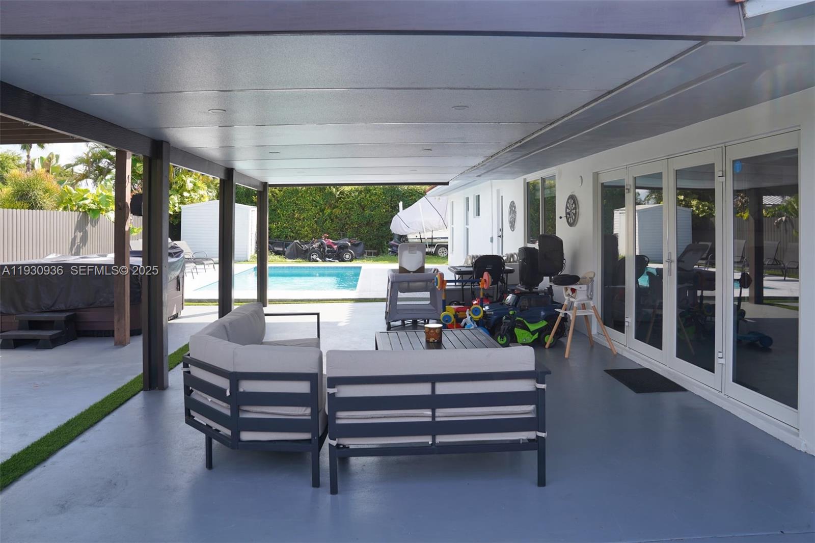 The exterior offers a patio with a new pool (2024), perfect for entertaining, with ideal space for a barbecue and room for a boat or RV. New driveway and barrel tile roof.