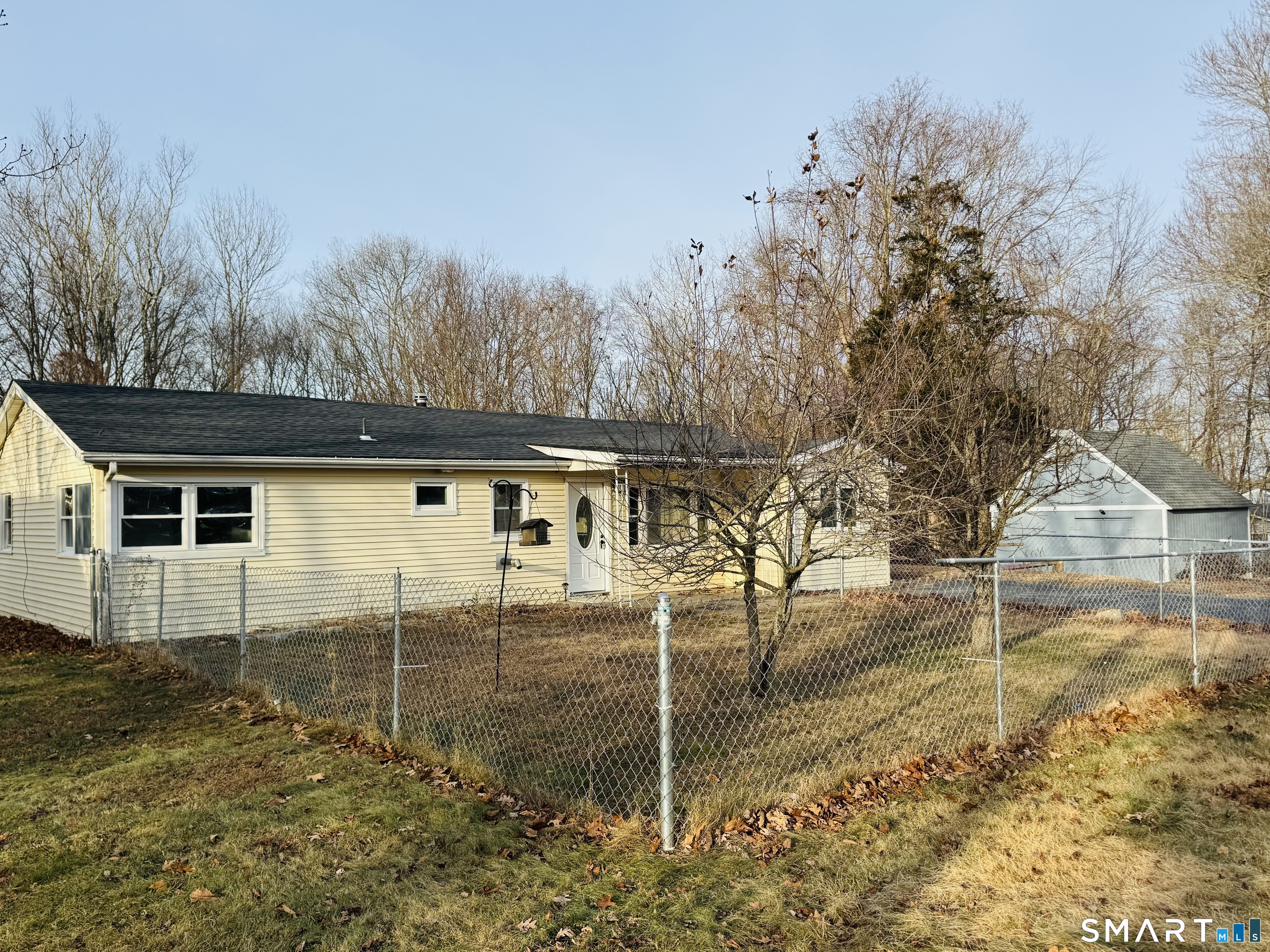 BEAUTIFUL hardwood floors in bright living room open to appliance kitchen. Primary bedroom has hardwood floor too! additional bedroom and a office next to a full bathroom. Laundry room off the kitchen. This RANCH is easy One level living, paved driveway, front fenced yard and LARGE outbuilding for storage. Sits on almost an acre! ONE year warranty too!