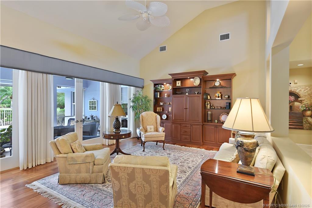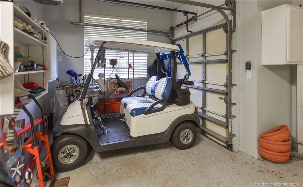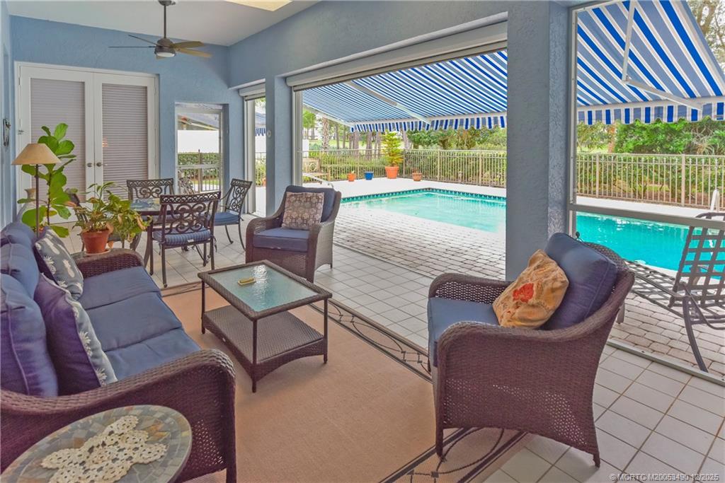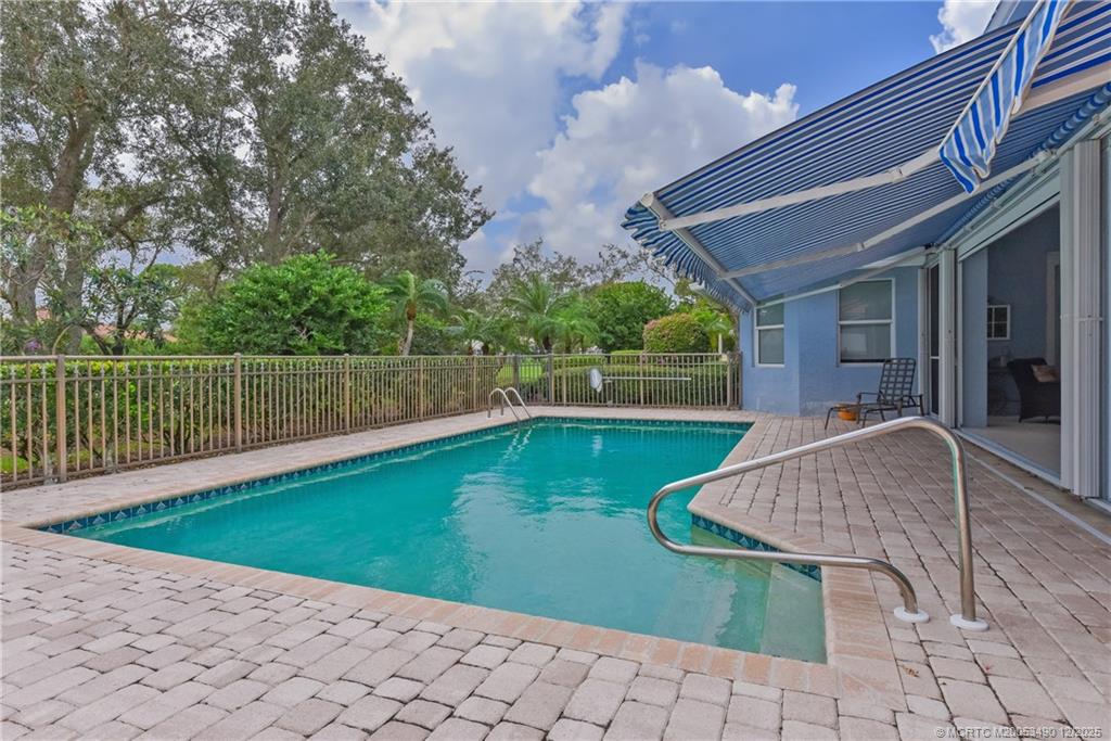The expansive patio features automatic dual awnings and automatic screens and overlooks a sparkling pool with wrought-iron gate and beautiful views of the 9th hole. Inside, soaring ceilings and abundant natural light enhance the refined ambiance. Additional highlights include a two-car garage, separate golf cart garage, and a large walk-in air-conditioned closet in the garage for storage or hobbies.