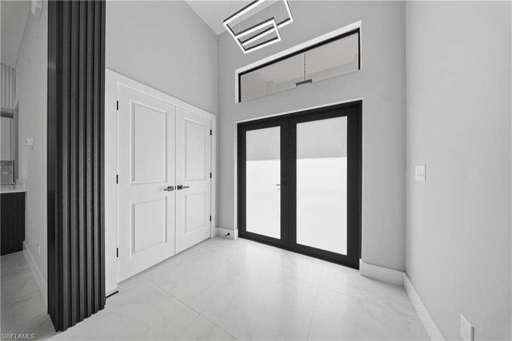 The primary suite offers a spa-like ensuite bathroom with glass shower doors, a double vanity, and two walk-in closets. Additional features include impact windows and doors, and premium finishes throughout.