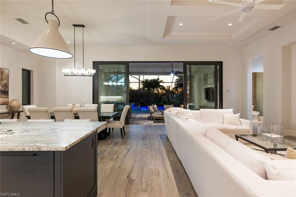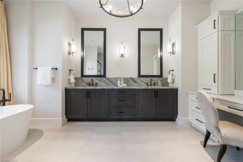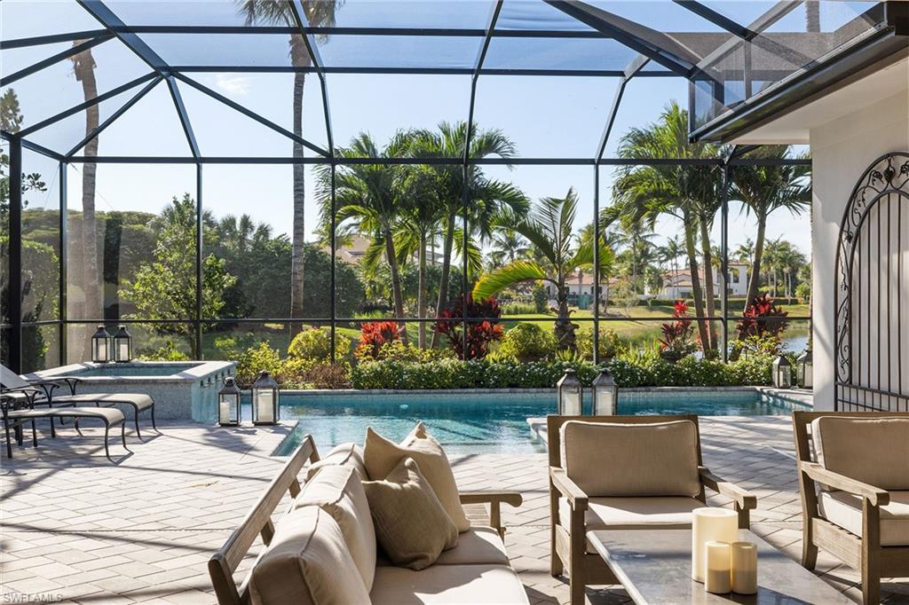Tucked within the gated community of Mediterra, this 2020 London Bay-built residence in the Cabreo enclave captures the essence of refined Florida living. Designed with intention and set against tranquil water views, the home is perfectly positioned for natural light and glowing sunsets from its southwestern exposure. Arriving through glass French doors, guests are welcomed into a thoughtfully curated interior where architectural detail meets modern performance. The open-concept layout is grounded by wood-look tile flooring and solid-core interior doors, while painted ceiling beams and a custom feature wall define the great room. This central space is designed for both quiet evenings and indoor-outdoor entertaining, opening to a terrace through expansive sliding doors. At the heart of the home, the kitchen balances elegance with functionality: paneled Sub-Zero refrigeration, a Wolf gas cooktop with double wall ovens, a Miele dishwasher, and leather-finish granite surfaces support culinary endeavors. The island anchors the space, framed by soft-close cabinetry, reverse-osmosis water filtration, and a Uline wine cooler. The primary suite serves as a retreat, with double tray ceilings and private access to the pool terrace. Its bath is designed with dual vanities, a central vanity, a frameless glass shower with multiple spray options, and a sculptural soaking tub. The walk-in closets are customized for organization and scale. The outdoor living area elevates the experience further: motorized roll-down screens, a saltwater pool and spa with sunshelf, and a fully equipped outdoor kitchen—complete with granite counters, built-in gas Wolf grill, a sink, and refrigeration—invite year-round use. A detached casita with a private bath provides guest accommodations, while additional features include impact-rated windows, a Generac generator, integrated sound system, landscape lighting, and an air-conditioned three-car garage with insulated doors and epoxy flooring. Have it in the award-winning community of Mediterra. Enjoy your toes in the sand and golden sunsets at Mediterra's fully renovated private Beach Club along the Gulf. Imagine arriving to have your car valet-parked and lounge chairs and umbrellas waiting for your arrival or set up upon your request. With 10, 000 square feet of space, the upper level offers indoor and alfresco dining, a full bar, swimming pool along with lockers and dressing areas for changing. Spend the day and enjoy dinner while watching the sunset in the distance. In the award-winning community of Mediterra, where you can have it all with 36 holes of Tom Fazio championship golf, Har-Tru tennis courts, pickleball, bocce and a private beach club!