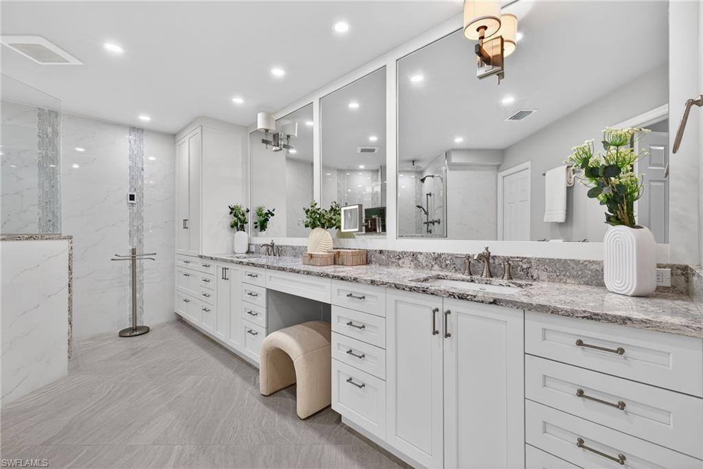 Stunning 18th floor penthouse comprising nearly 3200 square feet of living space. Newly remodeled and upgraded from its original finishes and floorplan, Penthouse E at Grosvenor is a standout beachside property in Pelican Bay. Views to the southwest and Gulf, as well as northwest views taking in the Pelican Bay skyline, capture sunsets and evening lights. Split floor plan offers privacy for the primary suite and guests. Trams to the beach and Pelican Bay dining and amenties are accessed steps away from the building. Ideally Located at the southern end of Pelican Bay Boulevard, the Waterside Shops and restaurants, Artis museum and philharmonic are just two minutes from the front door. Offered at an exceptional price and move in ready for the 2026 Season!