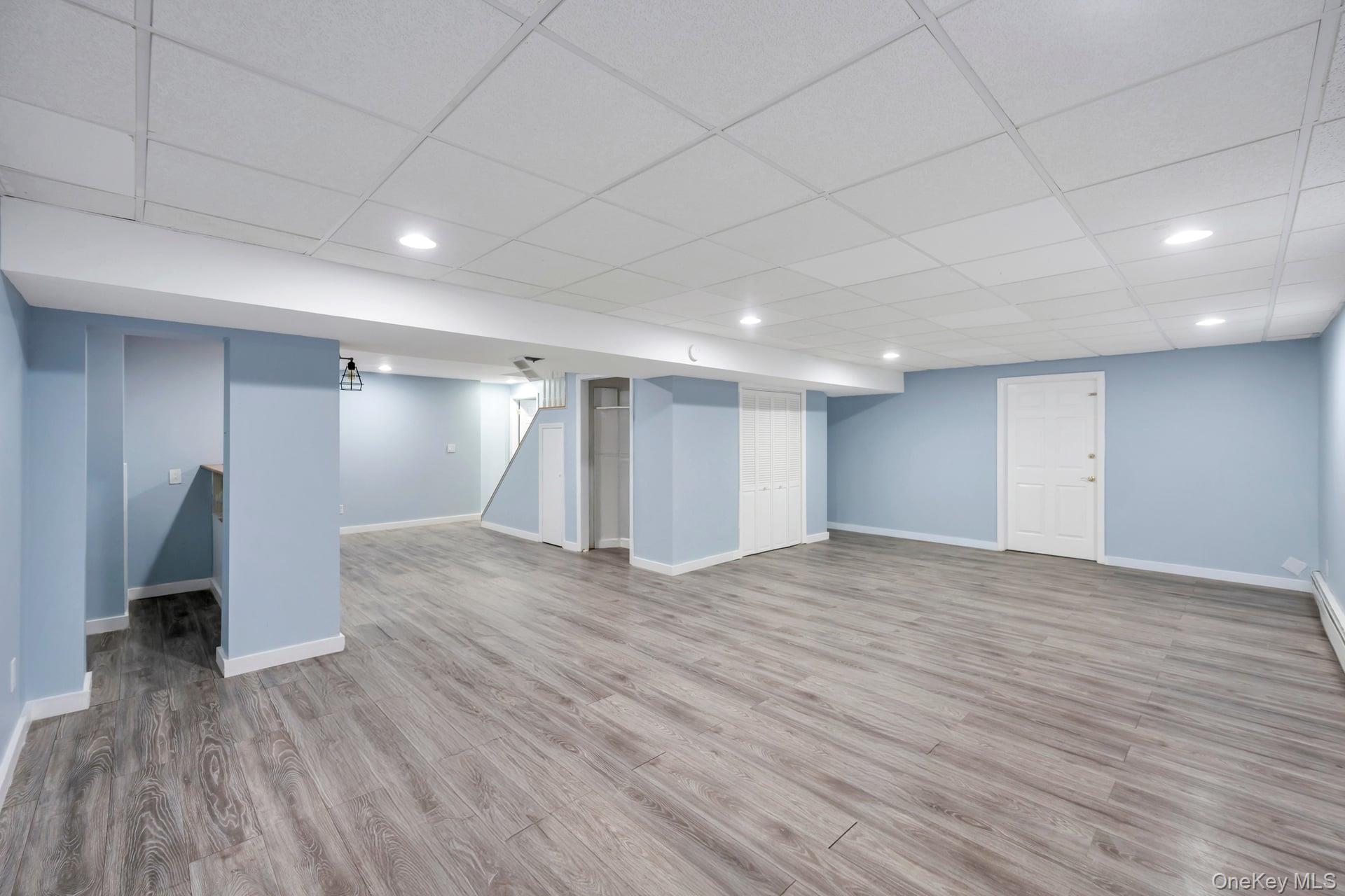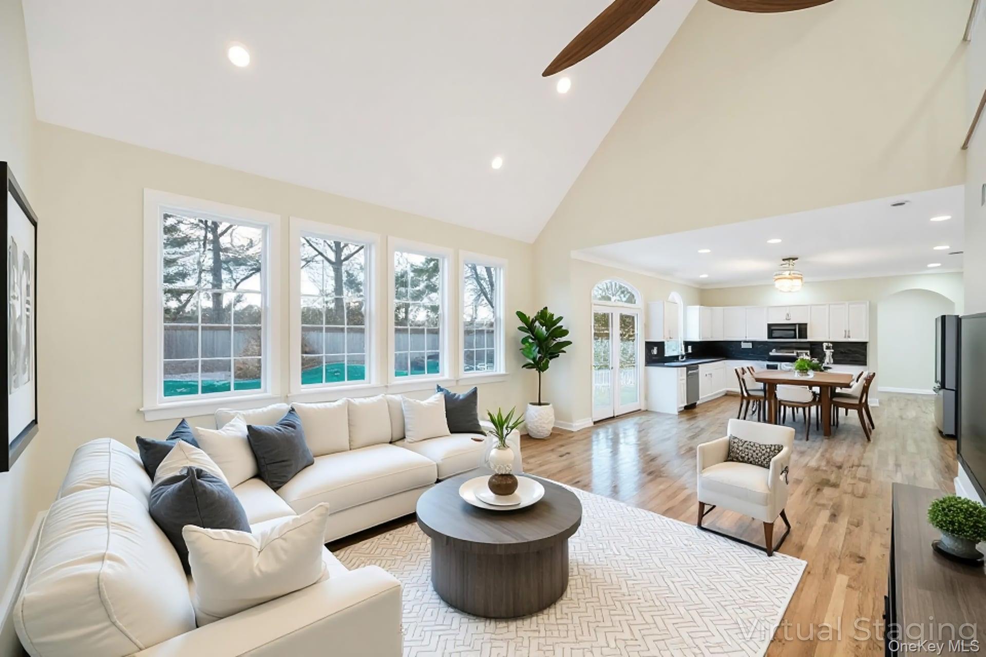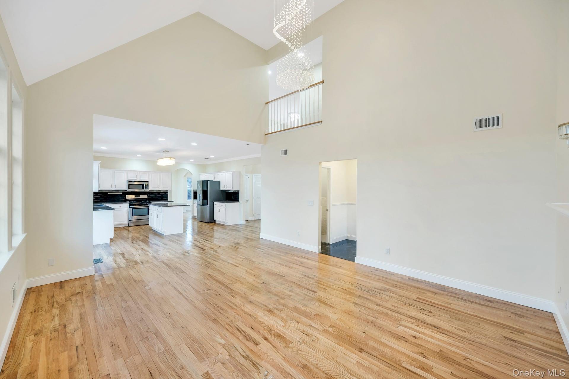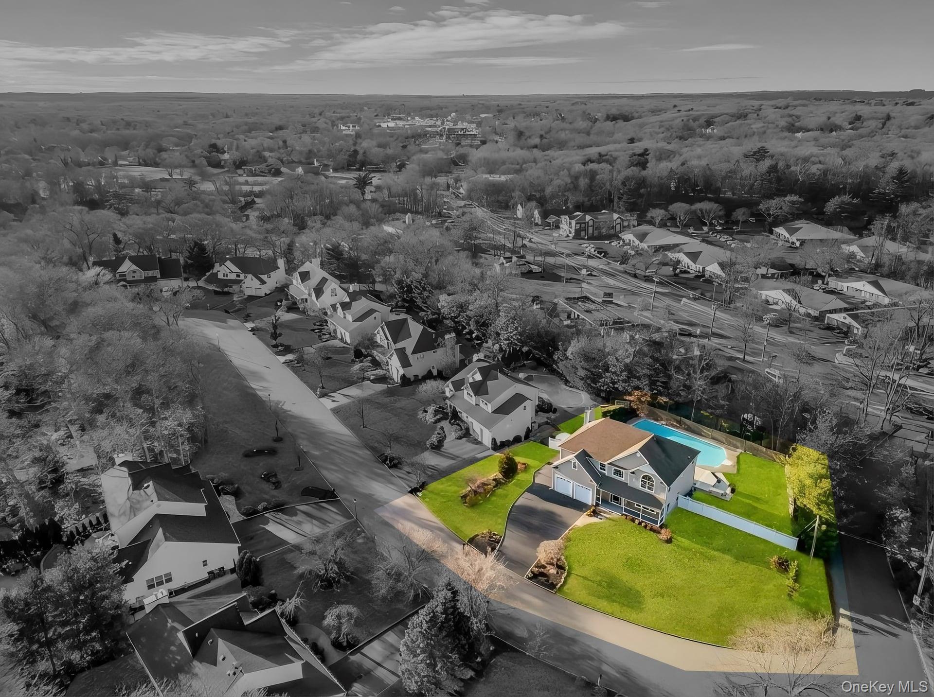 An incredible opportunity to own a magnificent newer-built Colonial tucked away on a quiet cul-de-sac in the highly desirable Smithtown School District, offering the perfect blend of luxury, scale, and lifestyle, highlighted by two brand new Central AC units, a brand new gas boiler and connected to public sewer for total peace of mind; this home commands attention from the moment you arrive with an expanded blacktop driveway framed by Belgium block, additional side parking ideal for a boat or RV, professionally manicured and landscaped grounds, white PVC fencing, stone accents, partial front facade, pristine vinyl siding, and a stunning covered front porch finished with Trex decking, all set on an oversized corner lot that opens to a true resort-style backyard featuring an inground swimming pool with a brand new liner installed in August, an expansive deck built for entertaining, and a rollout awning perfect for summer gatherings. As you enter the grand two-story entry you’re immediately welcomed by a bright, open layout where the entire home has been freshly painted, hardwood floors have been beautifully refinished, recessed lighting and custom moldings elevate every space, and the show-stopping chef’s kitchen anchors the home with white cabinetry accented by gold hardware, black tile backsplash, granite countertops, stainless steel appliances, gas cooking, an LG smart refrigerator with water and ice, an oversized center island crowned by a gold glass chandelier, and a French slider that flows effortlessly to the backyard and into the dramatic den and great room showcasing soaring vaulted ceilings, a wood-burning fireplace with custom tile and white wood mantle, and walls of windows that flood the space with natural light; the first floor is completed by a formal living room with crown molding and recessed lighting, a spacious dining room designed for gatherings, a striking powder room with white vanity, quartz countertop, and smart mirror, plus a functional mudroom with LG front-loading washer and dryer and its own entrance; upstairs, an elegant open catwalk overlooks the den and great room below, creating architectural drama and visual connection, while the enormous primary suite stands on its own with vaulted ceilings, floor-to-ceiling windows, recessed lighting, beautiful hardwood floors, two oversized walk-in closets, and a spa-like primary bath featuring vaulted ceilings, soaking tub, glass shower, brand new double white vanity, smart mirrors, and new flooring, complemented by additional generously sized bedrooms with ceiling fans and abundant closet space and a fully renovated hallway bath offering spa lighting, a tub with glass shower enclosure, new blue vanity, quartz countertop, and smart mirror; the finished basement completes the home with high ceilings, recessed lighting, a freshly painted bar with wood countertops, a modern spa-style half bath with floor-to-ceiling tile, and extensive storage throughout, making this a rare luxury offering that delivers space, design, and lifestyle at every turn.
