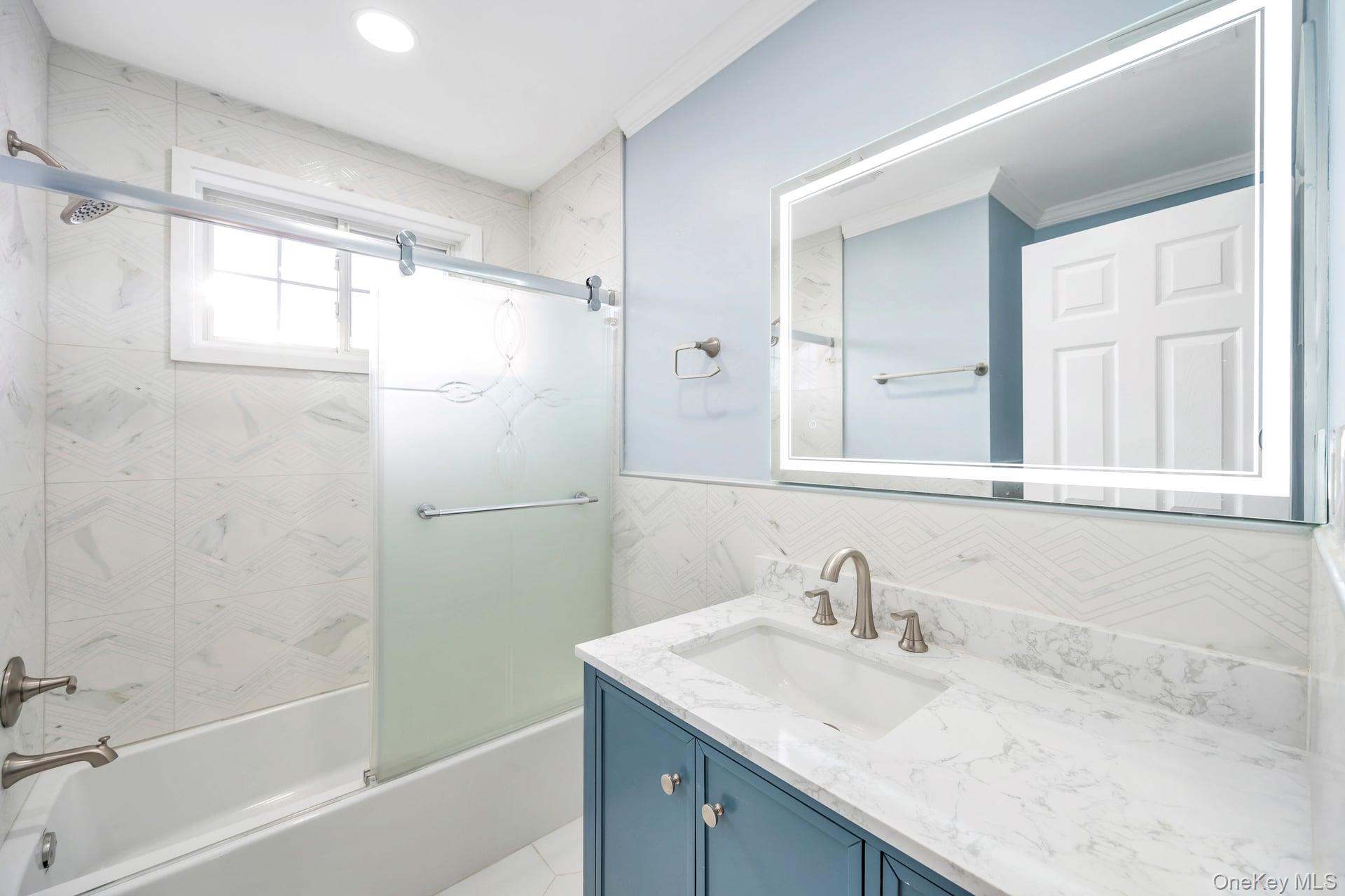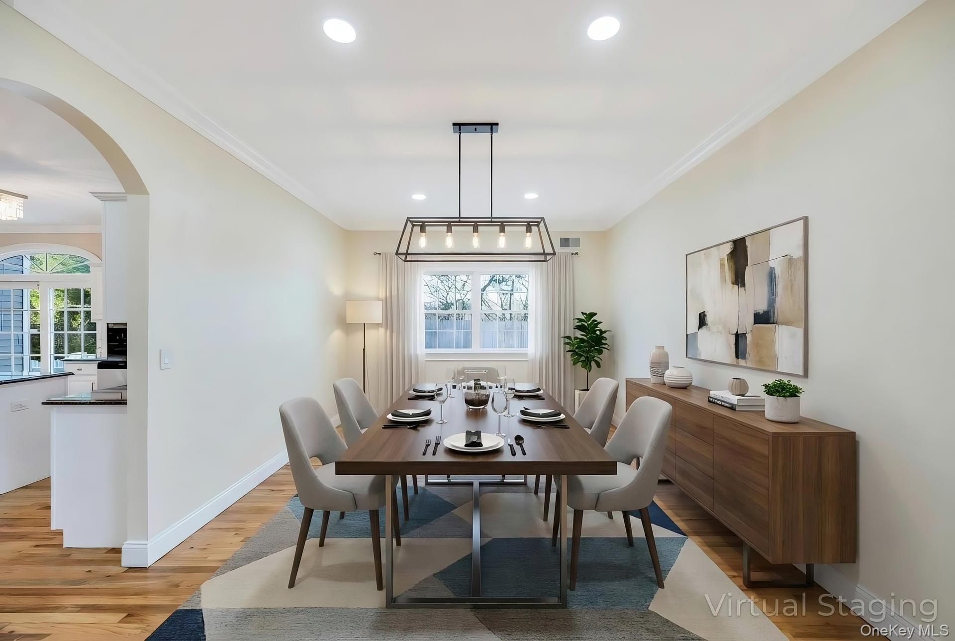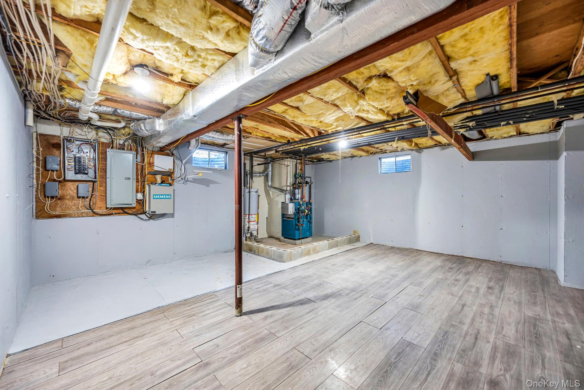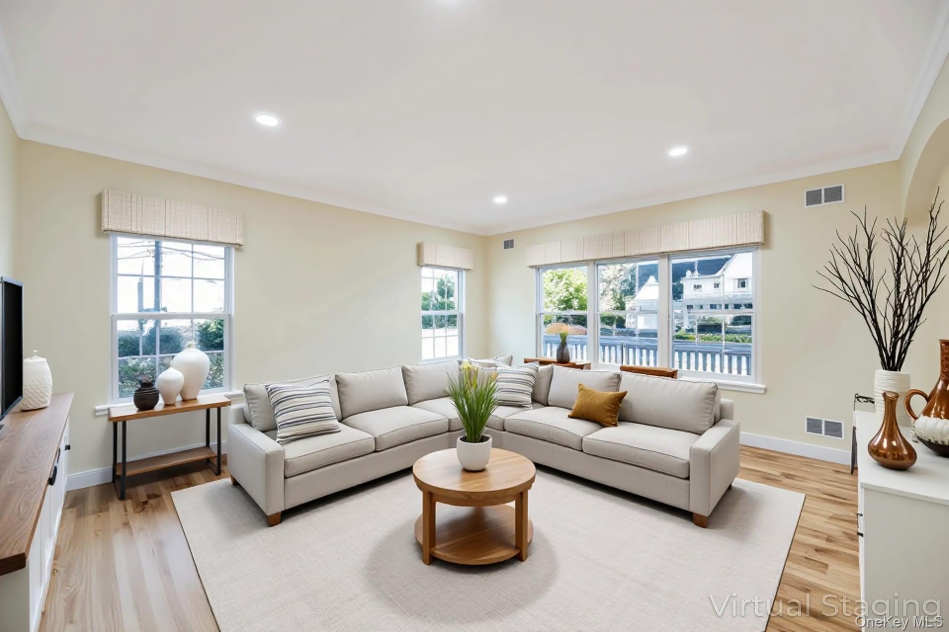 An incredible opportunity to own a magnificent newer-built Colonial tucked away on a quiet cul-de-sac in the highly desirable Smithtown School District, offering the perfect blend of luxury, scale, and lifestyle, highlighted by two brand new Central AC units, a brand new gas boiler and connected to public sewer for total peace of mind; this home commands attention from the moment you arrive with an expanded blacktop driveway framed by Belgium block, additional side parking ideal for a boat or RV, professionally manicured and landscaped grounds, white PVC fencing, stone accents, partial front facade, pristine vinyl siding, and a stunning covered front porch finished with Trex decking, all set on an oversized corner lot that opens to a true resort-style backyard featuring an inground swimming pool with a brand new liner installed in August, an expansive deck built for entertaining, and a rollout awning perfect for summer gatherings. As you enter the grand two-story entry you’re immediately welcomed by a bright, open layout where the entire home has been freshly painted, hardwood floors have been beautifully refinished, recessed lighting and custom moldings elevate every space, and the show-stopping chef’s kitchen anchors the home with white cabinetry accented by gold hardware, black tile backsplash, granite countertops, stainless steel appliances, gas cooking, an LG smart refrigerator with water and ice, an oversized center island crowned by a gold glass chandelier, and a French slider that flows effortlessly to the backyard and into the dramatic den and great room showcasing soaring vaulted ceilings, a wood-burning fireplace with custom tile and white wood mantle, and walls of windows that flood the space with natural light; the first floor is completed by a formal living room with crown molding and recessed lighting, a spacious dining room designed for gatherings, a striking powder room with white vanity, quartz countertop, and smart mirror, plus a functional mudroom with LG front-loading washer and dryer and its own entrance; upstairs, an elegant open catwalk overlooks the den and great room below, creating architectural drama and visual connection, while the enormous primary suite stands on its own with vaulted ceilings, floor-to-ceiling windows, recessed lighting, beautiful hardwood floors, two oversized walk-in closets, and a spa-like primary bath featuring vaulted ceilings, soaking tub, glass shower, brand new double white vanity, smart mirrors, and new flooring, complemented by additional generously sized bedrooms with ceiling fans and abundant closet space and a fully renovated hallway bath offering spa lighting, a tub with glass shower enclosure, new blue vanity, quartz countertop, and smart mirror; the finished basement completes the home with high ceilings, recessed lighting, a freshly painted bar with wood countertops, a modern spa-style half bath with floor-to-ceiling tile, and extensive storage throughout, making this a rare luxury offering that delivers space, design, and lifestyle at every turn.