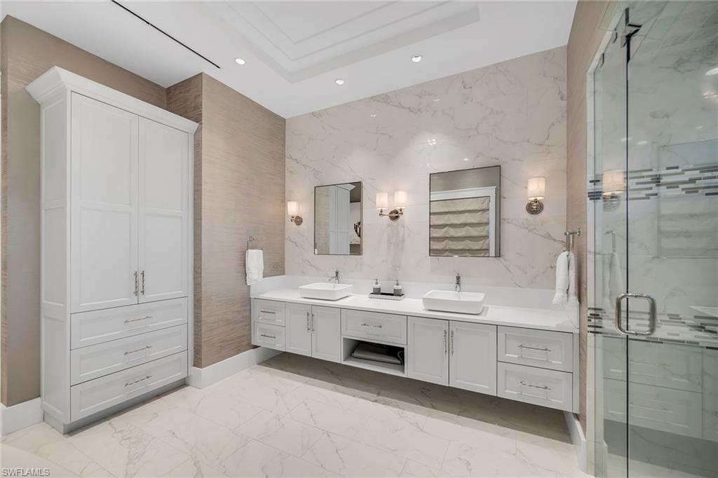 In Mangrove Bay, this exceptional waterfront residence delivers the ultimate Naples boating lifestyle with a private dock featuring a 38-foot boat slip and 30, 000-pound boat lift, an attached guest house and negotiable furnishings, creating a rare opportunity. Thoughtfully designed across two stories, the home offers four bedrooms, 4. 5 baths, with a two-car garage, blending refined coastal architecture with seamless indoor-outdoor living in one of downtown Naples desirable enclaves. The exterior showcases a paver driveway, impact-resistant windows and doors, and electric hurricane shutters and screens on the lanai for peace of mind. Inside, ceiling accents, recessed LED lighting, ceiling fans, wood and tile flooring, a Crestron whole-home automation system, and a Navien tankless water heater reflect a commitment to comfort, efficiency and modern luxury. The living room is anchored by a striking three-panel glass slider that opens fully to the screened lanai, creating a fluid connection to the pool and patio beyond. The chef’s kitchen is elegant and functional, featuring white cabinetry, a tile backsplash and a generous three-seater island illuminated by glass pendant lighting. Premium stainless steel appliances include a Wolf six-burner gas cooktop, steam oven and built-in microwave, a panel-ready Sub-Zero refrigerator and a panel-ready Asko dishwasher, making the space ideal for daily living and entertaining. The primary suite offers a private retreat with French doors opening directly to the pool, a spacious walk-in closet, and a spa-inspired en-suite bath appointed with white cabinetry, dual vanities, a walk-in shower with frameless glass doors and floor-to-ceiling tile, and a relaxing soaking tub. Guest accommodations include a vaulted-ceiling guest suite with French doors to a balcony and a private en-suite bath, an additional guest bedroom with a nearby bath featuring a tub-shower combination, and a second-floor wet bar that enhances entertaining. The attached guest house provides exceptional privacy, offering its guest bedroom with French doors to a balcony and an en-suite bath with a walk-in shower with a glass door and floor-to-ceiling tile. A well-equipped laundry area includes Whirlpool front-load washer and dryer for everyday convenience. Outdoor living is a highlight, featuring a saltwater pool that has been recently acid-washed, a hot tub, wading pool and outdoor fireplace, and a fully equipped outdoor kitchen, ideally suited for waterfront entertaining. Residents also enjoy access to Mangrove Bay’s amenities, including a clubhouse, fitness center and community gym, along with shared, air-conditioned locked storage for kayaks, paddleboards and bikes, completing a lifestyle defined by luxury and effortless coastal living. Ideally a short distance to Baker Park and Gordon River Greenway, and less than a mile from Fifth Avenue South’s renowned restaurants.