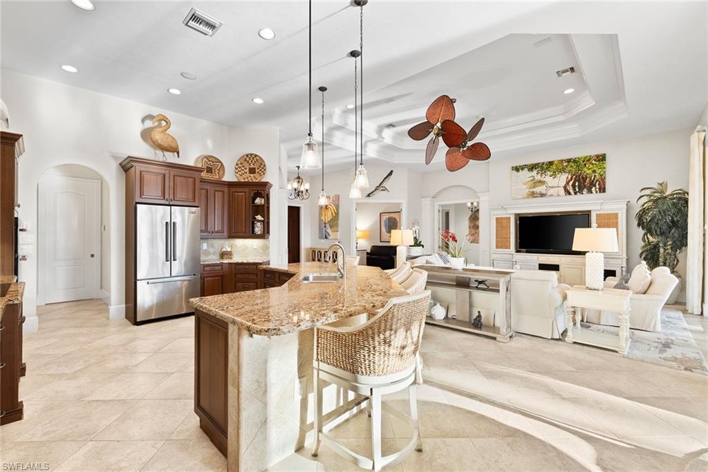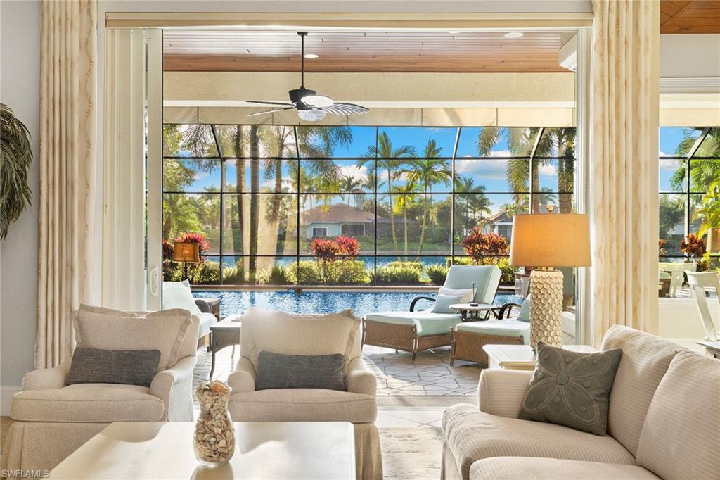 Welcome to the private guard-gated Classics Plantation Estates, where refined luxury meets effortless Florida living in the heart of Lely Resort, complete with immediate membership to The Player’s Club & Spa. Set on one of the largest and most private lakefront homesites in the Classics, this remarkable . 51-acre estate is surrounded by lush, mature palms and trees, offering an unparalleled sense of space, serenity and complete privacy. Custom built by Lundstrom Homes, this exceptional three-bedroom-plus-den, three-bath residence is thoughtfully designed with a spacious, open-concept layout that flows seamlessly from indoor elegance to extraordinary outdoor living, making it an entertainer’s dream. A circular drive, oversized three-car garage and impeccable curb appeal set the tone upon arrival. Go outside to a spectacular outdoor retreat. The expansive lanai showcases a resort-style pool measuring an impressive 22-by-44 feet with a 9-foot depth, ideal for swimming, entertaining or simply relaxing beneath the large retractable electric awnings. A custom outdoor kitchen, abundant seating areas, tongue and groove hardwood ceilings and breathtaking sunset lake views create a backdrop for unforgettable evenings. Inside, refined upgrades abound, including plantation shutters, volume ceilings, premium granite finishes, upgraded appliances and spacious bedrooms, which are perfect for hosting. Recent enhancements provide peace of mind, including new water heaters, new washer and dryer, new pool heater, and new roof and gutter systems. Additional features include a side-yard dog run and an oversized three-vehicle garage with one bay measuring 30 feet deep by 10 feet wide by 10 feet high, ideal for larger vehicles or extra storage. In sunny Naples, this home offers convenient access to pristine beaches, world-class dining and shopping, all just minutes from downtown Naples iconic 5th Avenue and 3rd Street districts as well as Marco Island. This is more than a home, it’s a private estate designed for exceptional living, entertaining and unforgettable sunsets.