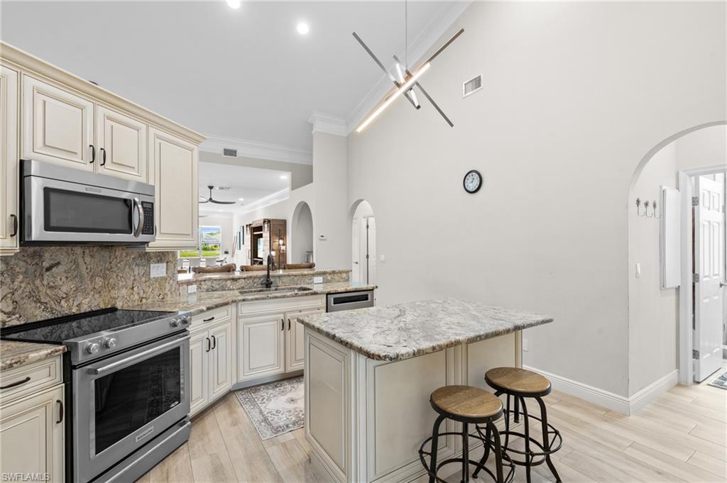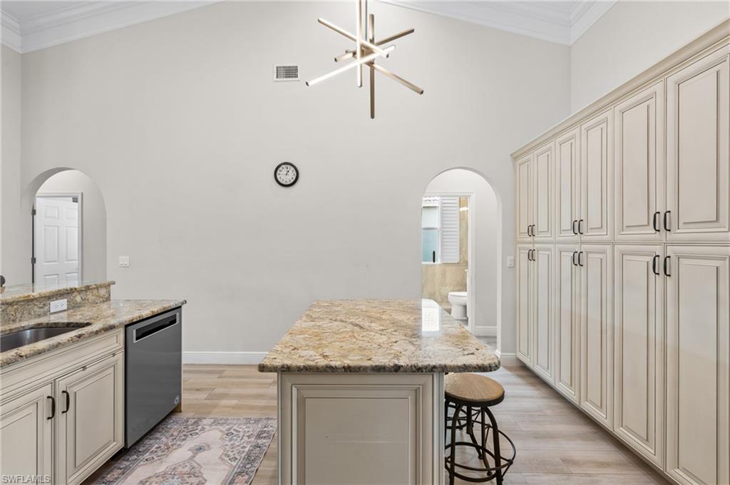 The main living area features soaring cathedral ceilings and elegant crown molding throughout. The spacious kitchen and all three bathrooms have been fully updated, complemented by designer lighting, wood plantation shutters, custom closets, and numerous additional custom upgrades.