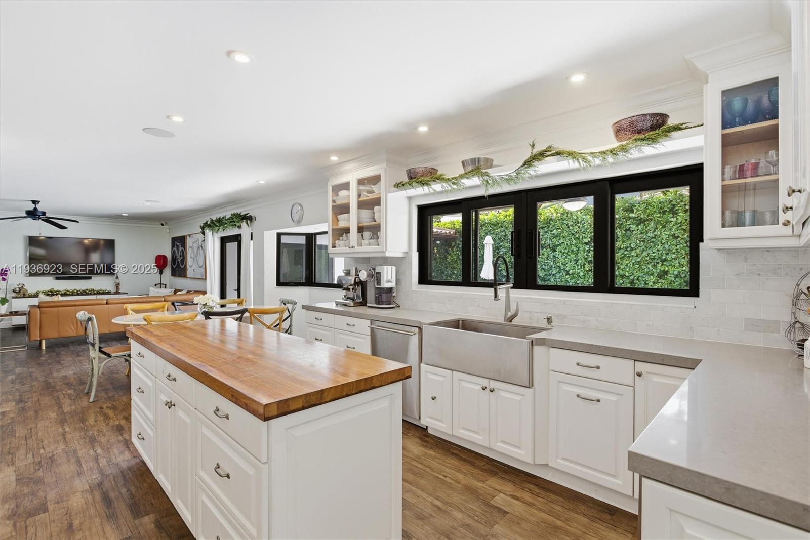 The kitchen showcases a butcher-block island, abundant custom cabinetry, and serene pool views—perfect for both everyday living and entertaining. The primary suite and three additional bedrooms are located on one wing of the home, while a private two-bedroom, one-bath suite on the opposite side offers flexible living options for guests, extended family, or a home office.