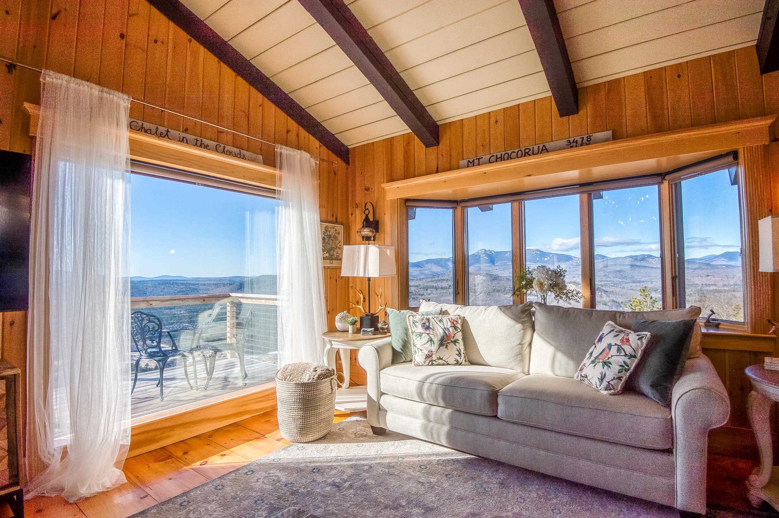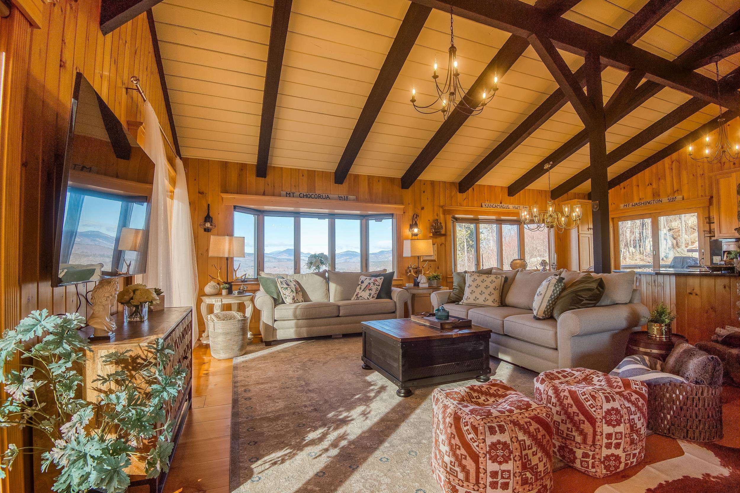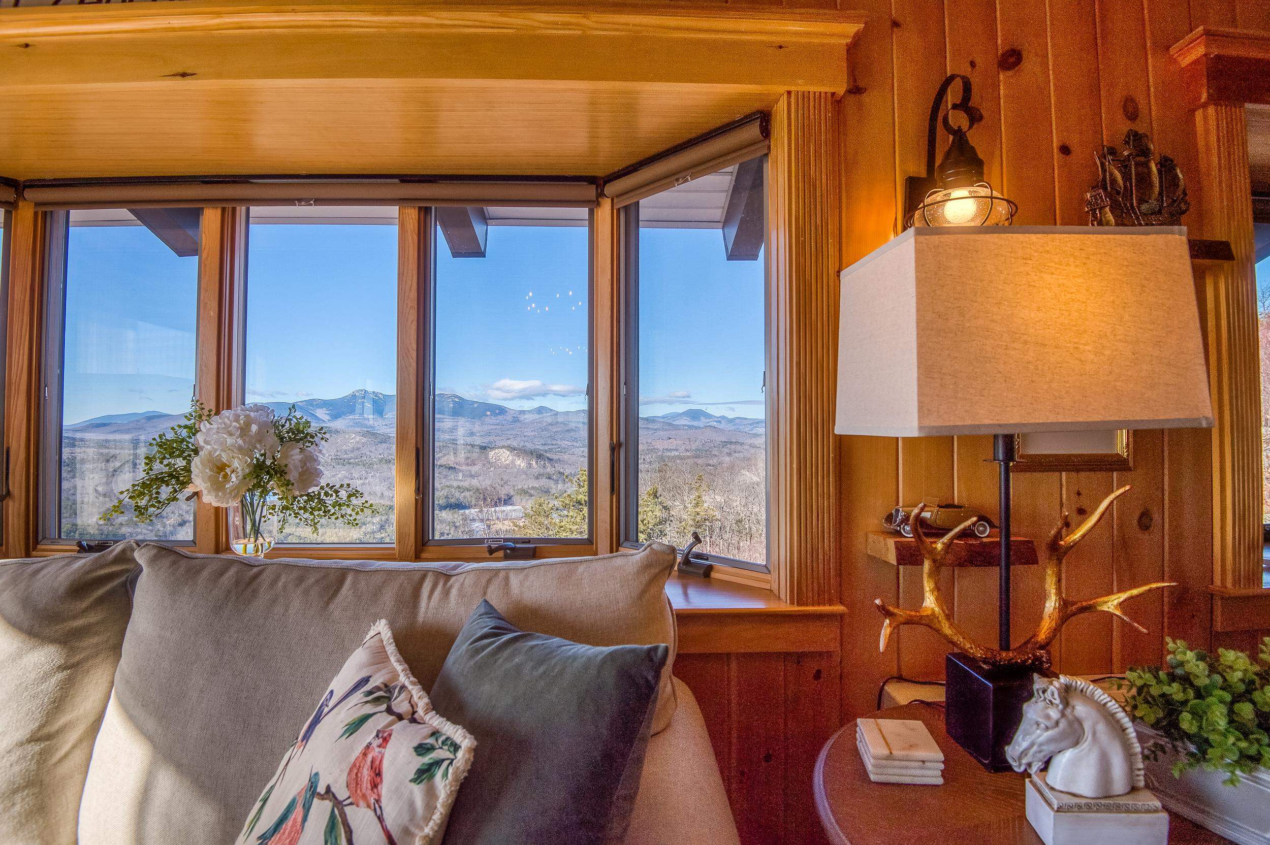 Welcome to Kailasa - The Chalet in the Clouds! Perched atop Oak Ridge Road in the desirable lake access Eidelweiss neighborhood of Madison, this striking multi-level retreat commands breathtaking, 270 degree panoramic views of New Hampshire’s White Mountains. Expansive bay windows, a slider onto the deck, and dual picture windows on the main level flood this home with natural light while framing spectacular mountain vistas from the kitchen, dining area, living room, and custom bar—perfectly complementing the home’s rustic mountain charm while providing powerful and profound scenery in all four seasons. Downstairs there are four bedrooms including an oversized primary bedroom suite, three of which have impressive views of their own. Recently featured in Vogue and Boston Uncovered, this property has received an array of updates in recent years including a new metal roof, heating and cooling system, renovated kitchen, bathrooms, electrical and plumbing. Located in the heart of ski country, North Conway is a mere 15 minute drive and is sure to keep you and all of your guests busy with some of the finest skiing, fly fishing, rock climbing and mountain biking in the Northeast. Impeccably maintained, tastefully furnished, and move-in ready, this exceptional property invites you to relax, recharge, and soak in the views at 80 Oak Ridge Road. OPEN HOUSES SATURDAY 01/03 AND SUNDAY 01/04 BOTH NOON TO 3PM.