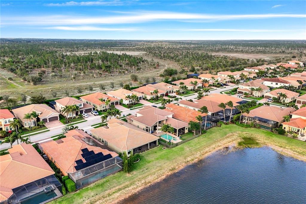 This highly sought-after Carlyle model boasting 3 bedrooms, a den, 3. 5 bathrooms, and a 3-car garage is a rare find, offering exceptional value in one of Riverstone's most coveted locations. Developer-priced as one of the most expensive lots in the community, this home sits in the prime position, providing an unparalleled living experience. Enter through the private courtyard into a harmonious blend of traditional and modern luxury, with floor-to-ceiling glass walls framing breathtaking lake views. An expansive, fully roofed 843 sq. ft. lanai is the perfect space for both relaxation and entertaining featuring North/South orientation to avoid the harsh morning and evening sun, this home enjoys a more comfortable year-round climate. The gourmet chef’s kitchen is equipped with a center island, Level VI cabinetry, a matching granite backsplash and GE Monogram appliances. The highly upgraded home features extensive decorative millwork, including a custom entertainment center, solid core doors, Hunter Douglas blinds, luxurious drapery and wet bar. The luxurious primary suite features panoramic lake views, a cozy sitting area, and custom built his-and-her closets, along with a beautifully appointed bath that ensures relaxation and comfort. The multi-functional club room, perfect as an office, 4th bedroom, or additional living room, offering versatility to suit your needs. Impact-resistant doors and windows throughout for safety and efficiency, and an automatic Storm Smart screened patio for additional outdoor comfort. An upgraded high-efficiency AC system with a heat pump, and a Generac KW24 generator to power multiple appliances simultaneously, providing peace of mind during power outages. Custom stone planters and a travertine stone front elevation offer a refined first impression. Riverstone offers a truly unique lifestyle for its residents, providing access to a wide range of resort-style amenities including state-of-the-art clubhouse, resort-style pool and lap pool, hot tub and kids' water park, 5 Har-Tru tennis courts, basketball, pickleball courts, tot lot, indoor sports court, social rooms, billiards room, dance studio, and fitness center. The community is located within an A-rated school district, ensuring top-tier education. Conveniently located just minutes from I-75, fine dining, shopping, and beautiful beaches, providing the perfect balance of tranquility and convenience. This home is a true gem, offering luxurious features, a functional design, and access to incredible community amenities. Schedule a private showing today!
