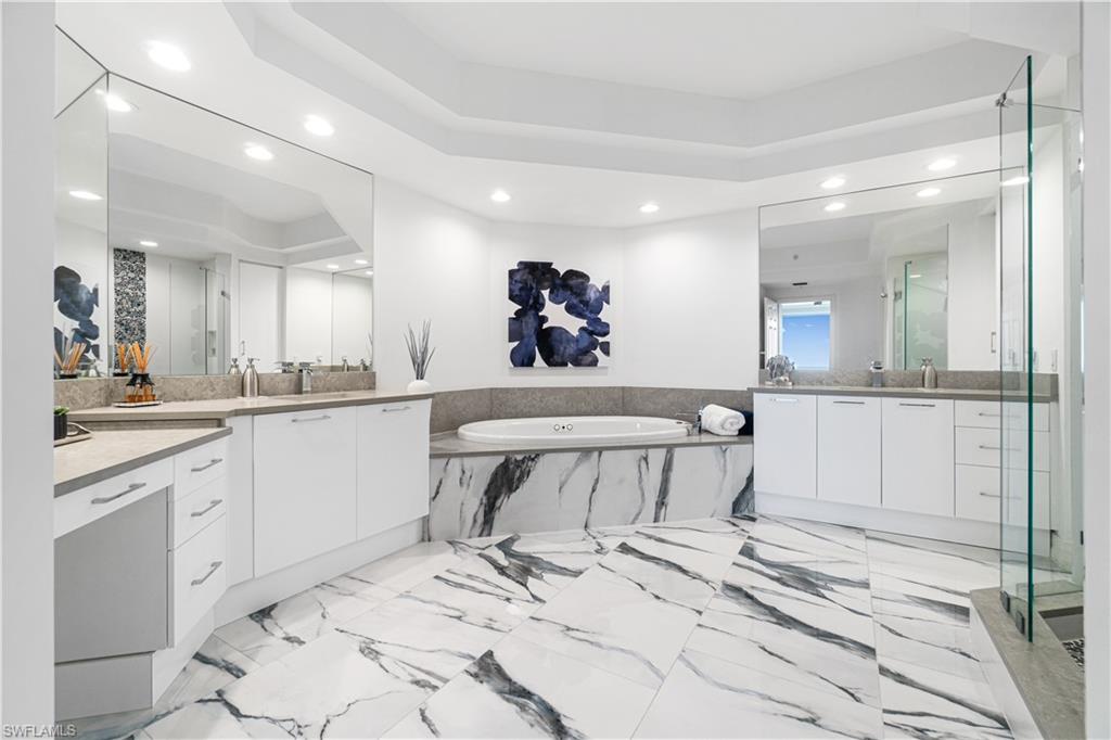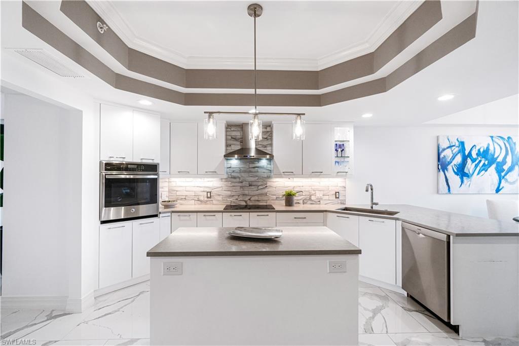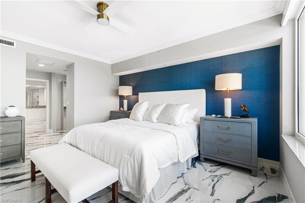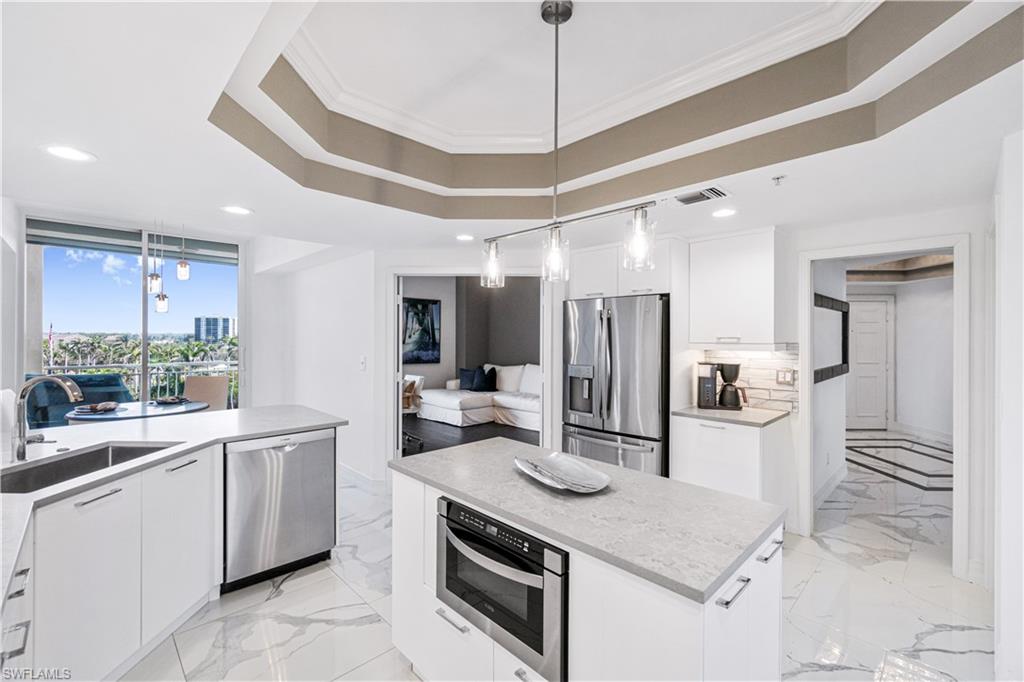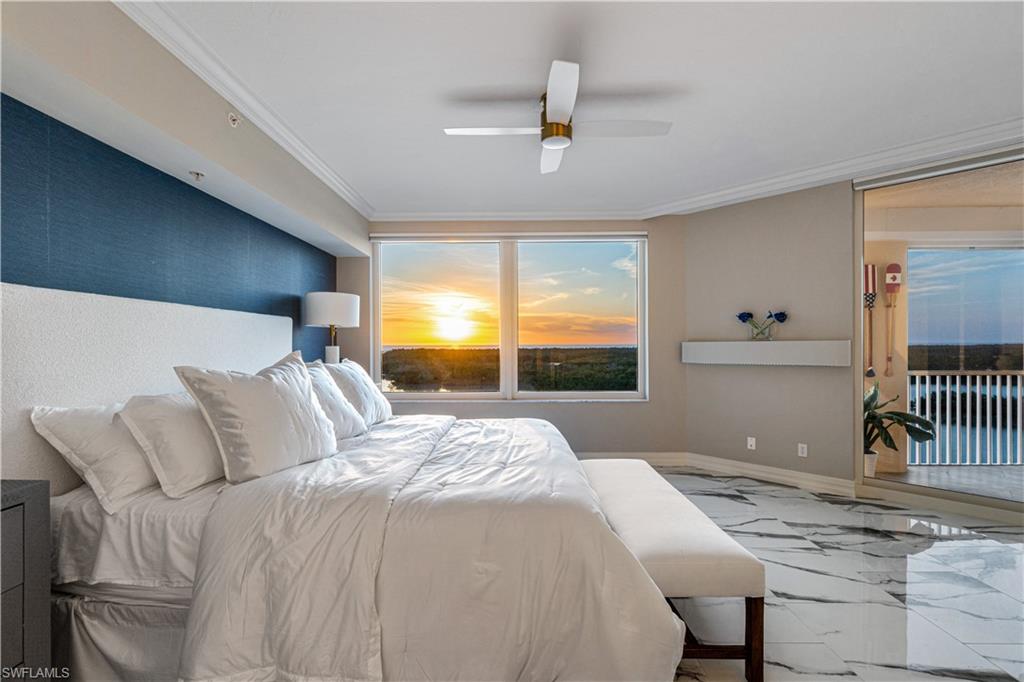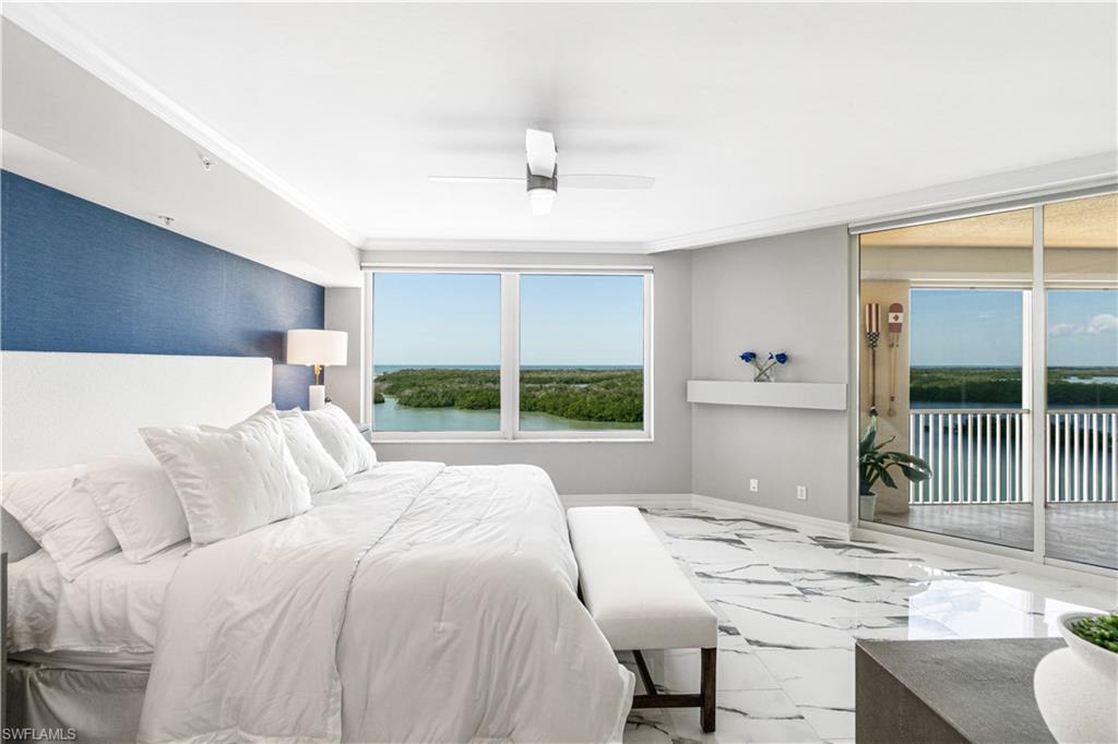 Beautifully remodeled 7th floor condo offering spectacular views of the Bay and Gulf, located in the highly sought-after Pelican Isle. Indulge in breathtaking sunsets and sunrises from your spacious lanais. This property is a true paradise for beach and boating enthusiasts, situated on Wiggins Pass with direct Gulf-access and no bridges. Pelican Isle provides boat slips and lifts for vessels up to 55 feet, as well as a convenient beach shuttle for easy access to the shore (multiple slips currently available!) This unit has been meticulously upgraded with high-end features and finishes including new sleek white porcelain tile, oak flooring in the den and guest bedroom, and a fully renovated kitchen and bathrooms. Additional features include hurricane impact windows/sliders throughout, new HVACs (2024), and automated blinds. This exquisite residence features 2, 677 square feet of living space, including an open-concept floor plan, three spacious bedrooms, three bathrooms, and dual balconies. The spacious primary suite offers mesmerizing water views and a spa-like bathroom with dual vanities, a frameless glass shower enclosure, and a separate jetted soaking tub. Relax and unwind on your screened-in lanai, where you can enjoy the natural beauty of Southwest Florida, from the diverse wildlife to the dolphins and manatees gliding through the bay. Pelican Isle has a separate private Yacht Club membership available, ranked as one of the Top 50 Platinum Yacht Clubs in the world, granting access to endless boating opportunities, fine dining, fitness facilities, social activities, tennis, pickleball, and bocce courts. Residents also enjoy two pools with spas, a bike storage area, air-conditioned personal storage units, and secure, gated entry with 24/7 camera surveillance. The condo comes with assigned covered parking, guest parking, and a car wash area, as well as a newly renovated lobby and hallways. Located just minutes from Southwest Florida’s finest beaches—Vanderbilt Beach and Barefoot Beach—as well as premier shopping and dining at Mercato, Waterside Shops, and Naples’ iconic 5th Avenue, this residence offers easy access to both RSW and Naples airports.