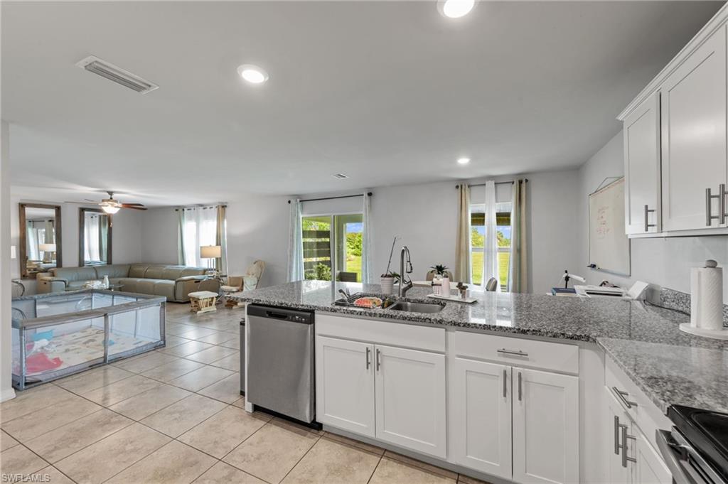 Welcome to this charming and versatile home in a great Cape Coral location. Built in 2022 on a spacious . 23-acre lot, this 1, 617 sq ft property offers the perfect blend of modern comfort and prime convenience. The open floor plan features 3 bedrooms and 2 bathrooms, with neutral toned tile flooring flowing throughout the main living areas. The kitchen is a true highlight, boasting white cabinetry, granite countertops, and stainless steel appliances. A dining area provides seamless access to the covered back patio with pavers, while the private backyard offers