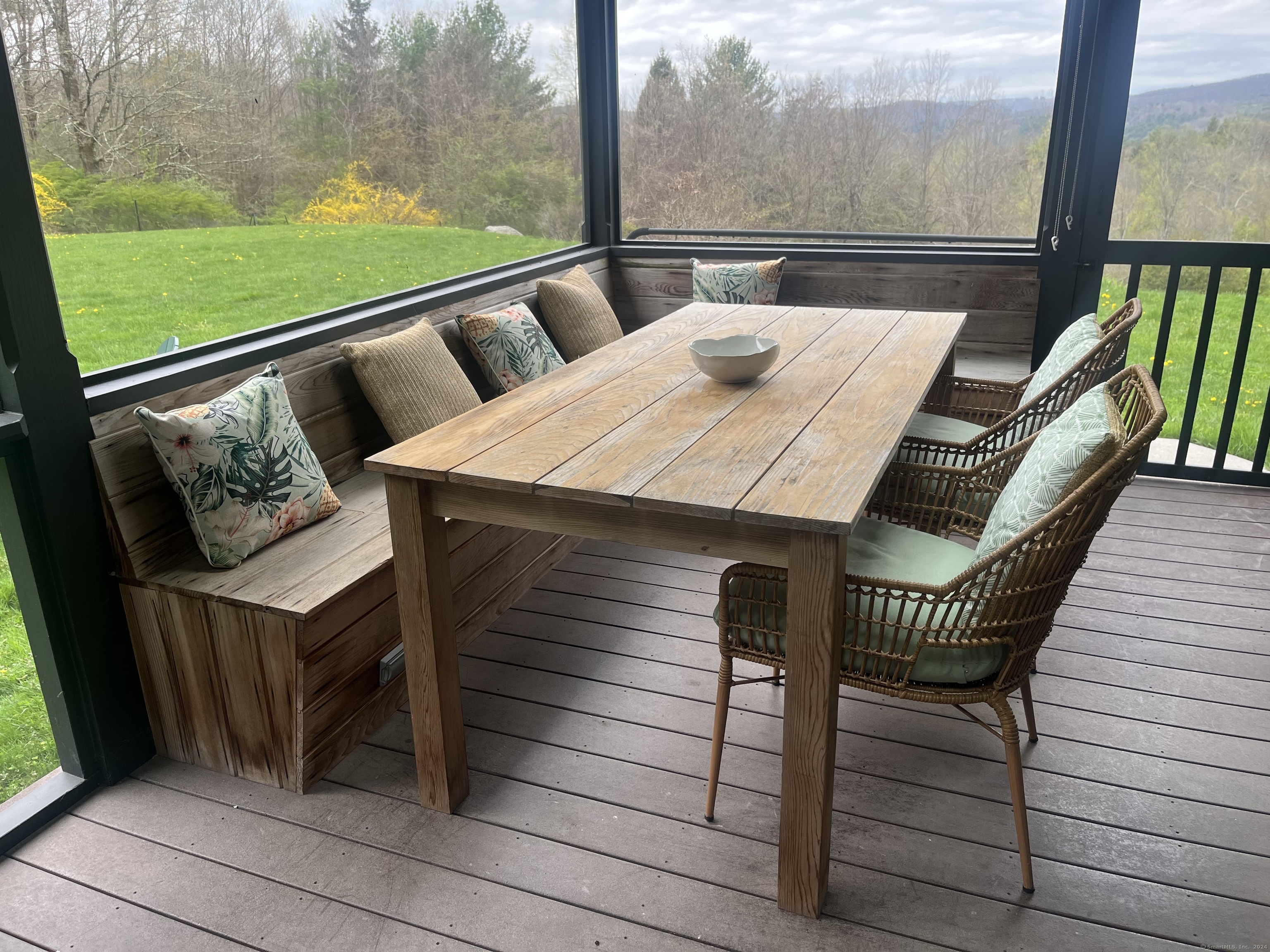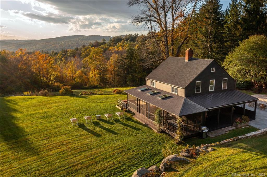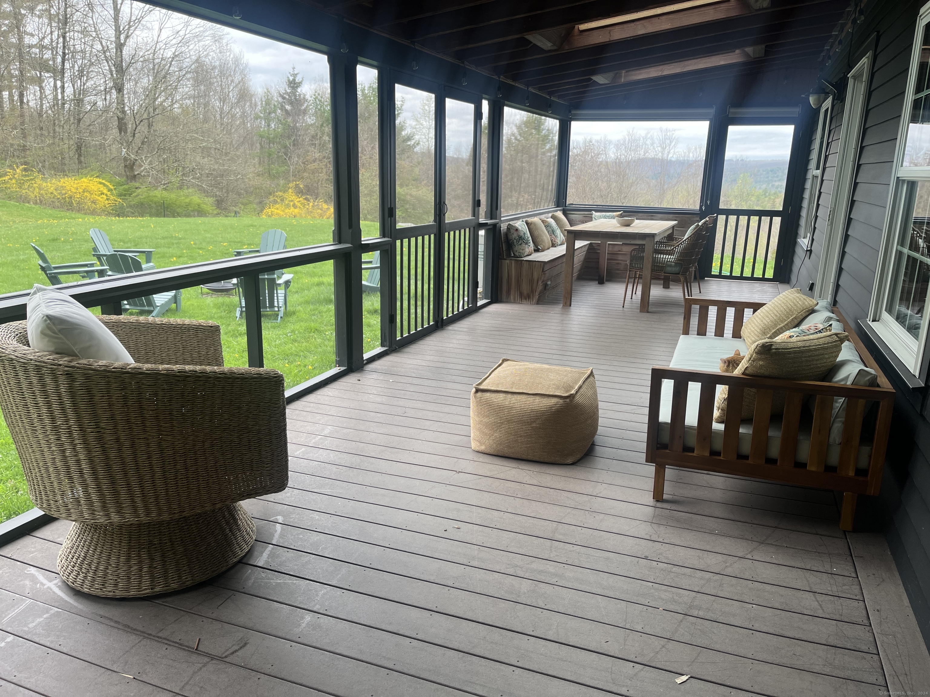 "Olive Farm" is a recently renovated farmhouse style cottage with long range Western sunset views of the Housatonic River Valley. The home sits on 6 open, manicured acres and is located less than a mile from Mohawk Mountain Ski Area. Hardwood flooring, built-ins, and great natural light are present throughout the home. Enter into the kitchen equipped with black walnut countertops, a gas range stove and breakfast bar area. The adjacent dining room features plenty of built-in storage and an 8 person table. Sunlight fills the living room through a glass door leading to the screened-in porch, and through a large row of windows offering amazing views of the surrounding mountains. A cozy den with a pull-out sofa for guests connects the living room and main level en-suite bedroom, complete with a recently remodeled full bath. The second floor consists of a large primary bedroom with the same stunning Western views, a 10x8 room that could function as closet space or an office, and an additional bedroom with two full sized beds. A full hallway bathroom accommodates the upper level. The tranquility of Cornwall, CT can be enjoyed year round from the 60 ft. long wrap around porch, the large and flat yard, or the beautiful new bluestone patio. Shopping and dining in nearby Kent, Sharon, Litchfield, and New Preston can be reached in 20 minutes or less. Only 30 min to Metro North trains and 2 hrs by car to Manhattan! Available March 1 - April 15, 2026.