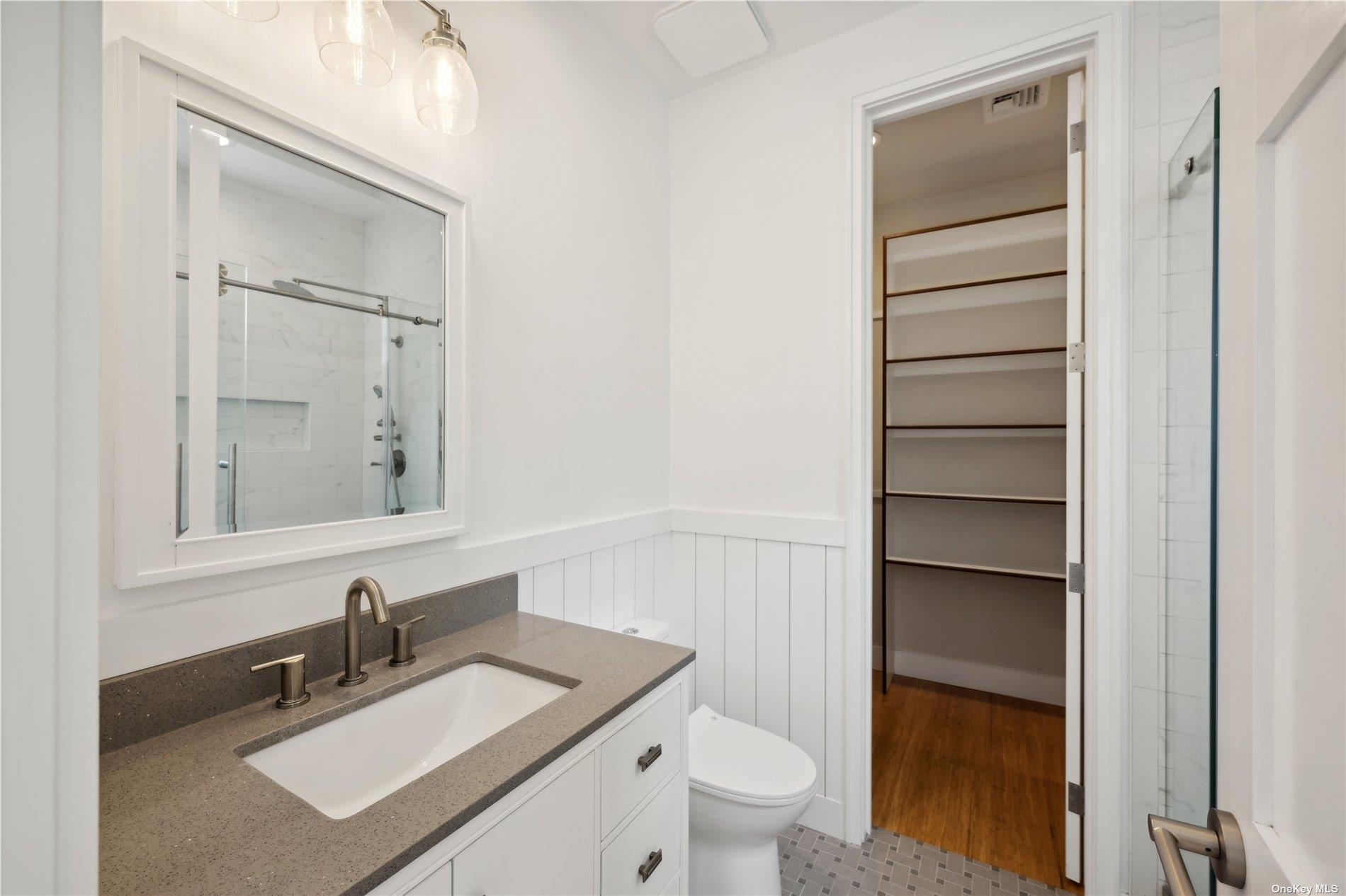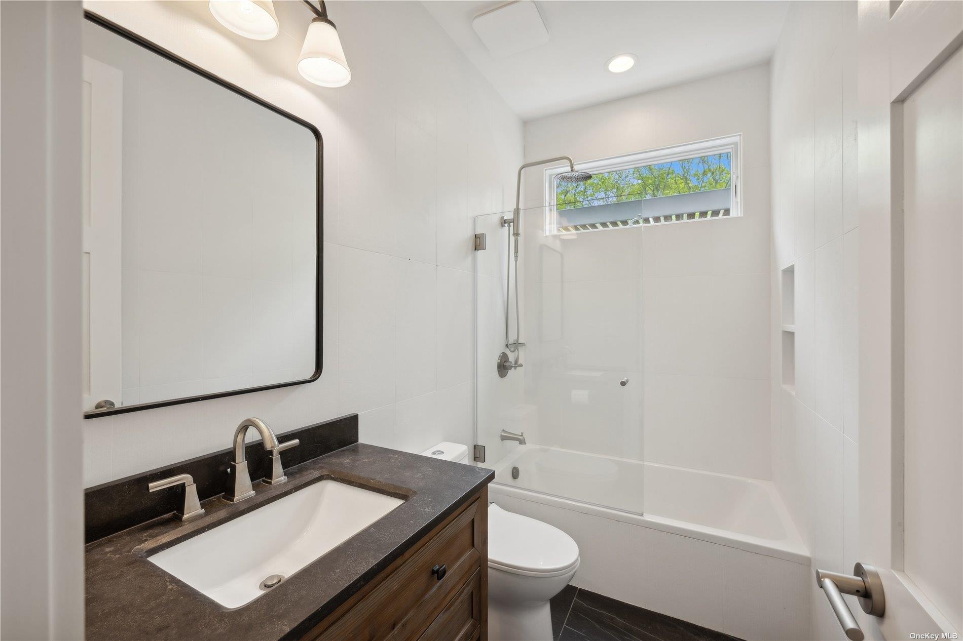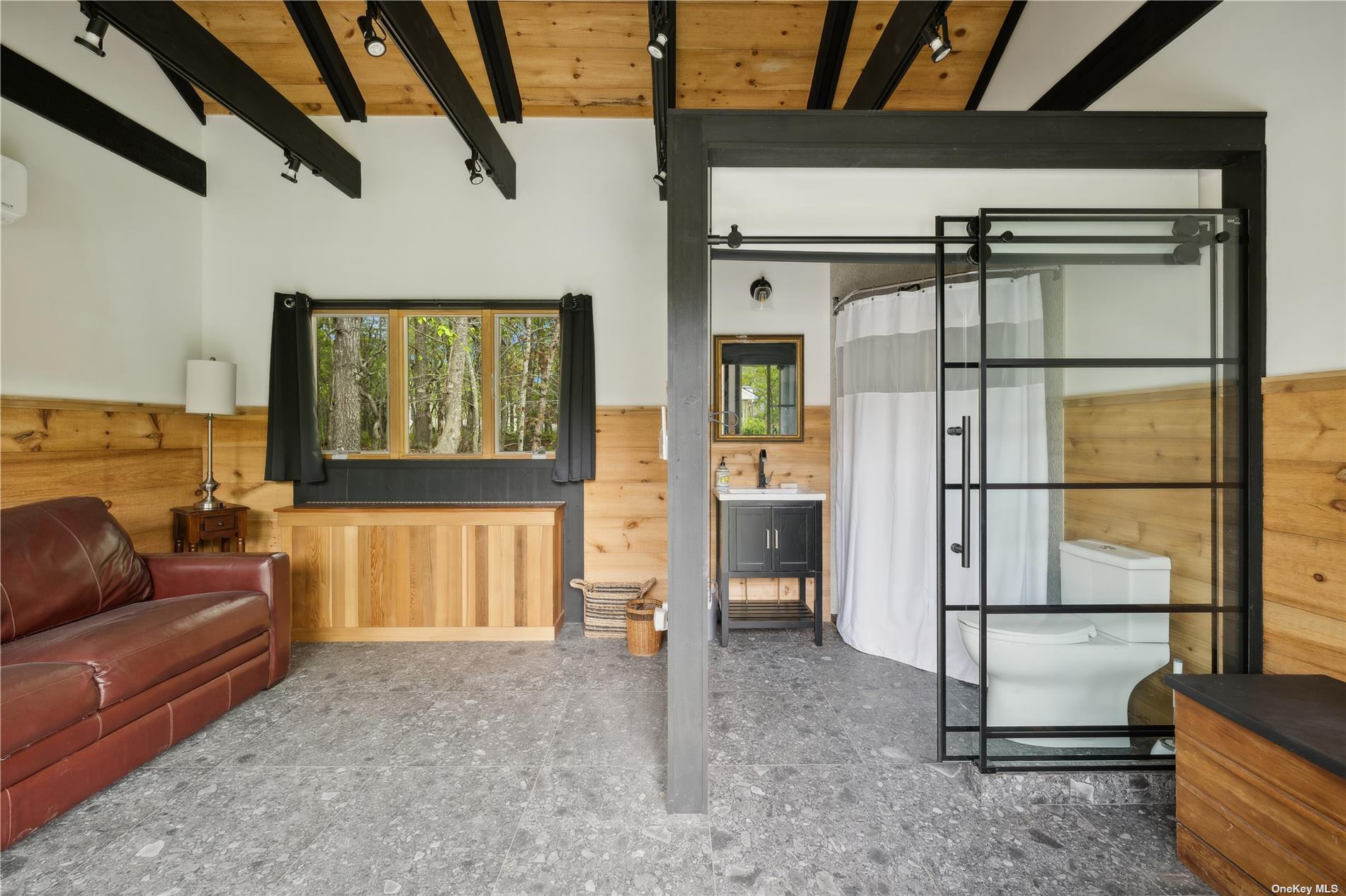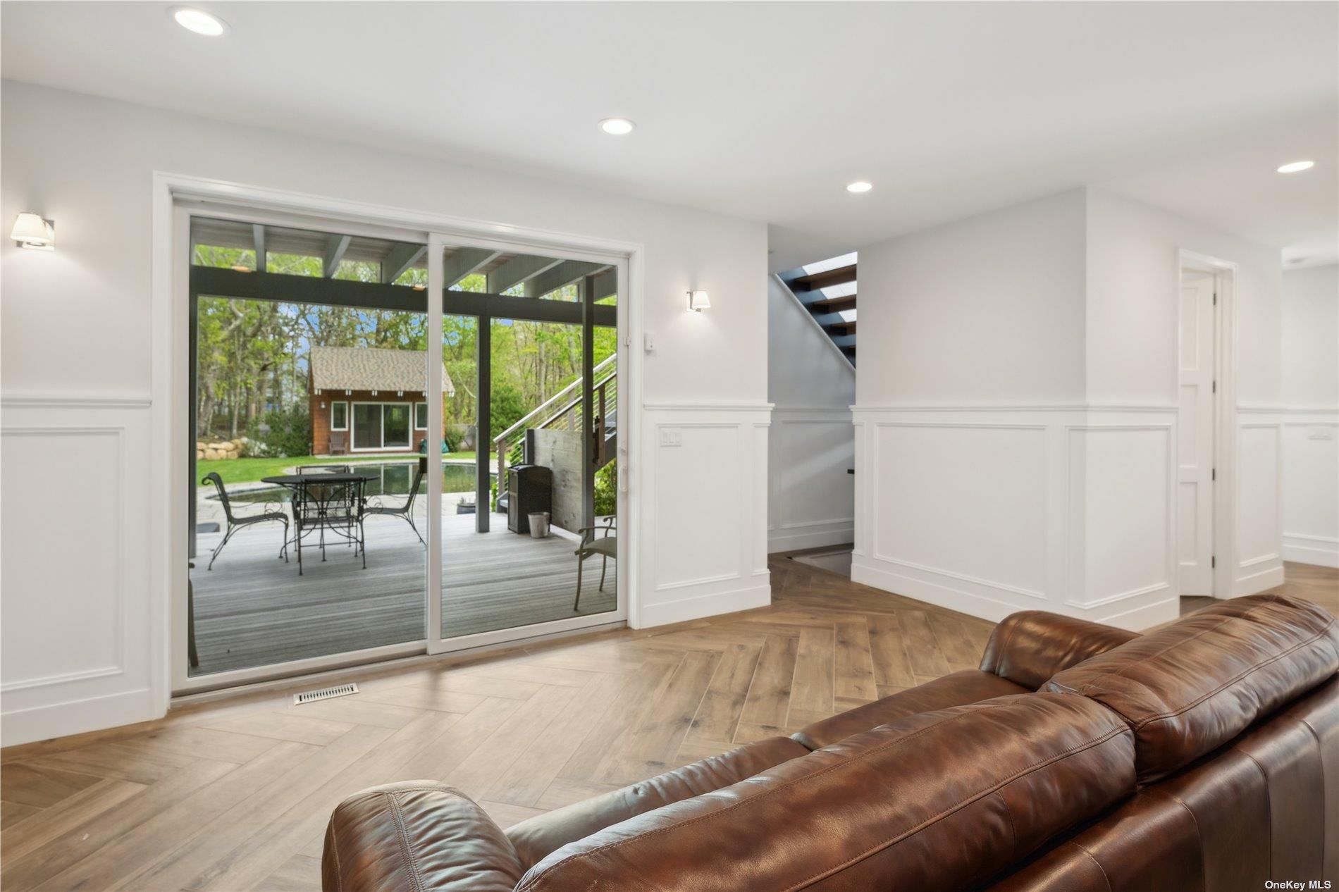 Situated on over 3/4 of an acre, this extraordinary custom-built home is surrounded by stunning natural scenery and lush landscaping with stone walls. The upper level features an expansive great room with a open kitchen, fireplace, dining room, and sliding doors to two separate entertaining areas. The primary suite and a powder room are also on this level. The large east-facing upper deck offers beautiful sunset views and stairway to the pool and pool house. The main level includes three additional spacious bedrooms (two en suite), a fourth full bath, a laundry room, and a large family room with sliding doors to a covered deck, an outdoor shower, a heated gunite pool, and a pool house with a Air Conditioning and a full bath. The finished lower level boasts an attached two-car garage, large windows, a sixth full bath, space for an office, gym, or media room. This remarkable property is in close proximity to bay beaches and the East Hampton Village.