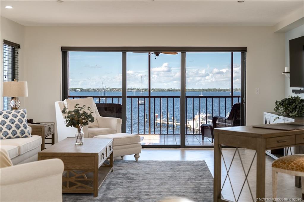 Looking to rent and need a place for your boat, too? Look no further. This sun-filled, updated, large and beautifully furnished waterfront condo at Harper's Landing is a boater's dream because it comes with a 27, 000 lb lift, wide water views of the St. Lucie River and incredible sunsets. Also available unfurnished. Fully upgraded 2 Bedroom/2 Bath condo in impeccable condition, with full size washer & dryer. Available for 6 month minimum. Elevator building with assigned, covered parking under the building, plus more parking in the open lot on the property. 2 spaces per condo, 1 interior and 1 exterior. Up to 2 pets (dogs only) allowed on a case-by-case basis, under 50 lbs per pet. Enjoy a relaxing swim in the pool or kick back on the screened patio with a glass of your favorite beverage and enjoy the peaceful scenery unfolding before you of ospreys and pelicans looking for their dinner in the river and the fish jumping out of their way.