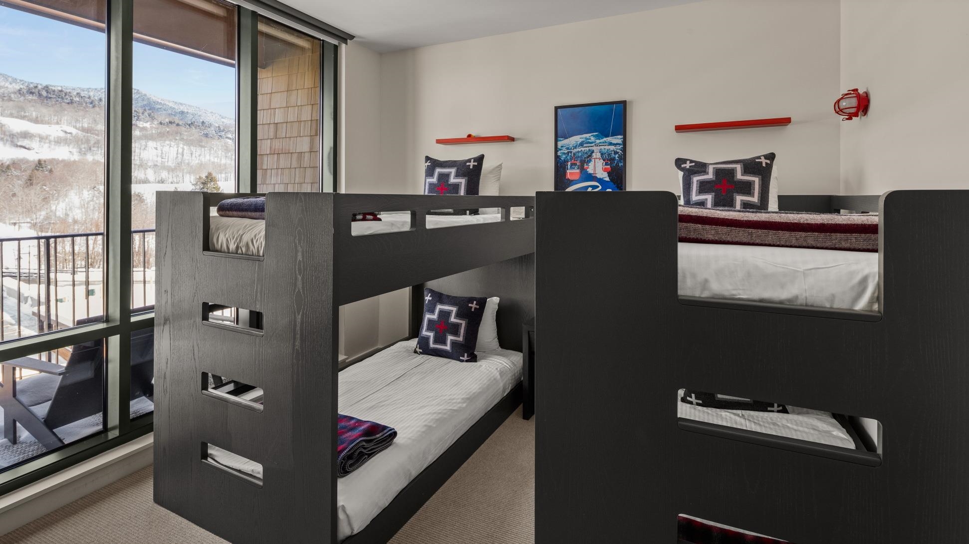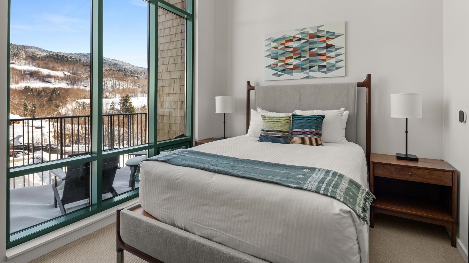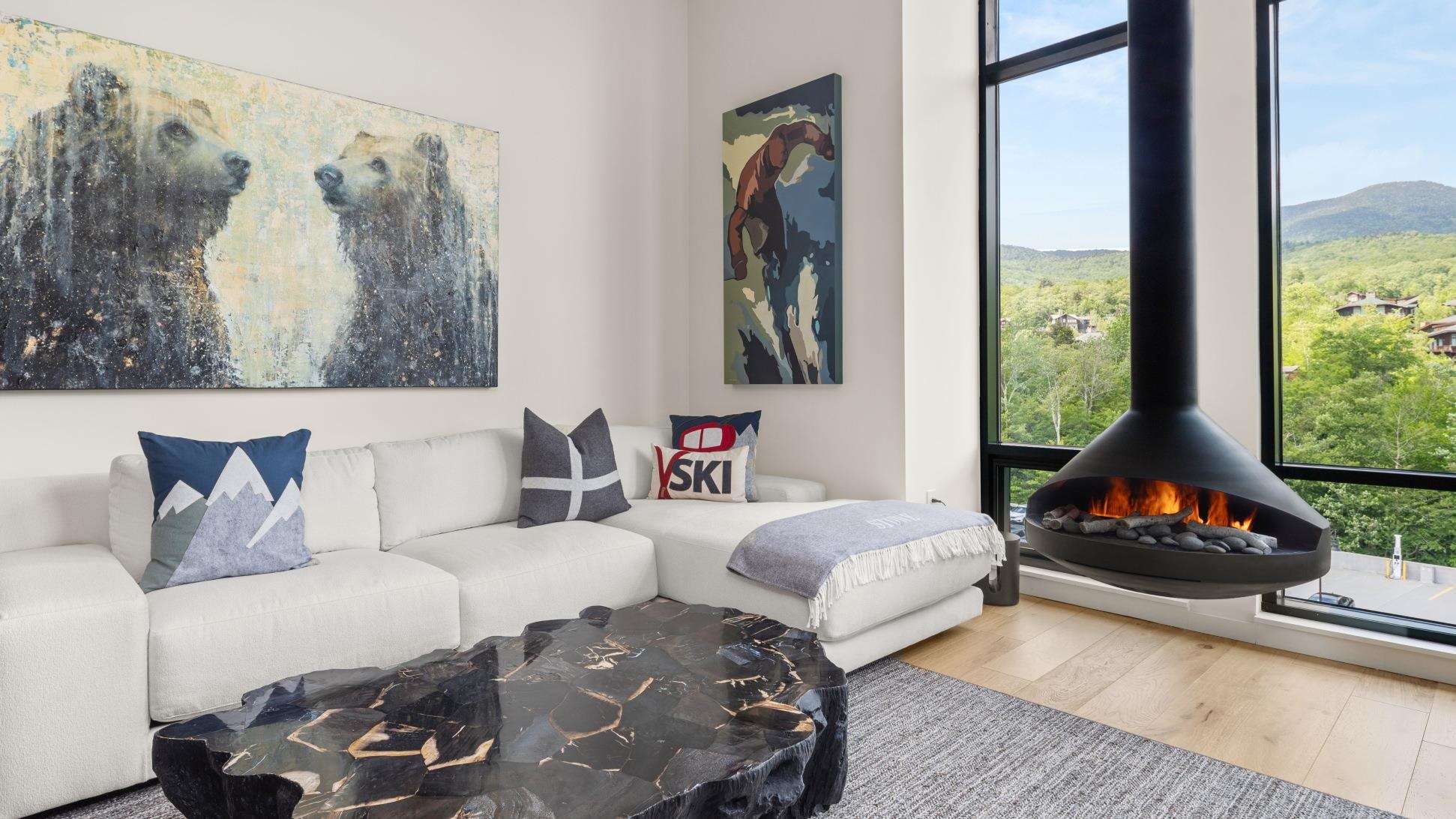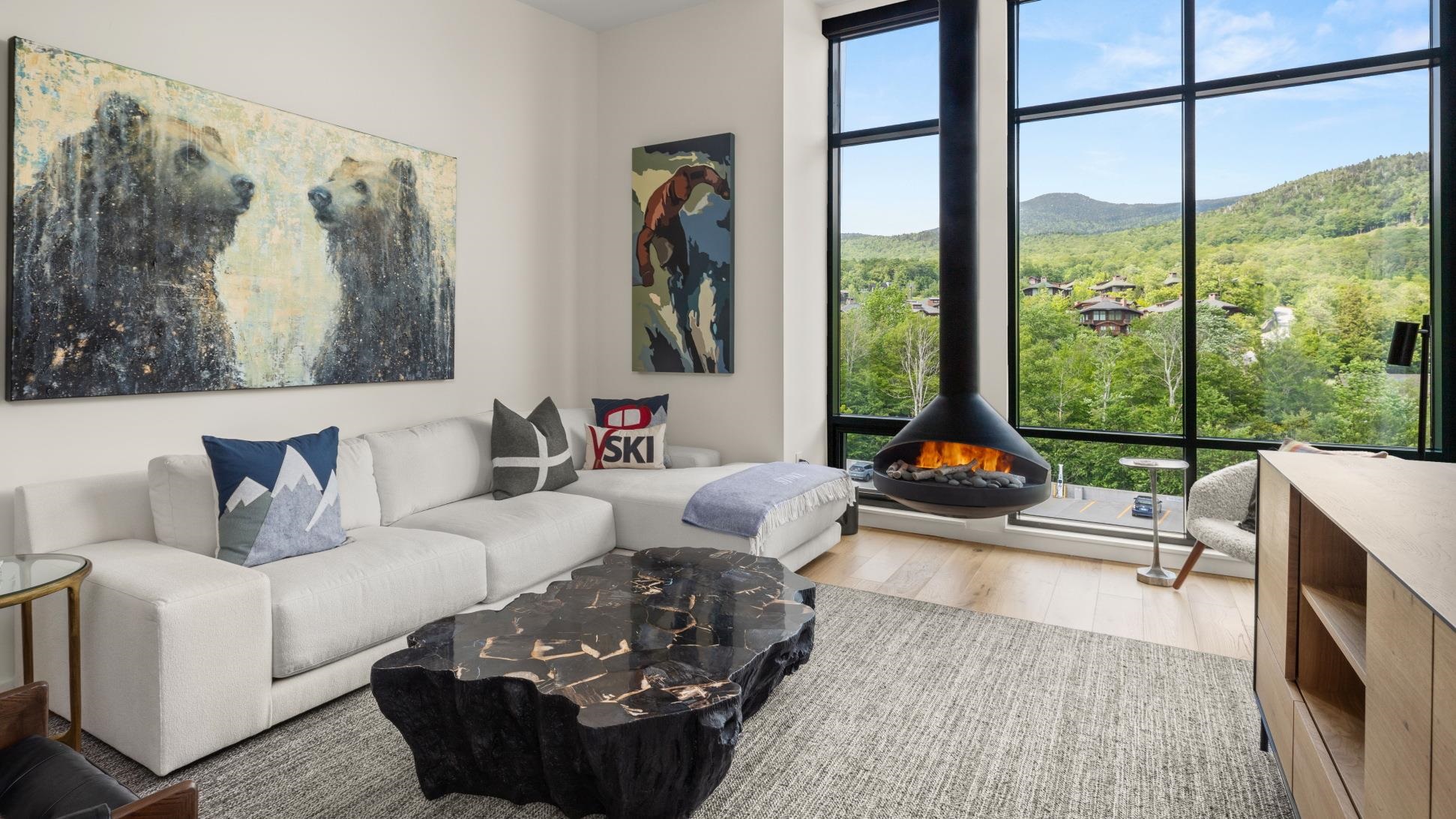 Perched above Spruce Peak Village, Penthouse 409 at The Treehouse is a rare mountainside retreat offering true slopeside living in Stowe's only ski-in/ski-out resort village - just steps from the Spruce Peak Base Camp, ski valet, the Lodge and world-class amenities. Wake up to a front-row sunrise over the award-winning Stowe Mountain Golf Course, framed by surrounding peaks. The view is a living canvas - layered terrain that shifts with every change in weather, light and season, from winter snowscapes to spring blooms, summer greens, and Vermont's unforgettable fall foliage. Inside, the home is designed for both elevated comfort and effortless gathering. The second level's soaring ceilings draw your eye to the mesmerizing panorama, while custom upgrades enhance every detail: designer lighting, custom closets, a custom-made sectional in high-performance fabric, curated living room furnishings, and bespoke blackout drapes in the primary suite for restful mountain sleep. With three bedrooms, three full baths, and a half bath, two balconies, and a gourmet kitchen, this Penthouse offers the space and functionality to host family and friends with ease. Luxury four-season living, including large owner's storage locker and one parking space enhance this ownership. Furnishings are included (excluding original artwork), making this a truly turn-key opportunity to step into the Stowe lifestyle and start building lasting memories.