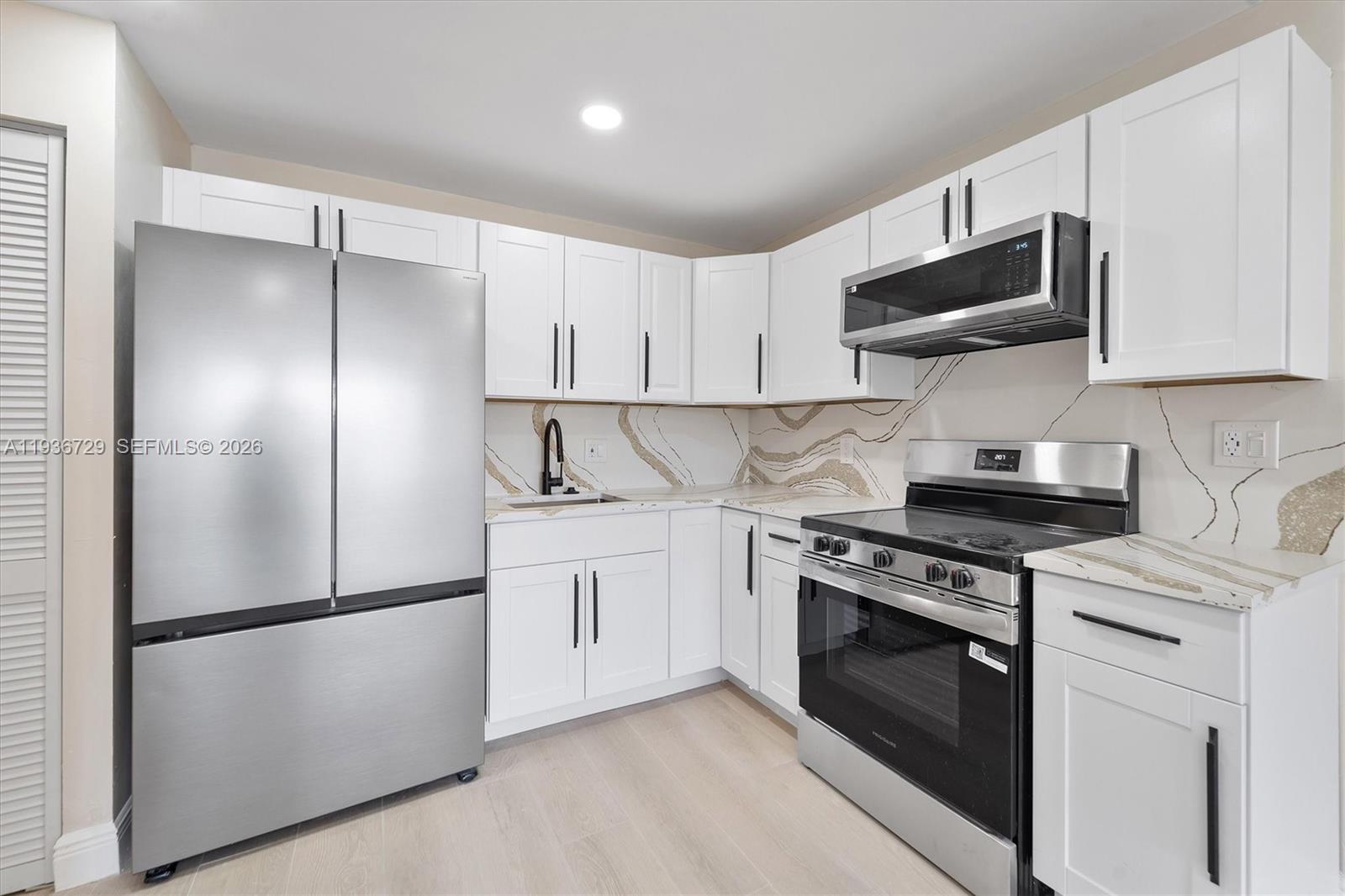 A must tour. Beautifully renovated 1st floor condo where everything is brand new and thoughtfully designed. From the moment you step inside, you’ll appreciate the clean, modern finishes and light, airy atmosphere. The kitchen shines with quartz countertops and all-new stainless steel appliances, including range, microwave and refrigerator—never used and ready for their first owner. Washer/Dryer Hook-up in unit. New tile flooring flows throughout, creating a fresh, low-maintenance living space. Relax on your screened-in porch overlooking the tranquil lake, the perfect spot to enjoy your morning coffee or unwind at the end of the day. Hurricane shutters provide added peace of mind, while the entire home reflects a true move-in-ready feel. Gated community offers a resort-style lifestyle with a pool, community room, tennis and racquetball courts and scenic walking trails. Secure, serene, and beautifully maintained, this condo delivers the rare opportunity to enjoy a completely renovated home with a brand-new feel in an amenity-rich setting.