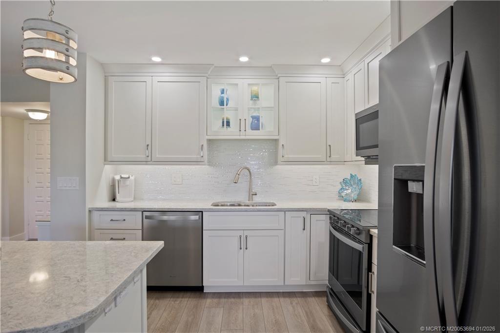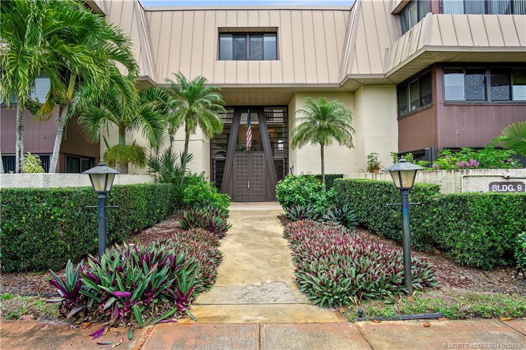 Stunning, fully renovated and fully furnished, second floor condo with golf course views in elevator building. Custom craftsmanship throughout. Quartz countertops, wood vinyl floors, NO popcorn ceilings, double sinks in main bath, custom closets, sliding barn door in bedroom leading to porch, beaded wood ceiling in guest bedroom, plantation shutters throughout. . Do not miss this exceptional condo. Complex has three heated pools, clubhouse, tennis, pickleball, shuffleboard, wood working area, fishing pier, park on St. Lucie River. It is near shops, restaurants, beaches and medical facilities. . It is next to the Martin County public golf course.