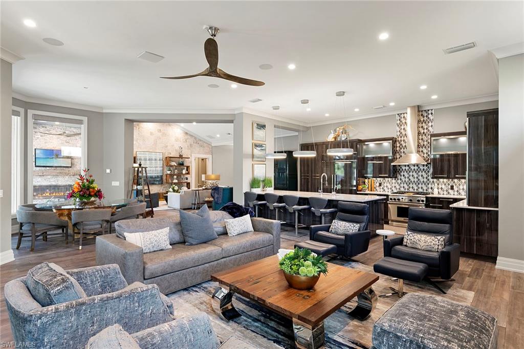 Warm sophistication defines this exceptional, fully renovated estate in the heart of Collier’s Reserve, set on nearly a half-acre with golf membership available. Inside and out, 927 Barcarmil Way showcases refined finishes, an open great room floor plan, soaring ceilings, intimate retreat spaces, and a timeless palette of warm, neutral décor. Seamless indoor-outdoor living is at the forefront, with the home flowing organically to an expansive outdoor oasis featuring generous covered areas, a charming fireplace gathering space with rustic mantel and stone accent wall, outdoor kitchen, electric awning, imbedded sun-shelf lounge chairs, soothing water feature, large pool and spa, picture-frame lanai cage, and manicured lawn space, all set against a tranquil riverfront backdrop with private dock. The chef’s kitchen is the heart of the home and is thoughtfully designed with state-of-the-art appliances, including a Thermador gas range with stainless hood, Sub-Zero paneled refrigerator, wine refrigerator, massive stone island, stylish backsplash, under-counter lighting, chic high-gloss cabinetry with frosted glass accents and a paneled dishwasher. The generous owner’s suite offers a serene retreat with a Zen-inspired, spa-like bath. All five baths are impeccably appointed with designer finishes that balance sophistication and comfort. An upstairs VIP guest suite provides exceptional privacy with a large bedroom, private screened balcony and adjoining open study. Additional highlights include an oversized garage with third bay for golf cart, air conditioning, epoxy flooring and custom storage built-ins. Major systems, including roof, HVACs and water heater, are newer, and the home’s overall condition is absolutely immaculate and pristine. Collier’s Reserve spans 450 acres of natural beauty and is recognized as the world’s first Audubon Signature Sanctuary community, offering championship golf, world-class club amenities, active tennis, pickleball and bocce, a newer fitness center, outstanding dining and a prime Naples location less than two miles from Vanderbilt Beach.
