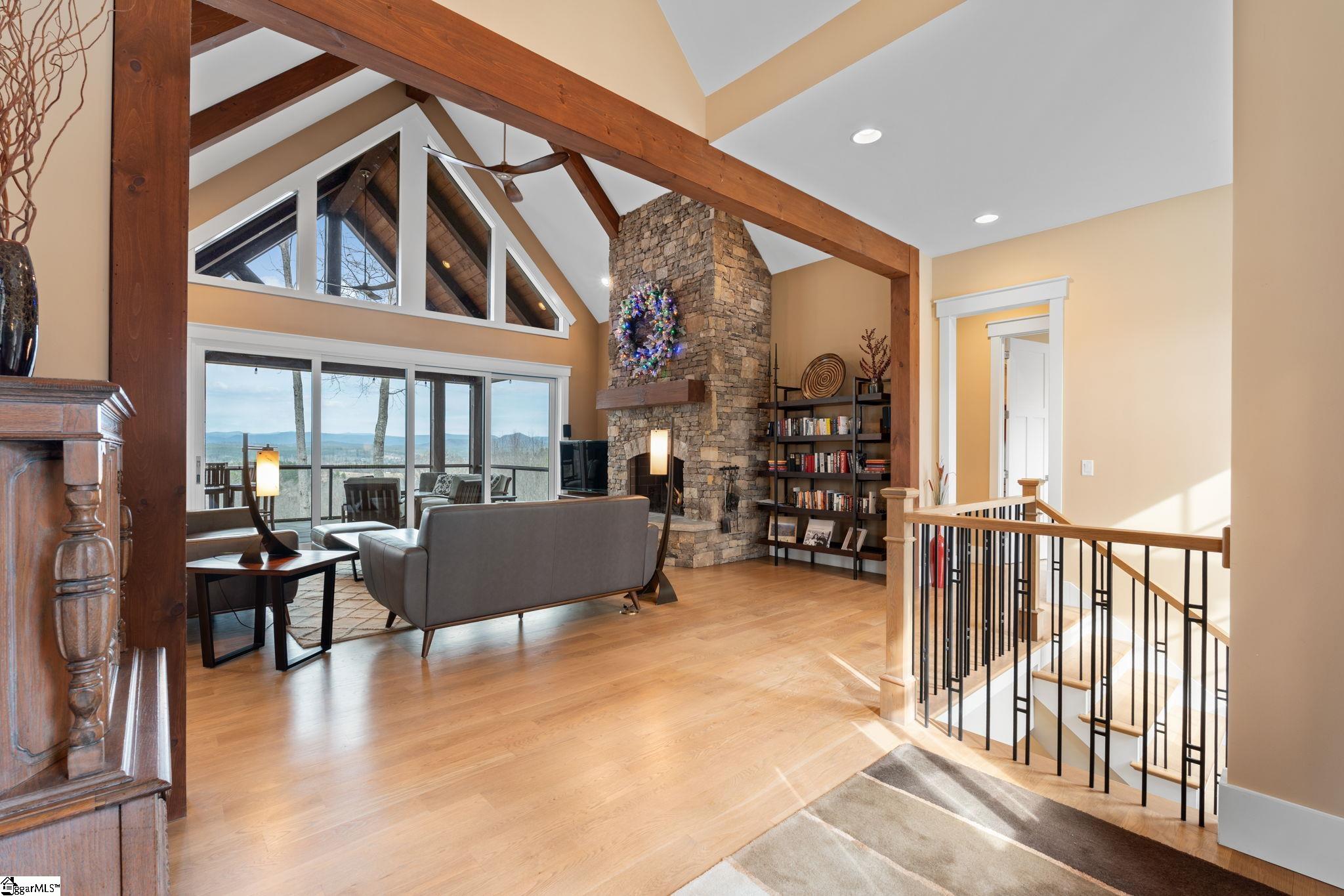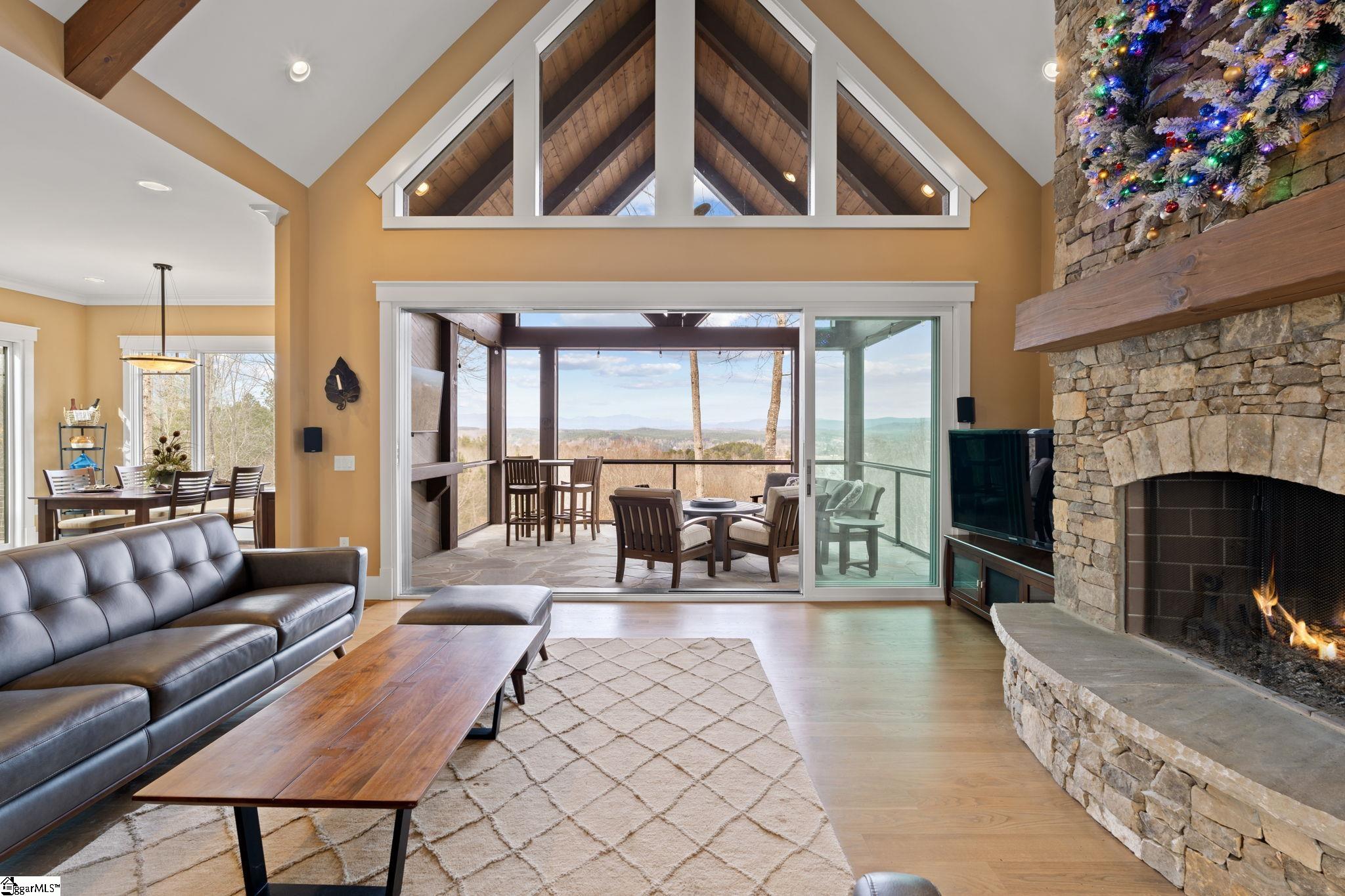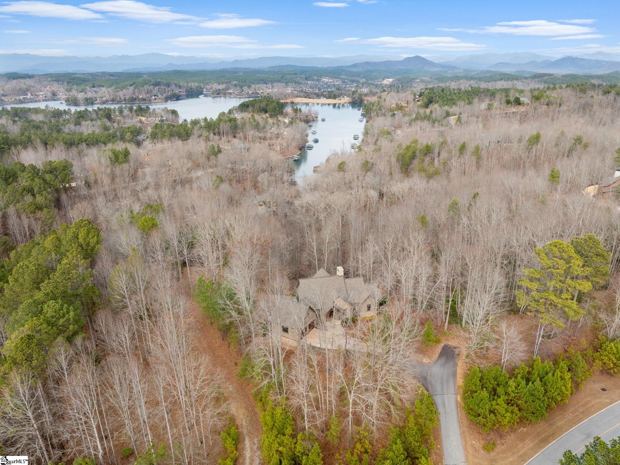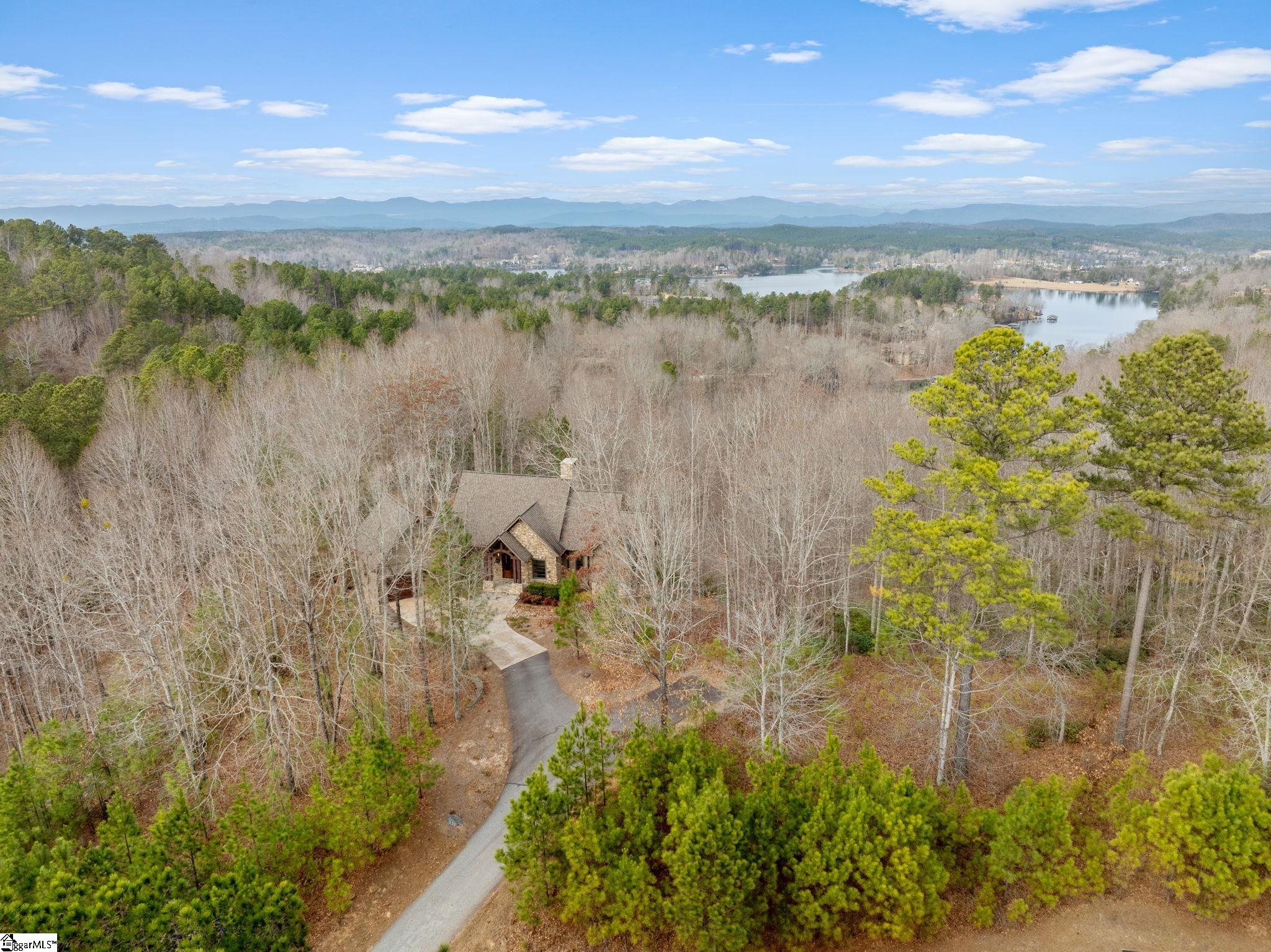 Picturesque mountain rustic home in the Cliffs of Keowee Springs combines a private wooded setting with captivating mountain and lake views from nearly every room. Built by Hillcrest Homes, the home sits on two lots totaling over five acres in The Cliffs at Keowee Springs. This property is ideal as a primary residence for a small family or an exceptional getaway retreat. The main level includes a great room, kitchen, dining area, primary bedroom suite, and powder room with site-finished, white oak hardwood flooring throughout. The open concept great room features vaulted ceilings, a dramatic stacked stone fireplace and clerestory windows that fill the space with natural light. Panoramic sliding doors open to a spacious screened porch with natural flagstone flooring, creating a seamless connection to outdoor living. The kitchen is well appointed with black stainless steel appliances, double ovens, a gas cooktop, and a generous island with breakfast bar. Just off the adjacent dining area, a flagstone patio offers the perfect place to enjoy a fire or sip morning coffee. The primary bedroom is a private retreat with panoramic views. The en suite bathroom offers dual vanities, a walk-in shower, and a separate water closet. The spacious walk-in closet includes custom shelving along with a window seat. The laundry room is conveniently located adjacent to the primary bedroom. The lower level walkout is thoughtfully designed to accommodate family and guests and also offers long-range mountain views from every window. A multipurpose recreation area includes a wet bar with a wine chiller and built-in cabinetry. Two bedrooms are located on this level, allowing one to be easily used as a home office, along with one full bathroom. An unfinished storage area provides a generous amount of additional storage space. This home is just minutes from the front gate and clubhouse and is offered in pristine condition. It presents an outstanding opportunity for those looking to downsize while continuing to enjoy the benefits of a Cliffs membership. Membership privileges provide access to exceptional amenities across seven clubs throughout South and North Carolina, including award winning golf courses, fine dining, wellness centers, tennis and pickleball courts, and more.