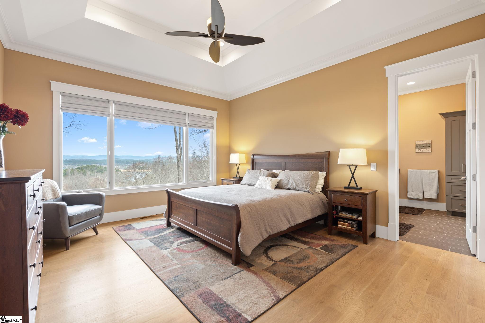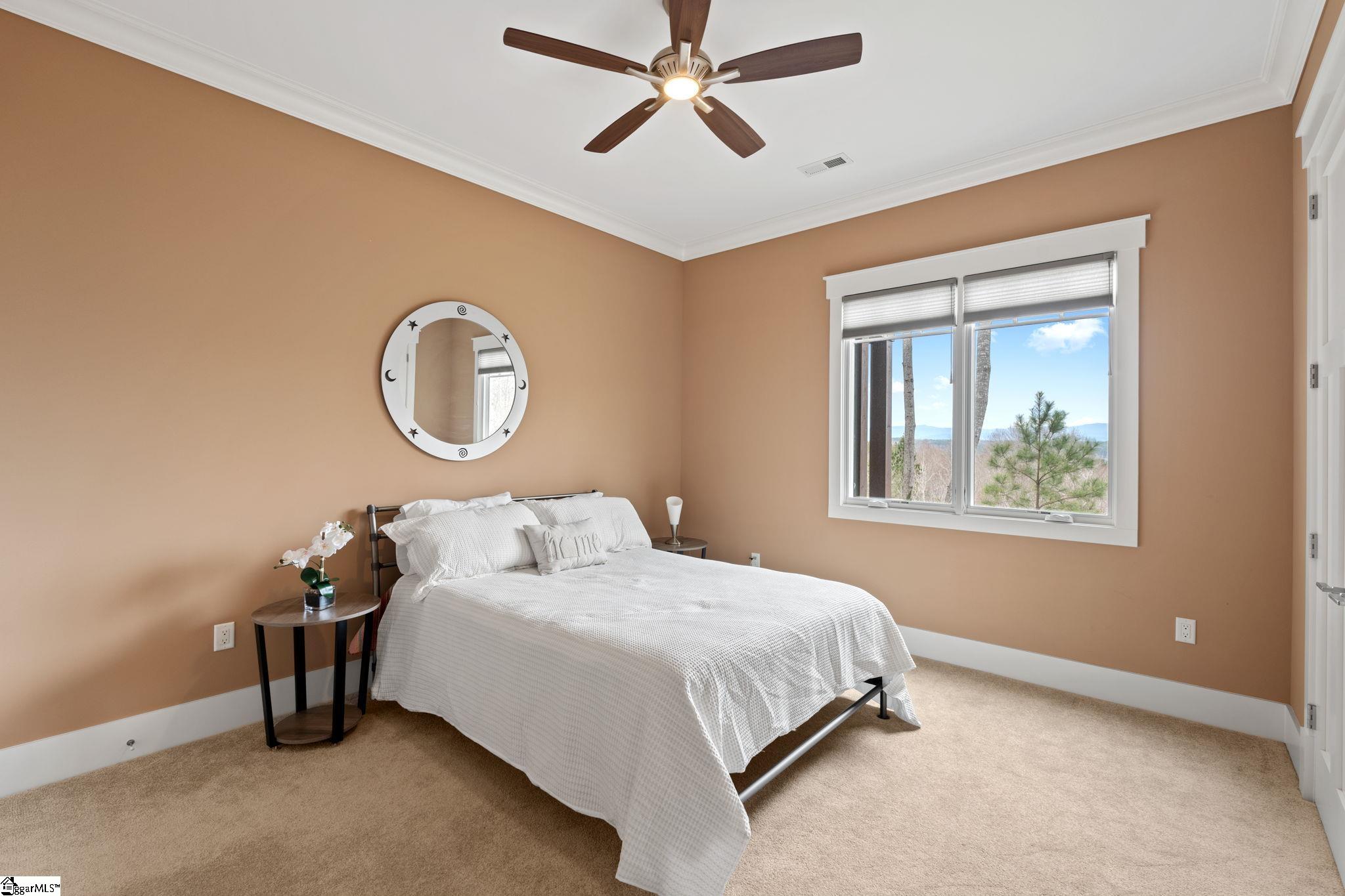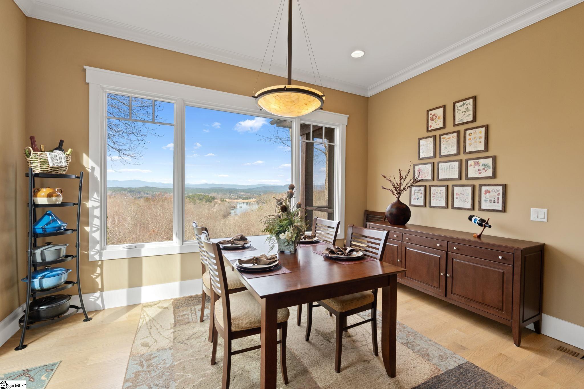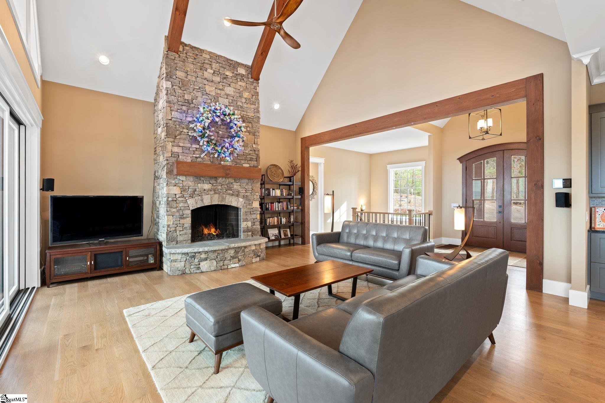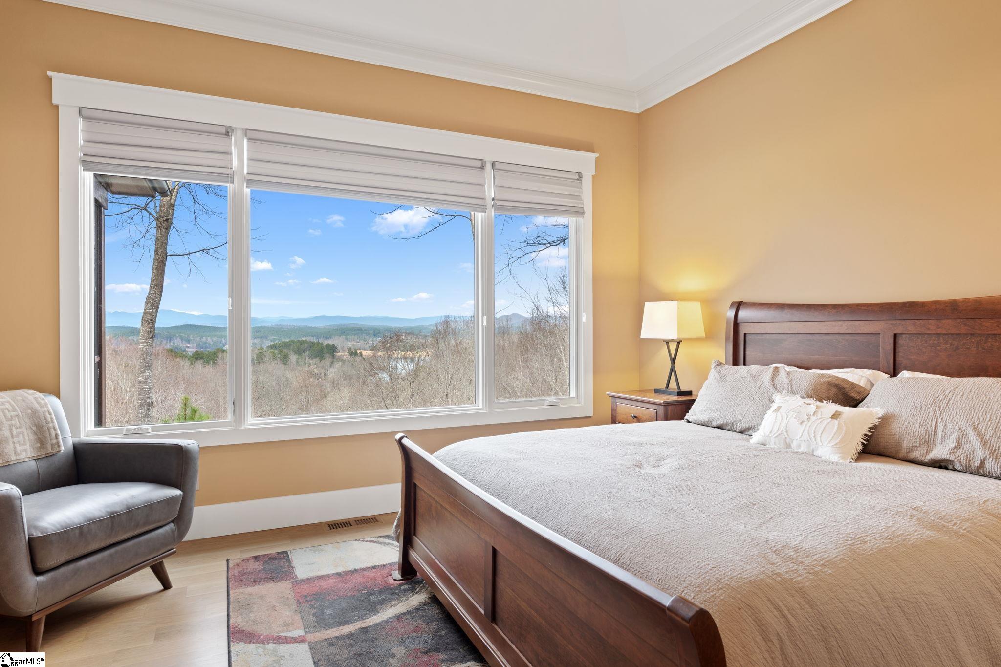 Picturesque mountain rustic home in the Cliffs of Keowee Springs combines a private wooded setting with captivating mountain and lake views from nearly every room. Built by Hillcrest Homes, the home sits on two lots totaling over five acres in The Cliffs at Keowee Springs. This property is ideal as a primary residence for a small family or an exceptional getaway retreat. The main level includes a great room, kitchen, dining area, primary bedroom suite, and powder room with site-finished, white oak hardwood flooring throughout. The open concept great room features vaulted ceilings, a dramatic stacked stone fireplace and clerestory windows that fill the space with natural light. Panoramic sliding doors open to a spacious screened porch with natural flagstone flooring, creating a seamless connection to outdoor living. The kitchen is well appointed with black stainless steel appliances, double ovens, a gas cooktop, and a generous island with breakfast bar. Just off the adjacent dining area, a flagstone patio offers the perfect place to enjoy a fire or sip morning coffee. The primary bedroom is a private retreat with panoramic views. The en suite bathroom offers dual vanities, a walk-in shower, and a separate water closet. The spacious walk-in closet includes custom shelving along with a window seat. The laundry room is conveniently located adjacent to the primary bedroom. The lower level walkout is thoughtfully designed to accommodate family and guests and also offers long-range mountain views from every window. A multipurpose recreation area includes a wet bar with a wine chiller and built-in cabinetry. Two bedrooms are located on this level, allowing one to be easily used as a home office, along with one full bathroom. An unfinished storage area provides a generous amount of additional storage space. This home is just minutes from the front gate and clubhouse and is offered in pristine condition. It presents an outstanding opportunity for those looking to downsize while continuing to enjoy the benefits of a Cliffs membership. Membership privileges provide access to exceptional amenities across seven clubs throughout South and North Carolina, including award winning golf courses, fine dining, wellness centers, tennis and pickleball courts, and more.