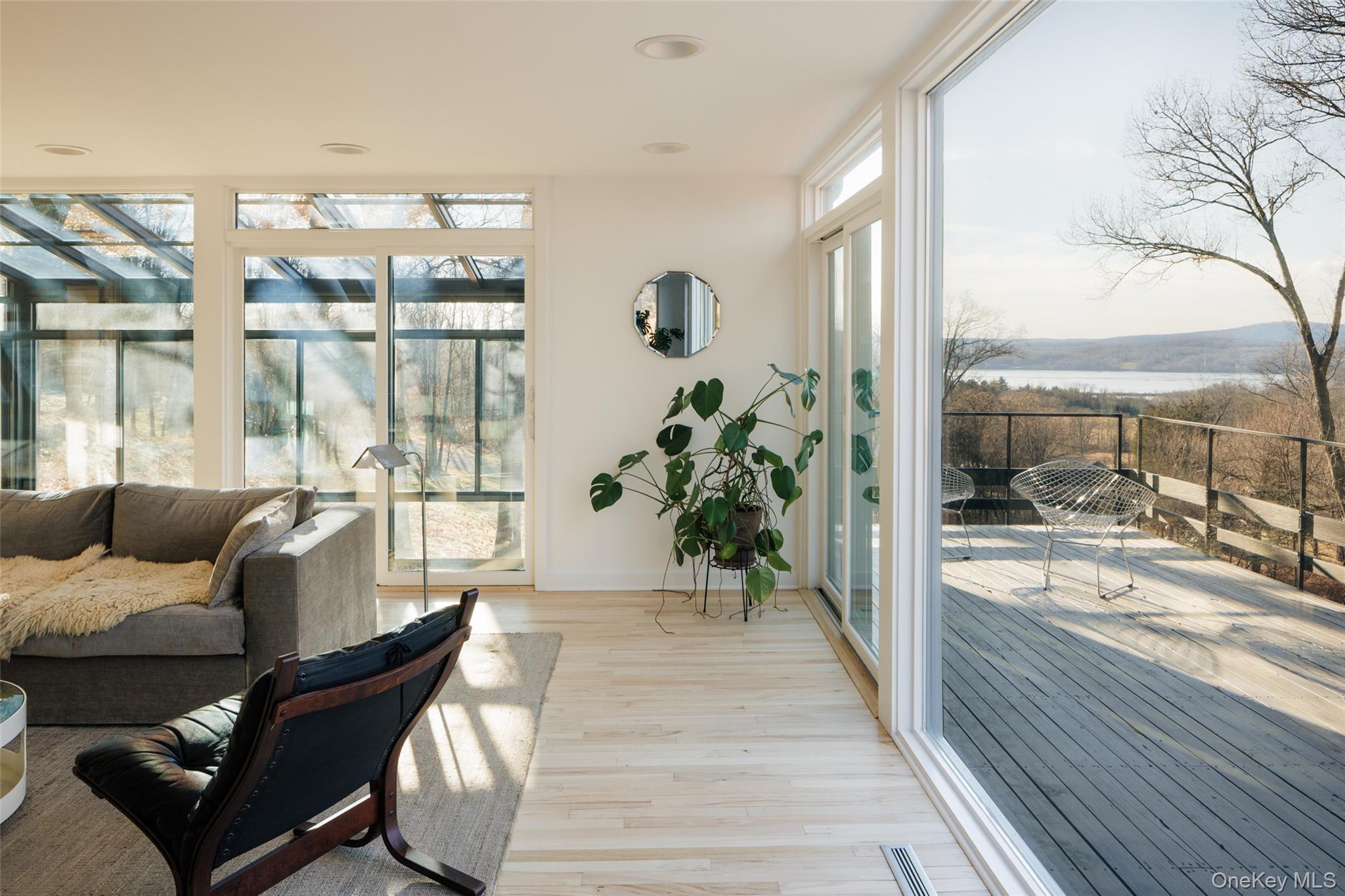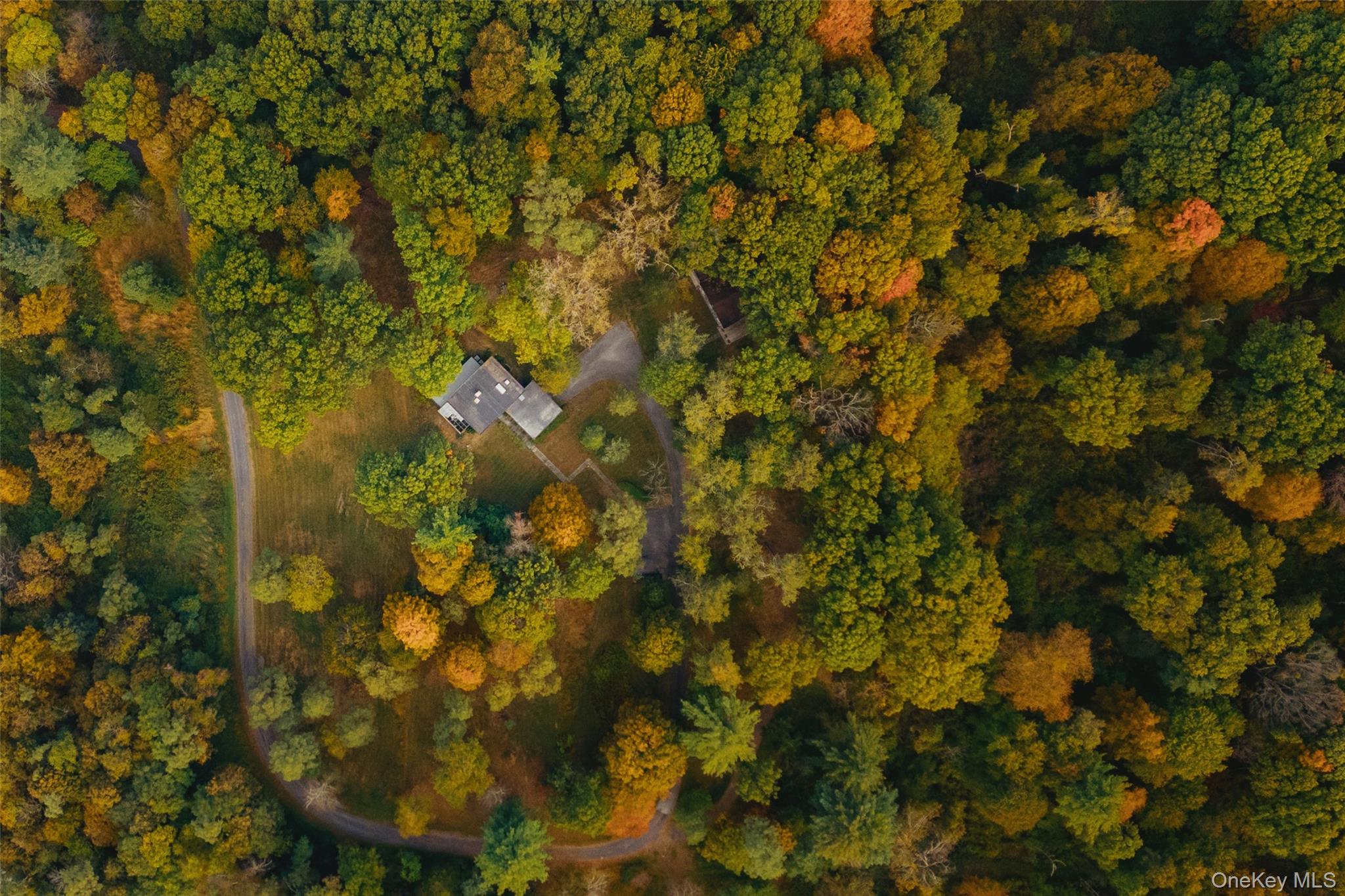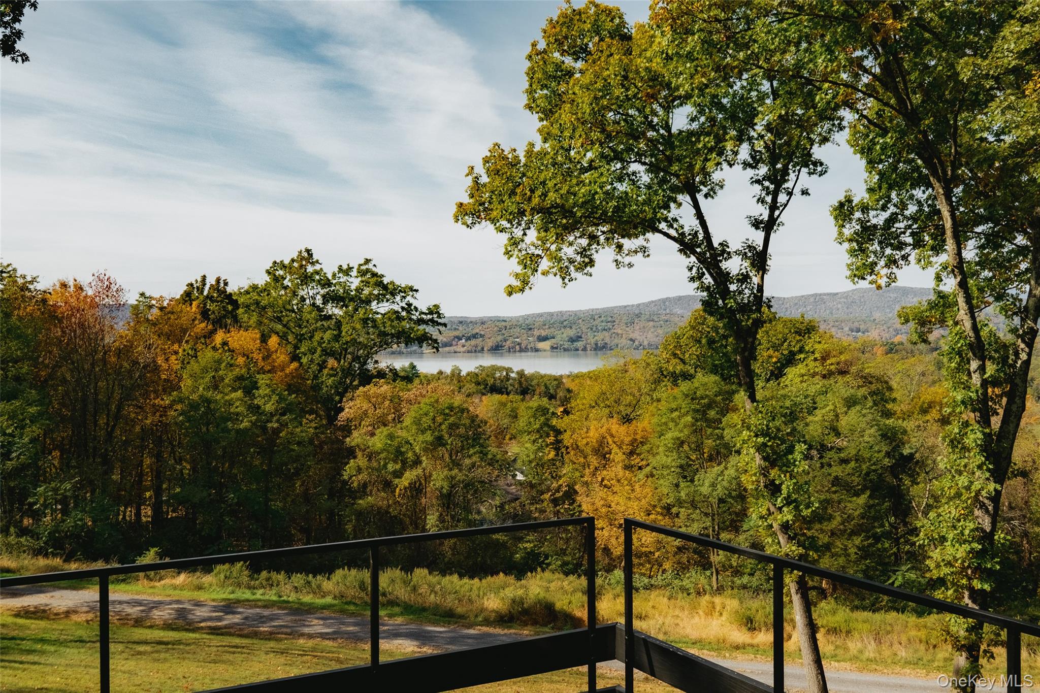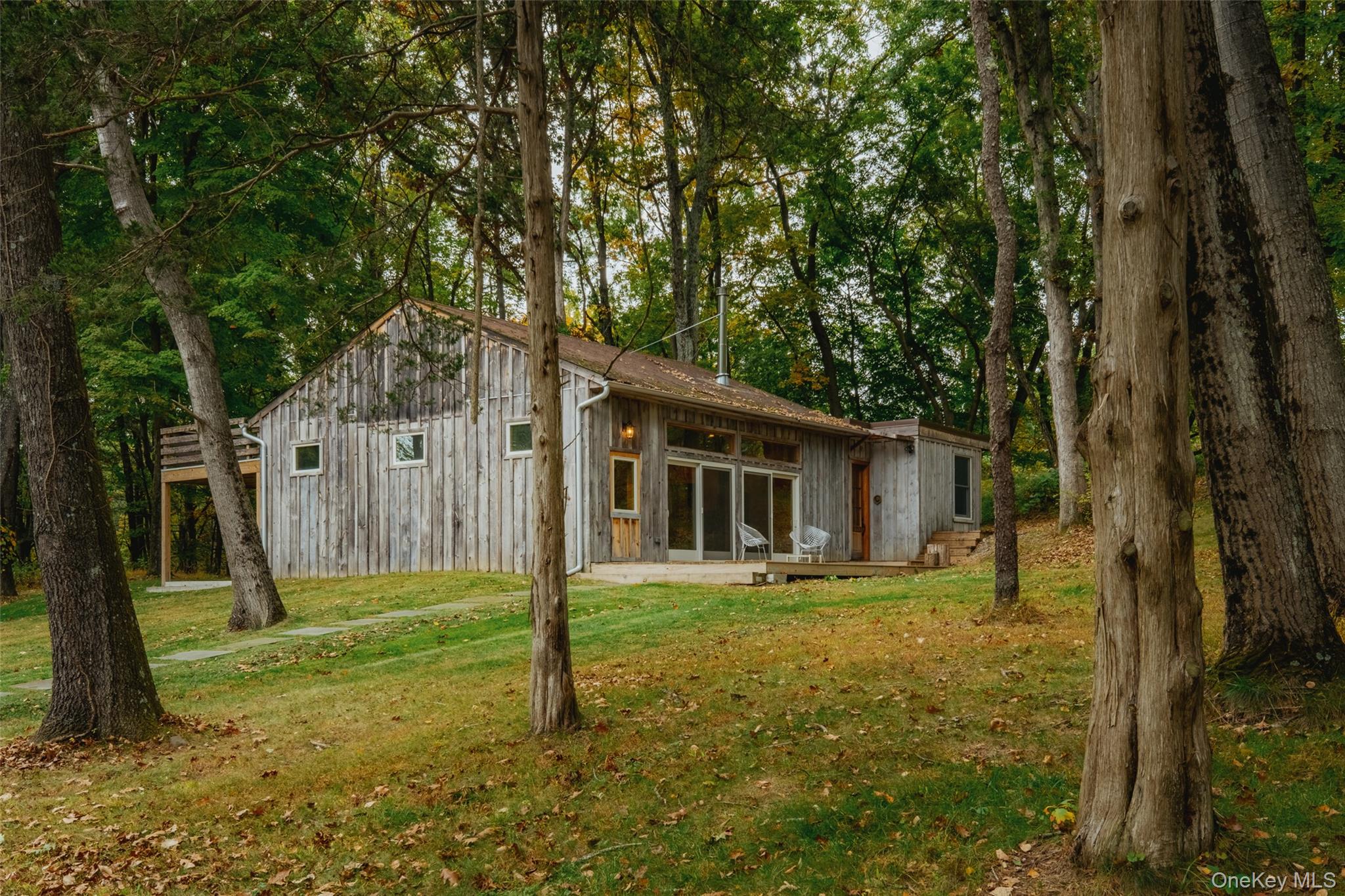 An exceptional 49 acre property only 5 minutes from Rhinebeck Village, offering a rare blend of privacy, space, architectural character and spectacular Hudson River and Catskill Mountain views. A long winding driveway leads up to the modern residence perched on a hillside overlooking the majestic grounds and sweeping west facing views of the horizon and stellar sunsets. Designed by Kingston architect George Hutton in 1970, whose family owned the recently reinvented Hutton Brickyards, the home is beautifully simple and thoughtfully designed. The mid-century home retains many modern details while recently updated throughout including refinished hardwood floors, repainted interior and exterior plus an updated kitchen and baths. Bathed in natural light, the home features three bedrooms, two and a half bathrooms, an office, and an extra room upstairs. Enter into the light filled living area with walls of glass framing stunning views of the Hudson River and mountains beyond. Glass sliding doors open onto the seasonal sun room and the expansive deck, perfect for entertaining and catching sunsets year around. Photos don’t quite do the views justice. A wood-burning brick fireplace separates the living and dining area. The updated kitchen, perfect for hosting, is complete with new Carrara marble countertops, an island with counter seating, updated stainless steel appliances including a Sub-Zero fridge, ample cabinetry and a walk-in pantry. The attached 2-car garage connects conveniently to the kitchen via a skylit mudroom. Through a sunlit stairwell, upstairs you’ll find the generous primary bedroom with ensuite bath, two more bedrooms, a second full bath, plenty of closet space and an extra fourth room. The upstairs baths feature clean lines, square ceramic tiles, updated chrome fixtures and new Carrara marble countertops. Across the driveway is a large workshop offering additional space with a covered patio and large deck. Many improvements have been done including a new Carrier HVAC system, extensive site work, opening up the views, removing old trees, and grading and trenching the driveway to prevent wash out. The land has a pond site plus logging and carriage trails for outdoor enjoyment. There are complete engineering plans for a proposed subdivision to create two additional single family lots which has been presented to the Town of Rhinebeck. This stunning property offers an exceptional blend of style, space, privacy and views. Less than 2 hours to NYC, easy access to Amtrak and all of the amenities of the Hudson Valley.