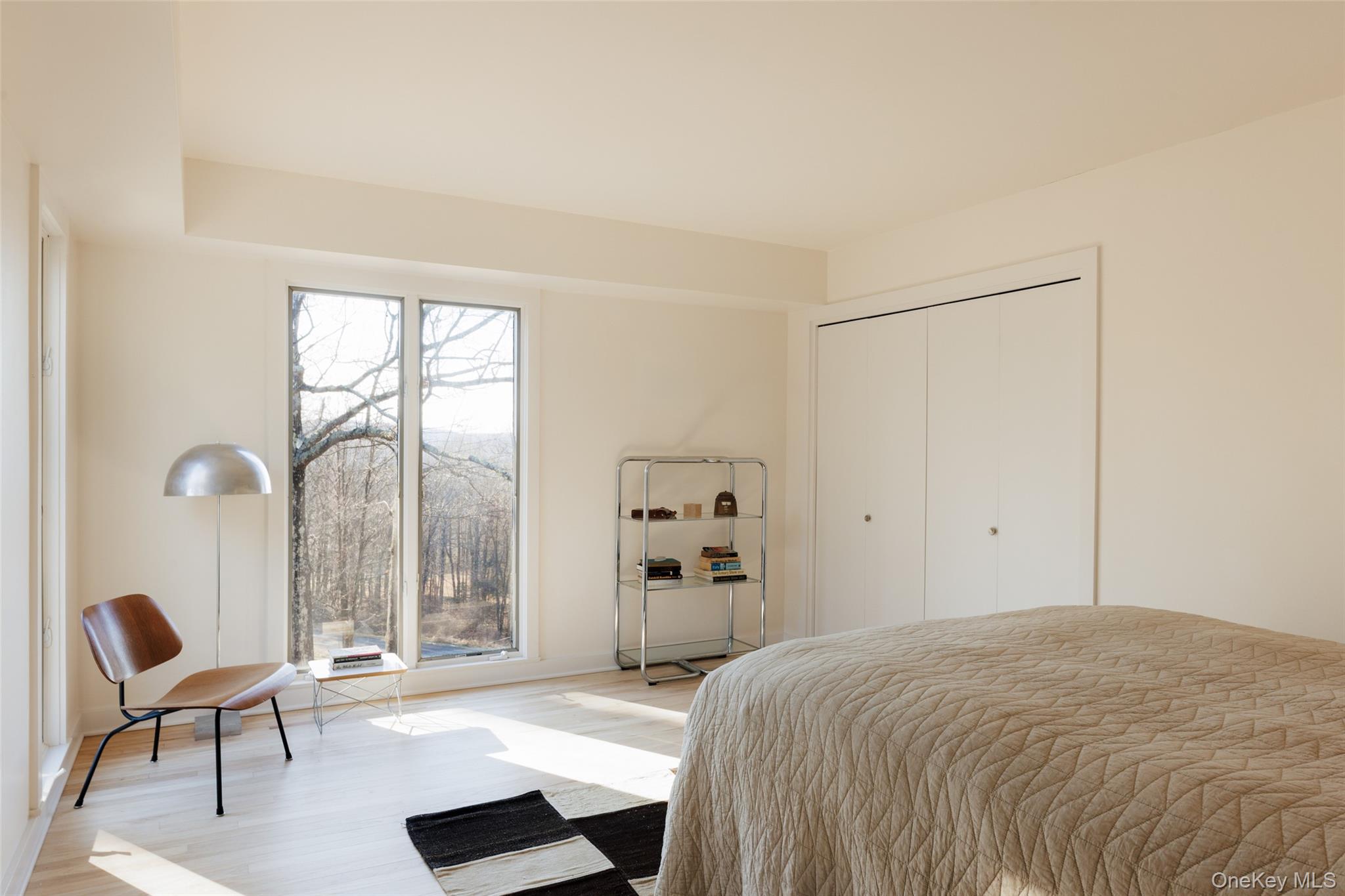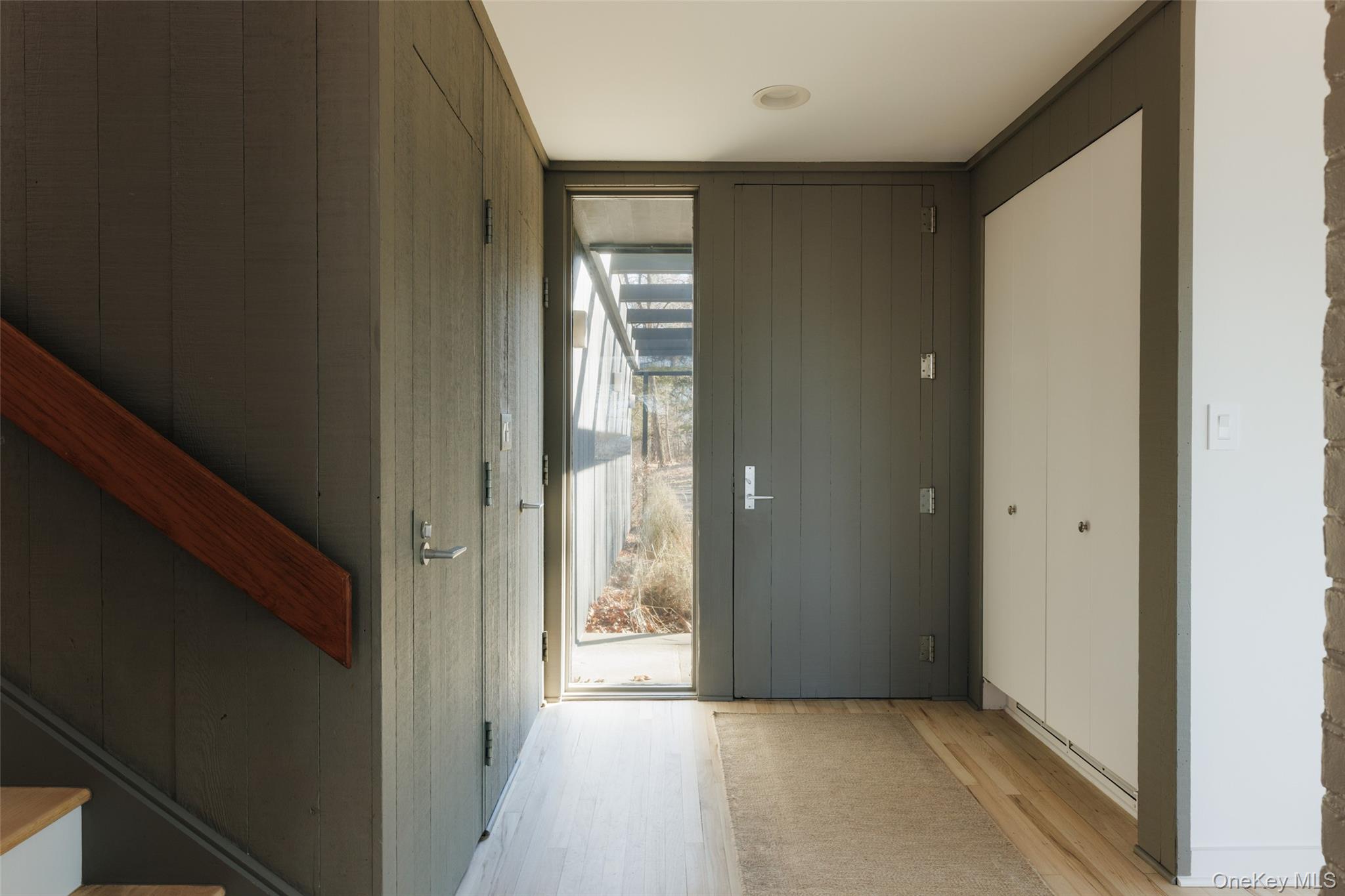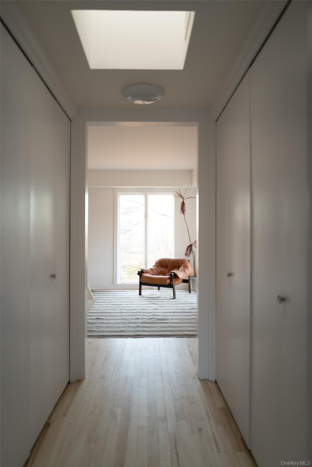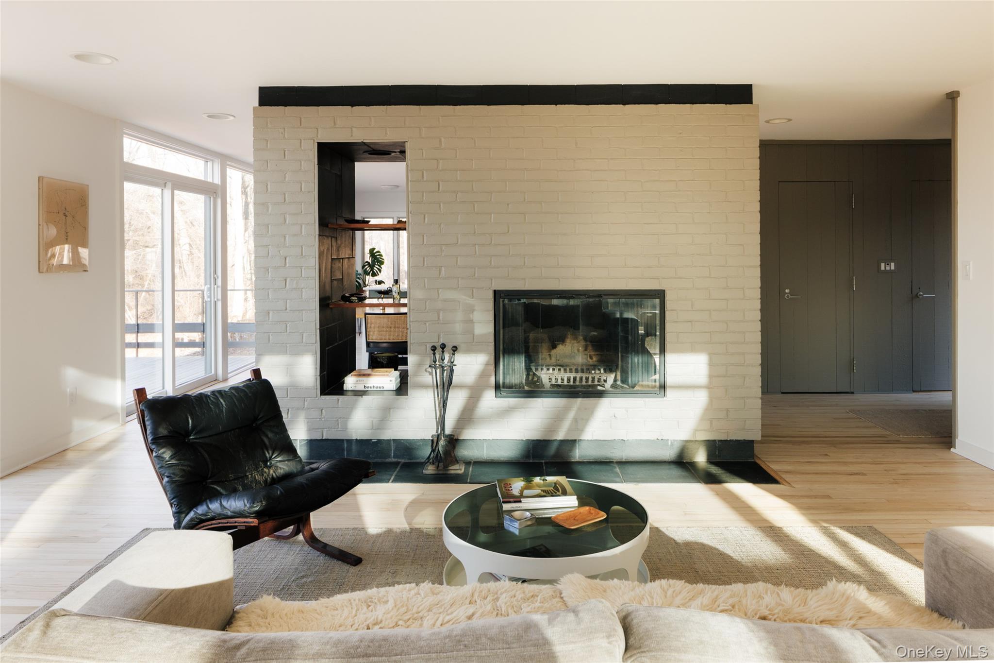 An exceptional 49 acre property only 5 minutes from Rhinebeck Village, offering a rare blend of privacy, space, architectural character and spectacular Hudson River and Catskill Mountain views. A long winding driveway leads up to the modern residence perched on a hillside overlooking the majestic grounds and sweeping west facing views of the horizon and stellar sunsets. Designed by Kingston architect George Hutton in 1970, whose family owned the recently reinvented Hutton Brickyards, the home is beautifully simple and thoughtfully designed. The mid-century home retains many modern details while recently updated throughout including refinished hardwood floors, repainted interior and exterior plus an updated kitchen and baths. Bathed in natural light, the home features three bedrooms, two and a half bathrooms, an office, and an extra room upstairs. Enter into the light filled living area with walls of glass framing stunning views of the Hudson River and mountains beyond. Glass sliding doors open onto the seasonal sun room and the expansive deck, perfect for entertaining and catching sunsets year around. Photos don’t quite do the views justice. A wood-burning brick fireplace separates the living and dining area. The updated kitchen, perfect for hosting, is complete with new Carrara marble countertops, an island with counter seating, updated stainless steel appliances including a Sub-Zero fridge, ample cabinetry and a walk-in pantry. The attached 2-car garage connects conveniently to the kitchen via a skylit mudroom. Through a sunlit stairwell, upstairs you’ll find the generous primary bedroom with ensuite bath, two more bedrooms, a second full bath, plenty of closet space and an extra fourth room. The upstairs baths feature clean lines, square ceramic tiles, updated chrome fixtures and new Carrara marble countertops. Across the driveway is a large workshop offering additional space with a covered patio and large deck. Many improvements have been done including a new Carrier HVAC system, extensive site work, opening up the views, removing old trees, and grading and trenching the driveway to prevent wash out. The land has a pond site plus logging and carriage trails for outdoor enjoyment. There are complete engineering plans for a proposed subdivision to create two additional single family lots which has been presented to the Town of Rhinebeck. This stunning property offers an exceptional blend of style, space, privacy and views. Less than 2 hours to NYC, easy access to Amtrak and all of the amenities of the Hudson Valley.