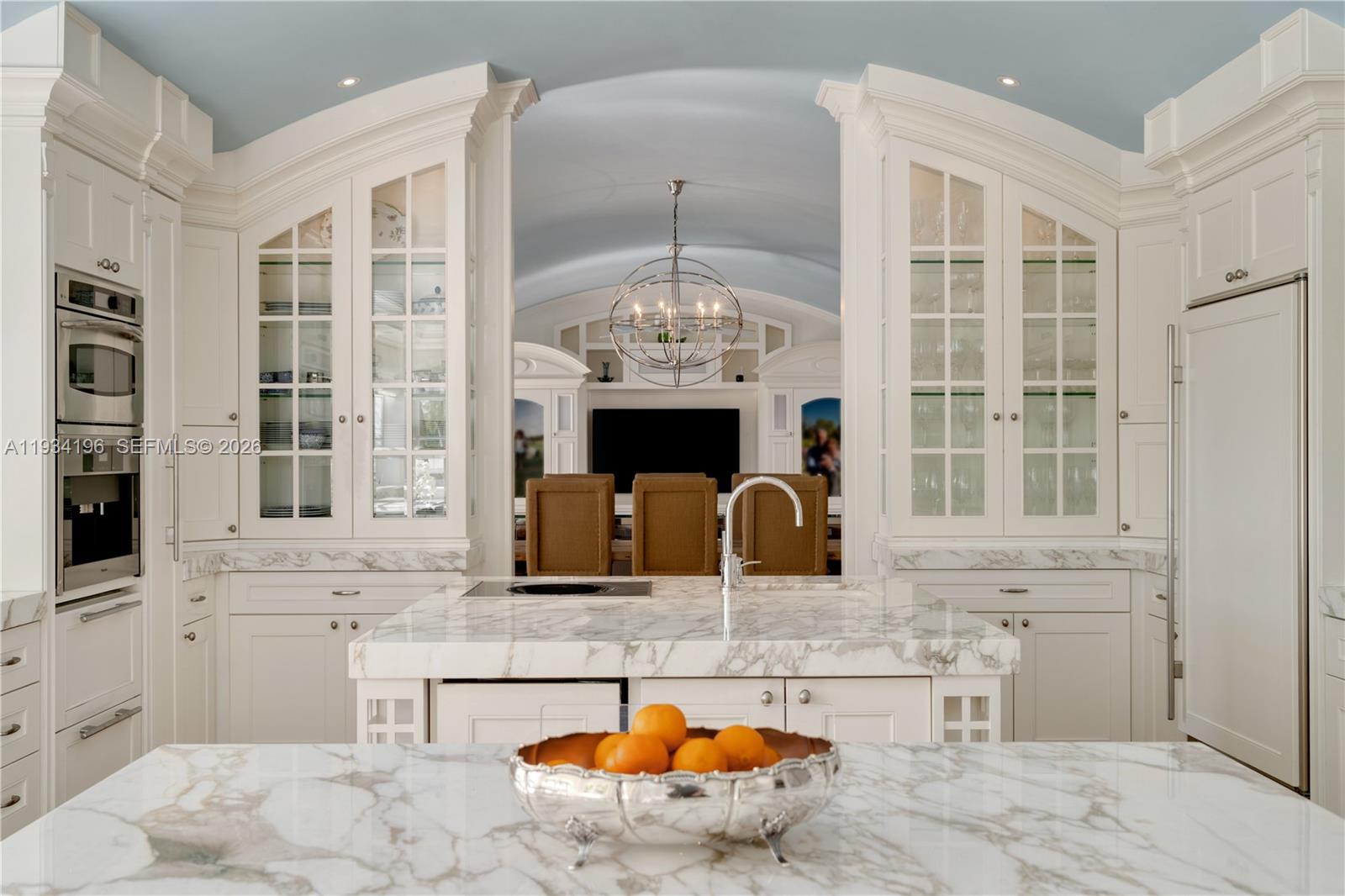 Architectural tray ceilings, refined millwork, custom wall paneling, and thoughtfully designed built-ins with abundant storage add depth and craftsmanship while maintaining a light, contemporary coastal aesthetic. Formal living and dining rooms with elegant millwork provide an ideal setting for entertaining. The kitchen is appointed with Calacatta Gold marble countertops, gas cooking, Sub-Zero and Viking appliances, and a butler’s pantry. Additional highlights include 2 family rooms, fitness center with water views, 2 garages accommodating 7+ cars/golf carts, temperature-controlled wine cellar for 1, 400+ bottles, elevator, retractable screen doors, generator and saltwater heated pool.