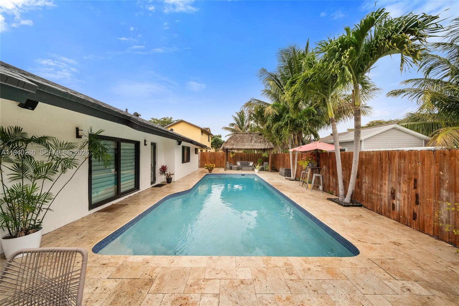 Outdoors, indulge in true resort-style living with a stunning resurfaced pool surrounded by a lush setting. Entertain effortlessly in the chic tiki lounge, fully furnished and equipped with fans and outdoor Harman Kardon speakers, creating the perfect ambiance for unforgettable gatherings. Outdoor security cameras provide added peace of mind while you enjoy your private oasis.