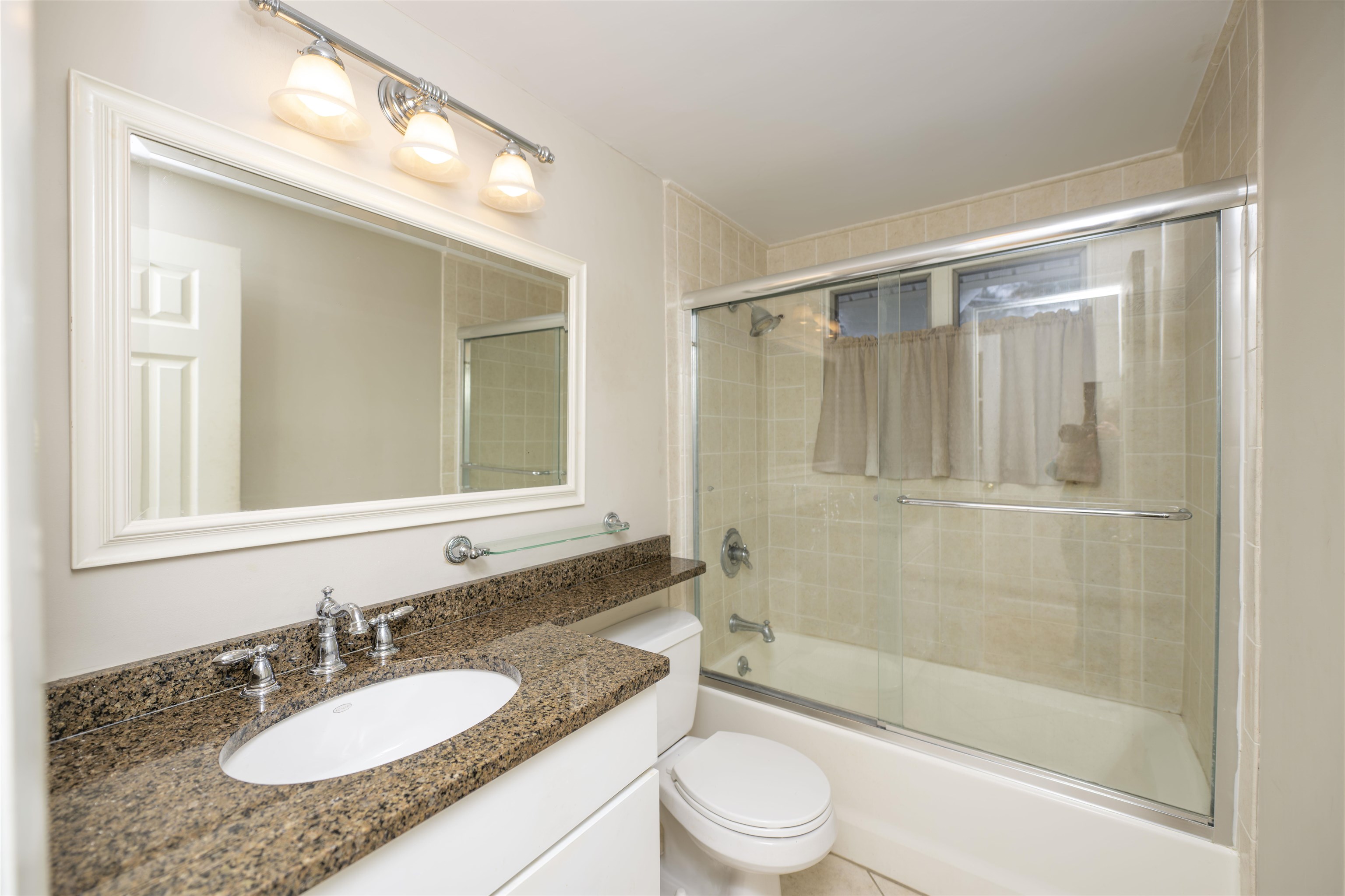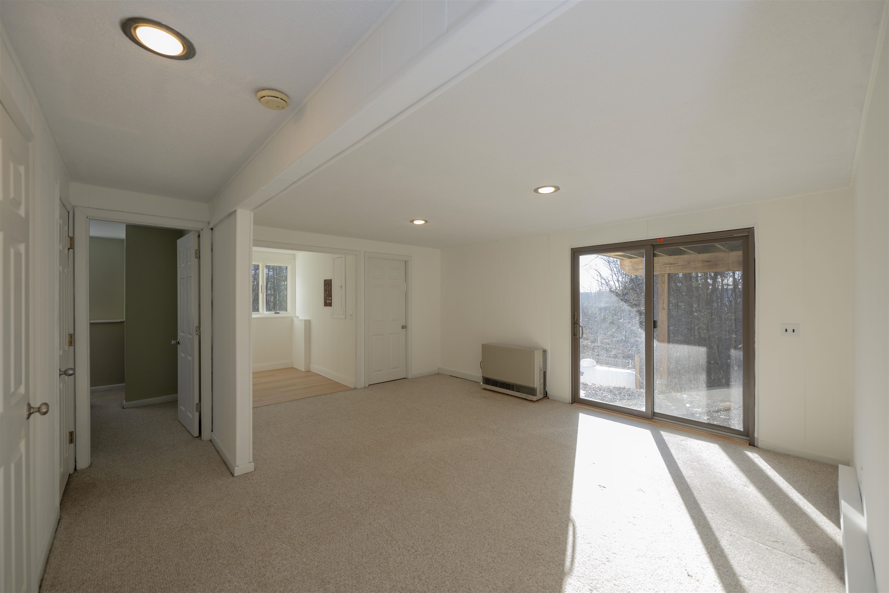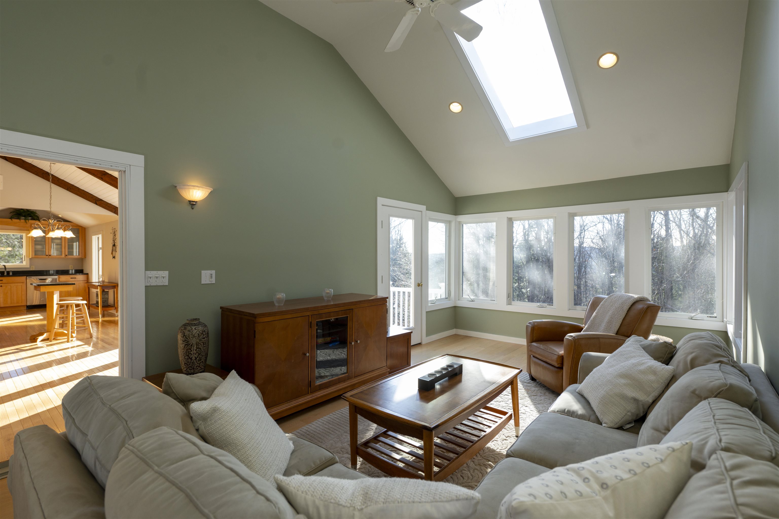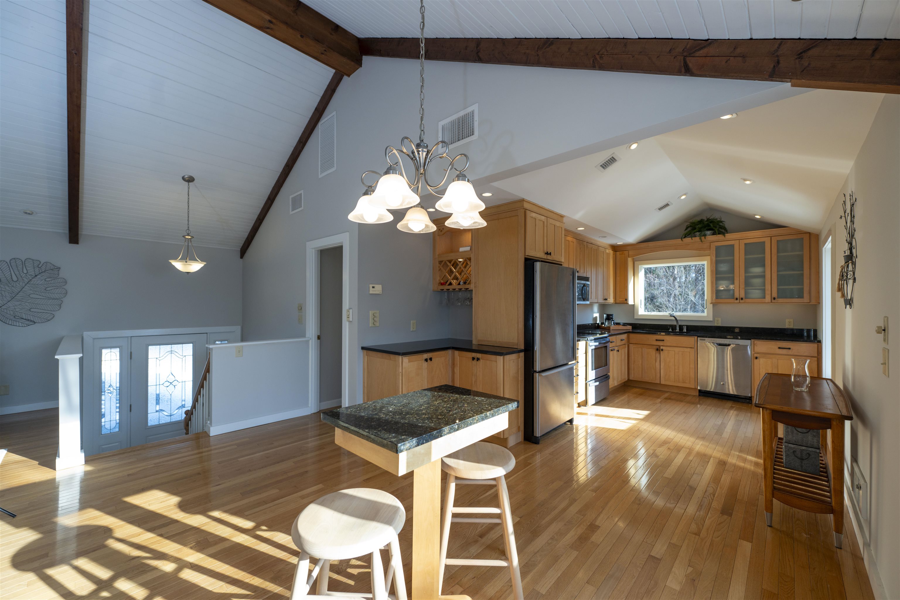 This inviting bi-level home blends comfort, character, and thoughtful updates in a bright, light-filled setting. Cathedral ceilings with decorative beams create an immediate sense of openness, complemented by hardwood floors throughout the main living space. The open-concept layout is anchored by a dramatic floor-to-ceiling brick fireplace with a handsome wood mantle, ideal for everyday living and entertaining. This four-bedroom, two-bath home truly maximizes space. The lower level features a large family room, three bedrooms, a full bath, and a dedicated laundry room. All lower-level rooms enjoy natural daylight and benefit from multiple exterior entrances, creating exceptional flexibility for guests, home offices, or extended living arrangements. With a southwesterly exposure, the home is filled with natural light throughout the day. A sunroom offers versatile additional living space and doubles as a game room with its own propane heating unit. A newly built deck with low-maintenance Trex decking is ideal for outdoor dining, relaxing, or hosting guests. A new front portico enhances curb appeal and provides a welcoming, covered entry. The updated kitchen features black granite countertops, stainless steel appliances, and black hardware. Forced-air cooling services the top floor. Set on a one-acre lot with elevation and potential views, the property offers privacy, with a protected greenbelt bordering the rear. A home that lives larger than it appears.