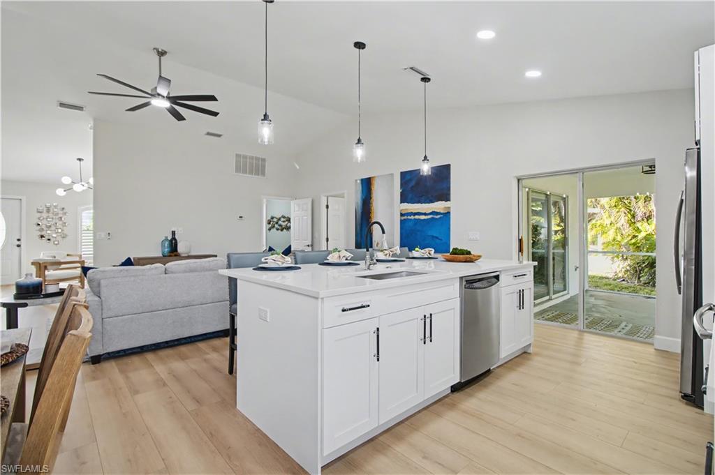 SELLER CREDIT $10, 000 - Welcome to this beautifully REMODELED 4 BEDROOM, 2 BATHROOM home located in the heart of Cape Coral. Thoughtfully updated throughout, this residence offers a HUGE OPEN FLOOR PLAN with soaring CATHEDRAL CEILINGS that create a bright, airy atmosphere ideal for both everyday living and entertaining. The modern finishes blend seamlessly with timeless design, giving the home a polished yet inviting feel. Situated in a PRIME LOCATION just minutes from the MIDPOINT BRIDGE, the property provides quick access to dining, shopping, and all that Southwest Florida has to offer. Set on a spacious CORNER LOT, the home offers added privacy and plenty of outdoor space with ROOM FOR A POOL, allowing you to design your own backyard retreat. A perfect combination of LOCATION, SPACE, and STYLE, this home delivers comfort and value in one of Cape Coral’s most convenient areas.