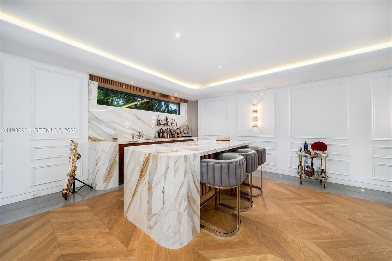 Built in 2018 & designed by DOMO Architecture, this extraordinary waterfront estate stands as the tallest residence on Dilido Island, offering architectural distinction, privacy & uncompromising luxury. Conceived for grand-scale entertaining, the home features executive-level security & soaring 12 foot ceilings with a fully integrated smart-home system. An exceptional use of luxurious marble throughout the interior & exterior creates a timeless, gallery-like elegance. The state-of-the-art kitchen, finished in striking Calacatta Gold marble & equipped with Wolf, Miele, & Sub-Zero appliances, anchors the home as a natural gathering space. Living areas flow seamlessly outdoors, embracing indoor-outdoor living with a resort-style pool, Jacuzzi, cabana, & a custom extra-large rounded Ipe dock, ideal for waterfront entertaining. Private bedroom suites embody modern luxury, featuring warm chevron oak floors, floor-to-ceiling sheer drapery, refined marble details, & Waterworks faucets and shower fixtures throughout. A dedicated cinema room with an 8K 125-inch projection screen & THX surround sound delivers a true private theater experience. Crowning the residence is a spectacular rooftop retreat with 360-degree water views of Downtown Miami and Miami Beach, complete with an award winning fully edible rooftop garden/farm. Additional features include a showroom garage (lift capable) & mature fruit & vegetable trees, completing this one-of-a-kind waterfront offering.