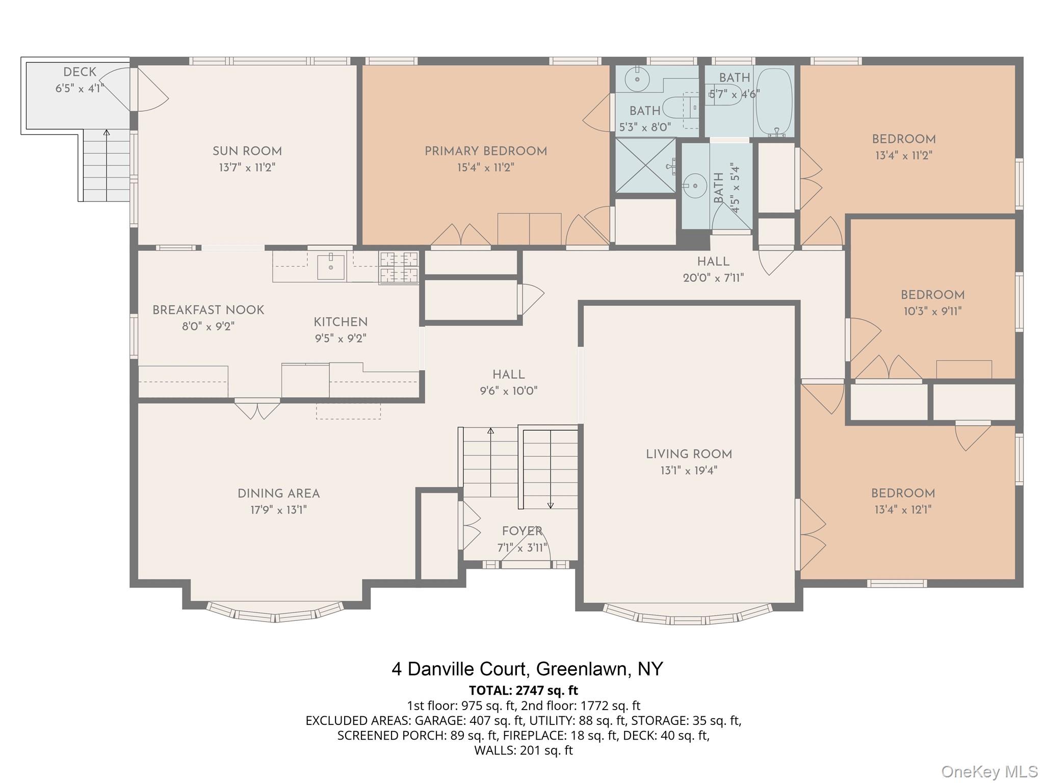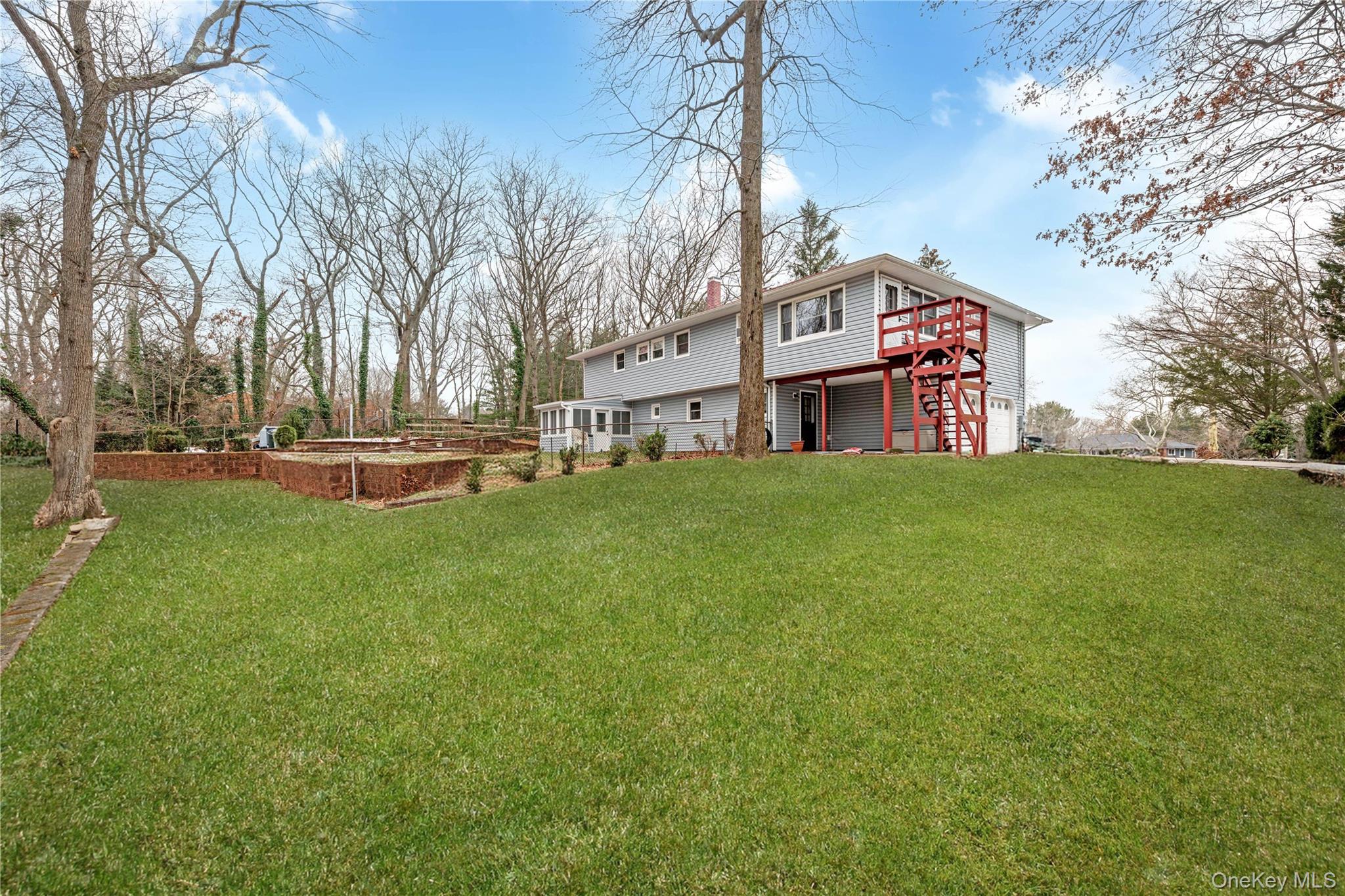 Magnificent, large Wideline Hi Ranch, situated on quiet Cul-de-sac, a full 1 Acre lot, very residential neighborhood, picturesque setting, Hilltop Development, heart of Elwood School District, huge, long concrete driveway w/Belgium blocks, newer brick paver walkway, brick paver stoop & steps w/PVC railings, great curb appeal w/brick & newer vinyl sided exterior, newer vinyl soffits, newer leaders & gutters, custom landscaping, living space plus garage total 3, 154 sq ft. Entry fiberglass door w/side panels, 2nd Floor spacious Living Room w/refinished hardwood floors, Bay window & French doors, Formal Dining Room w/refinished hardwood floors & Bay window, spacious Eat-in Kitchen w/oak cabinets, granite countertops & backsplash, stainless steel refrigerator, gas cooking & ceiling fan, rear extended Den w/parquet wood tile floors, knotty pine woodwork, ceiling fan, & exterior rear outside entrance, Master Bedroom w/wall-to-wall carpeting, ceiling fan, double closet & single closet, Master Bedroom Full Bath, 3 other Bedrooms plus Full Bath w/ceramic tile, pull down Attic with hide-away stairs, 1st Floor huge Family Room/Great Room w/fieldstone fireplace, built-in bookcases, ceramic tile floor, 2 ceiling fans & sliding doors to beautiful Sun Room, 5th Bedroom/Maid Quarters w/Half Bath, Laundry Room w/newer washer & dryer, Utility Room, gas heat, separate hot water heater, 3 zone heat, 200 amp electric, all windows have been replaced, all interior raised panel doors, 2 car attached garage w/1 electric garage door opener, roof only 1 year old stripped to sheathing, very private partially wooded, secluded, tranquil backyard, brick patio, underground sprinklers w/9 zones, close to LIRR, shopping, restaurants, Village, parks & Huntington beaches.