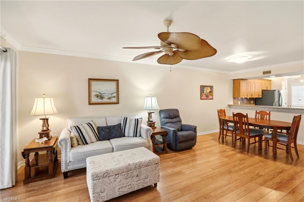 Welcome to this beautifully maintained 3-Bedroom, 2-Bathroom residence offering 1230 square feet of thoughtfully designed & upgraded living space. This Move-In ready, first-floor end unit showcases crown molding throughout, luxury vinyl plank flooring, stainless steel appliances, and plantation shutters on every window, creating a timeless and elegant interior. Enjoy scenic Lake and Fountain views from your expansive 4-Season Lanai, perfect for relaxing or entertaining year-round. The home features a New HVAC system (2025), Newer Hot Water Heater (2020), and the added peace of mind being located in a NON-Flood Zone. Additional highlights include a dedicated one car garage, abundant natural light from this end-unit location, hurricane-impact windows and doors slated for installation this spring-A Valuable upgrade at no added cost. New Front all Weather Screen door.