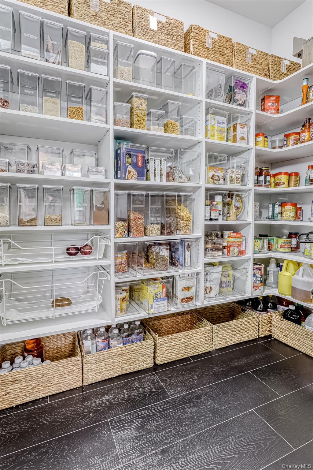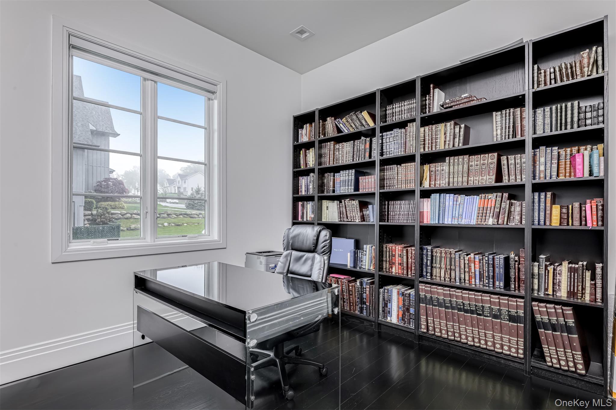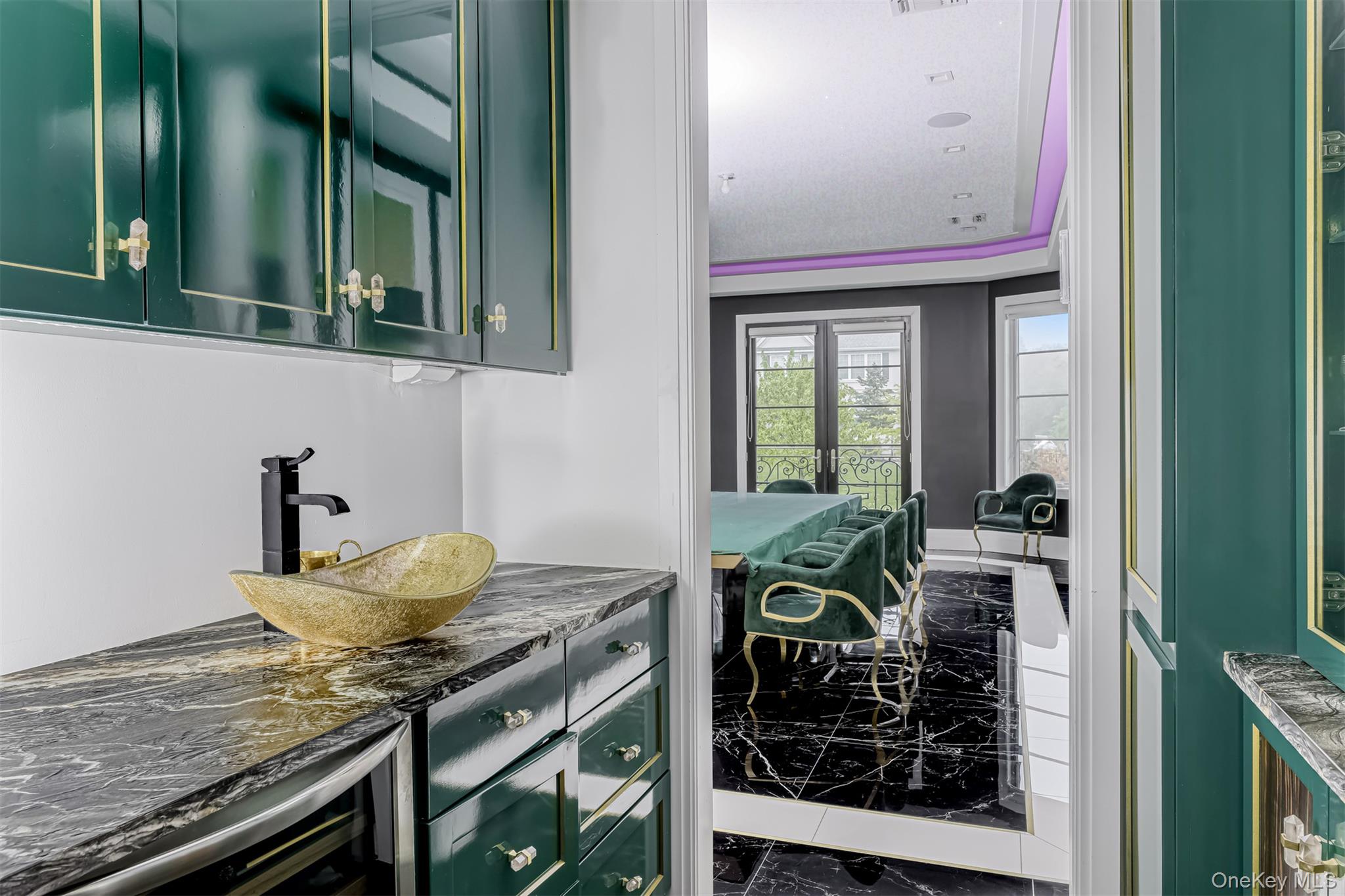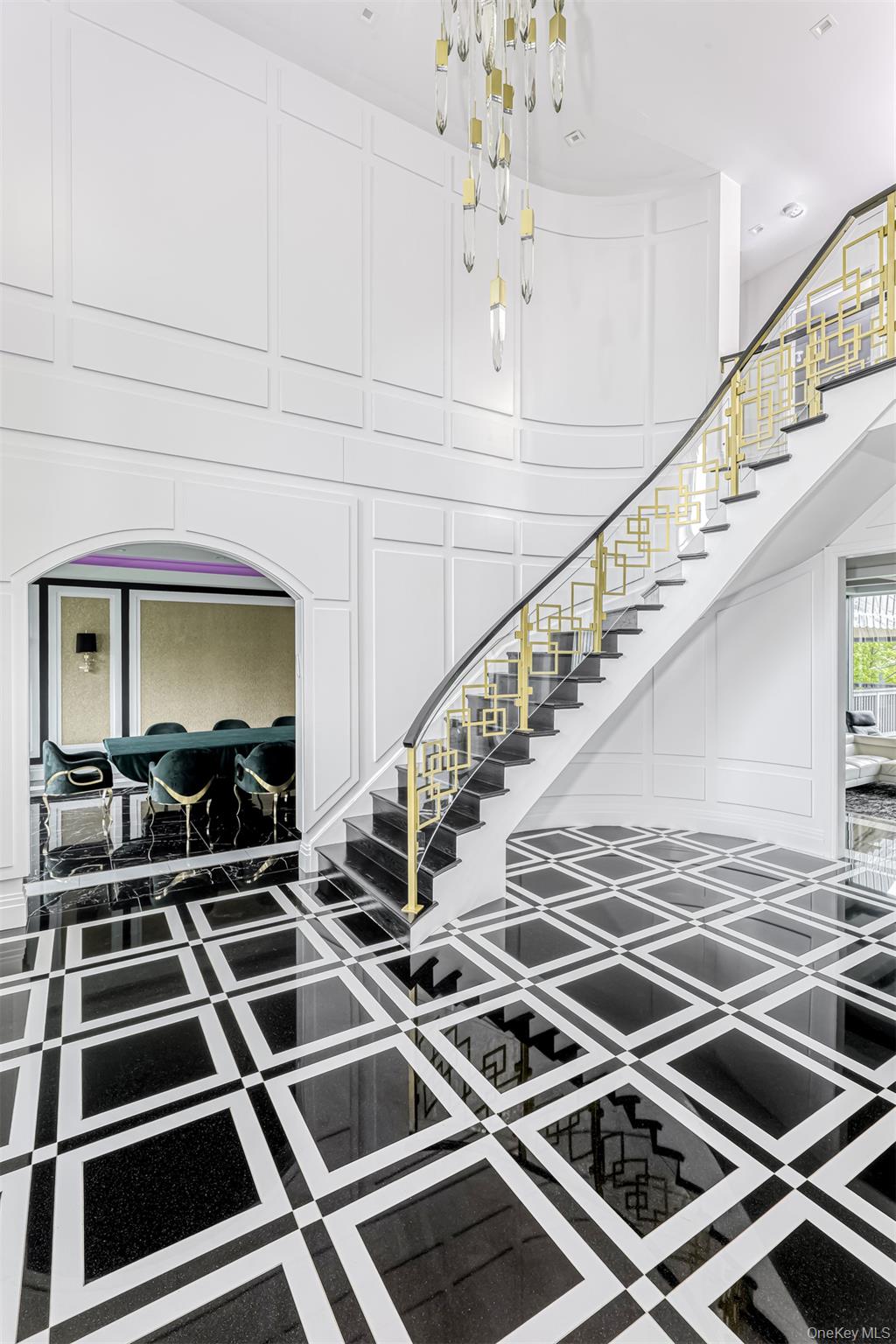 Exceptional Newly Constructed Custom Colonial Estate in Prime Pomona. Privately positioned on a serene cul-de-sac and set on nearly two acres of lush, tree-lined grounds, this remarkable residence offers breathtaking panoramic views of the Ramapo Mountains and an extraordinary sense of privacy. Designed by renowned professionals, the home is a bold expression of modern elegance, featuring a refined black, white, and gold palette and impeccable craftsmanship throughout. A dramatic entry through arched solid iron double doors opens to a grand marble foyer with soaring 10-foot ceilings, intricate wall detailing, and a sweeping curved staircase accented by custom glass and gold railings beneath a striking designer chandelier. The formal living room is both inviting and sophisticated, highlighted by custom floor-to-ceiling upholstered wall seating, a sleek electric fireplace, recessed lighting, and black-framed French doors leading to a Juliet balcony. The formal dining room mirrors this elegance, offering French doors, a Juliet balcony, and a tray ceiling with color-changing ambient lighting—ideal for elevated entertaining. A fully appointed butler’s pantry with custom cabinetry, wine cooler, and sink ensures seamless hosting. The sunken family room is a true showpiece, anchored by a stunning black-and-glass fireplace beneath coffered ceilings and surrounded by floor-to-ceiling windows that frame sweeping mountain and backyard views. Rich custom black wood flooring flows throughout the main level, complemented by Pella windows and custom square hi-hats that flood the home with natural light. The chef’s kitchen is designed for both function and style, featuring an expansive center island with breakfast seating and abundant storage, quartzite Panta countertops, white tile backsplash, three gold-accented sinks, and premium stainless-steel appliances. Highlights include a 6-burner Wolf range with an additional 2-burner cooktop, two GE ovens, oversized refrigerator, pot filler, custom hood, concealed walk-in pantry, two additional pantries, and dramatic black cabinetry with gold accents. The adjoining dinette opens through sliding glass doors to a deck with a large awning overlooking the impressive grounds. A side-entry mudroom with custom walk-in storage leads to a private guest suite complete with kitchenette, mini refrigerator, and full luxury bath. The main level also offers a home office and a sophisticated full bathroom. The upper level features six generously sized bedrooms with 9-foot ceilings, custom closets, and bespoke window treatments. The primary suite serves as a private retreat, showcasing tray ceilings, custom walk-in closets, and a spa-inspired bath with soaking tub overlooking the mountains, oversized steam shower with bench, dual vanities, and elegant crystal and gold finishes. A junior suite includes a private bath and walk-in closet, while two additional full baths service the remaining bedrooms, with potential for an additional bath. A conveniently located laundry room includes built-in shelving and a laundry chute to a secondary washer and dryer on the lower level. The walk-out lower level is partially finished with high ceilings and offers a recreation room with ample storage, a large additional bedroom, full bath, kitchenette, second washer and dryer, unfinished space for customization, and a private side entrance. Additional features include radiant heating with a 10-zone system, four-zone central air conditioning, central vacuum, integrated surround sound on the main level, security system, irrigation system, water softener, spray-foam insulation throughout, and a two-car garage. A truly rare offering of refined luxury, scale, and setting in one of Pomona’s most desirable locations.