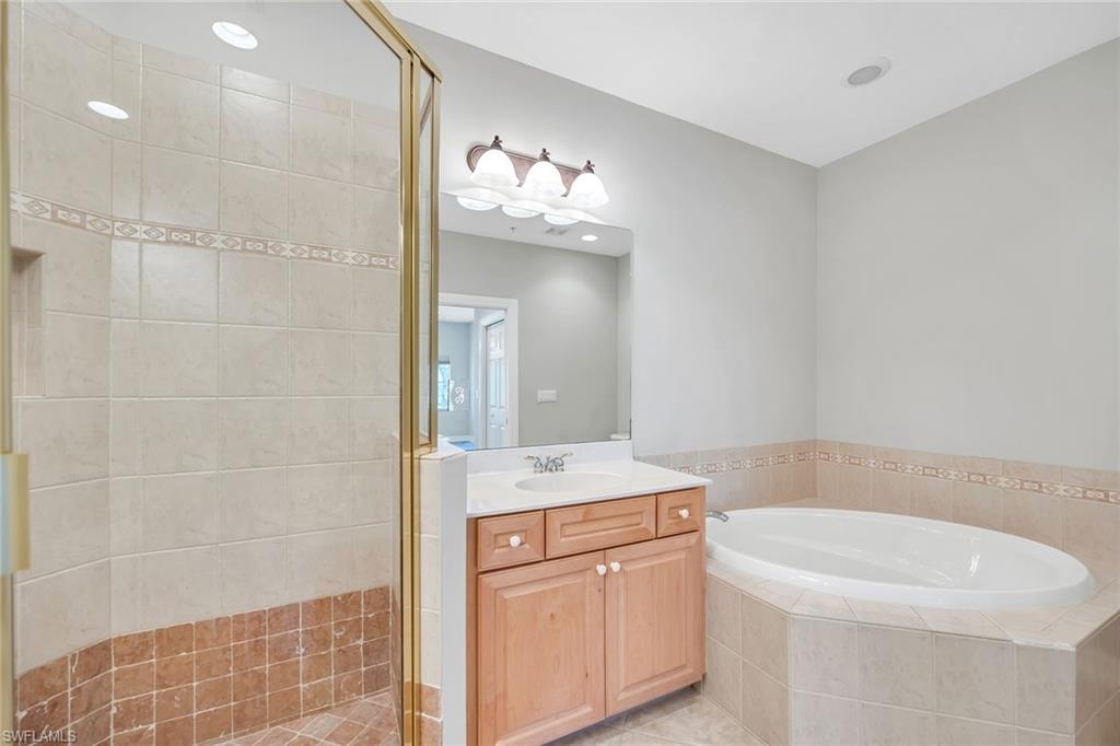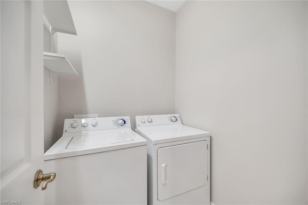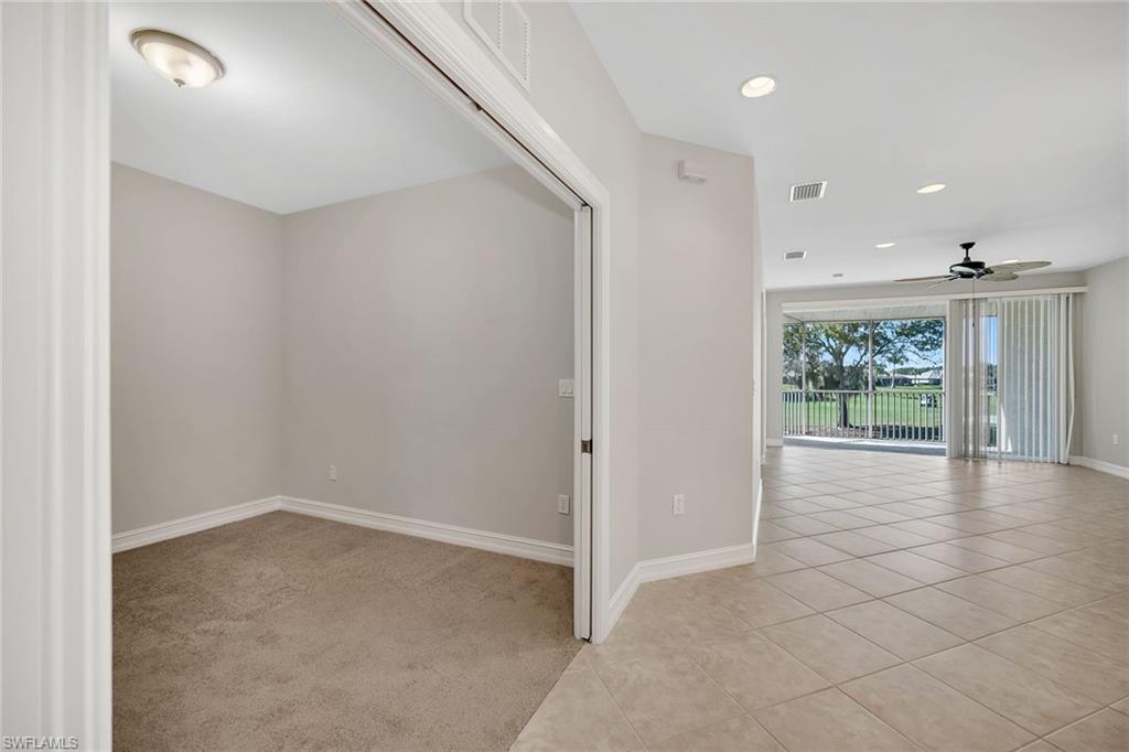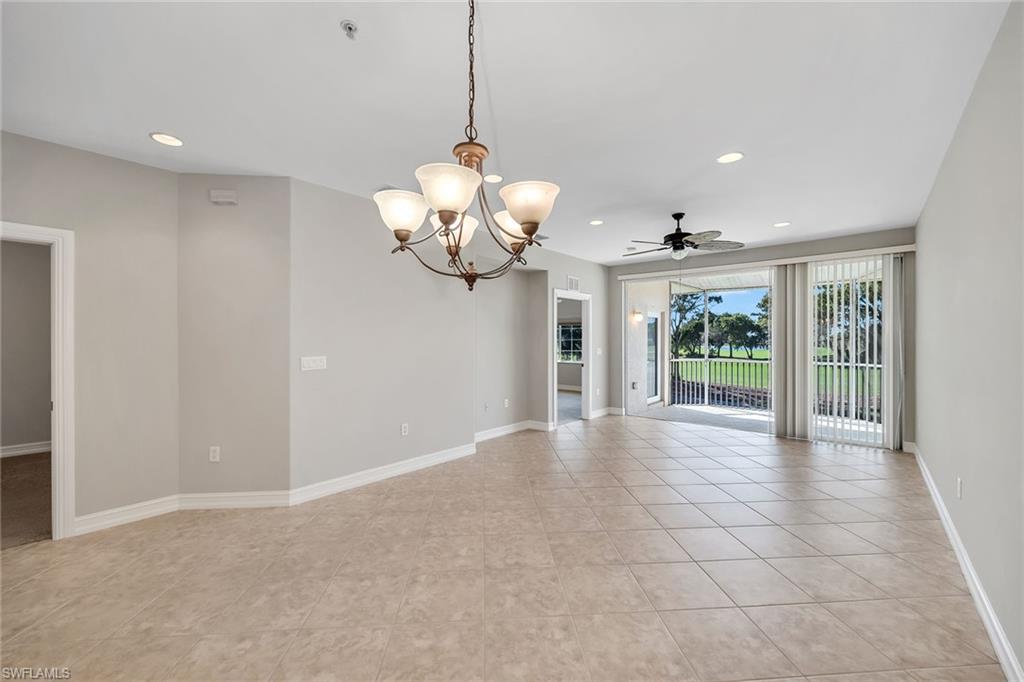 Privately positioned with tranquil lake and golf course views and desirable western exposure, this second-floor residence offers a peaceful retreat in Peridot at Sunstone on the Fairways in Lely Resort. The thoughtfully designed floor plan includes two bedrooms plus a versatile den or flex space, two baths and one assigned car space, delivering comfort, functionality and flexibility. Enjoy serene surroundings and beautiful sunsets from a quiet setting in one of Lely's desirable golfside communities. Inside, recessed lighting enhances the bright and inviting interior, while diagonal tile flooring flows throughout the main living areas. The kitchen features a convenient bar counter with a pass-through window to the living room, white appliances including a dishwasher, range, microwave and refrigerator with icemaker, a pantry and a charming breakfast area set by a window. The living room offers sliding glass door access to the screened lanai, framing peaceful lake views. The covered, screened lanai provides an inviting outdoor living space with relaxing views of the lake and golf course. The spacious primary suite enjoys lanai access along with lake and golf course views and is complemented by two walk-in closets with wooden shelving. The en-suite bath is well-appointed with dual sink vanities featuring full-width mirrors, a walk-in shower with niche and glass enclosure, and a separate soaking tub. The guest bedroom is conveniently near a full bath with a tub and shower combination, niche, and glass enclosure. A den with pocket doors functions ideally as a study or home office, while the dedicated laundry room includes a GE top-load washer and GE front-load dryer. Storm protection with shutters adds peace of mind. Residents enjoy access to a private community pool and spa, along with required membership to The Players Club and Spa, offering three resort-style pools, a full-service spa, state-of-the-art fitness center with classes and instructors, bocce, tennis and pickleball courts, two restaurants, a dog park and an expanded tiki bar. Two nearby public golf courses further enhance the lifestyle, completing the exceptional Lely Resort experience.