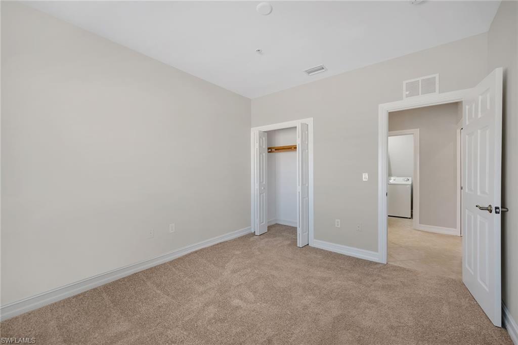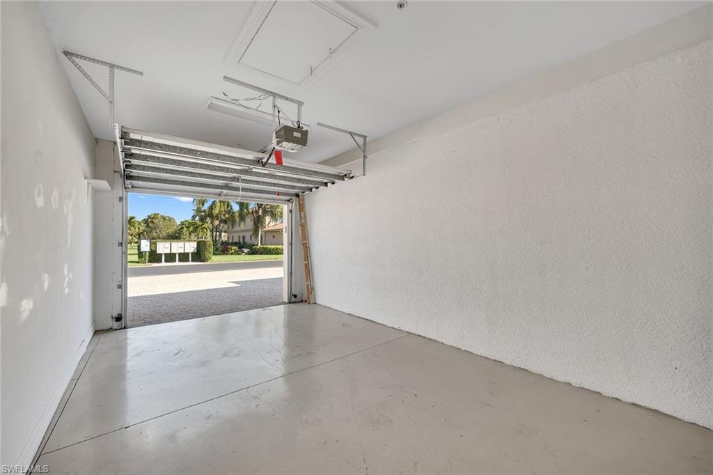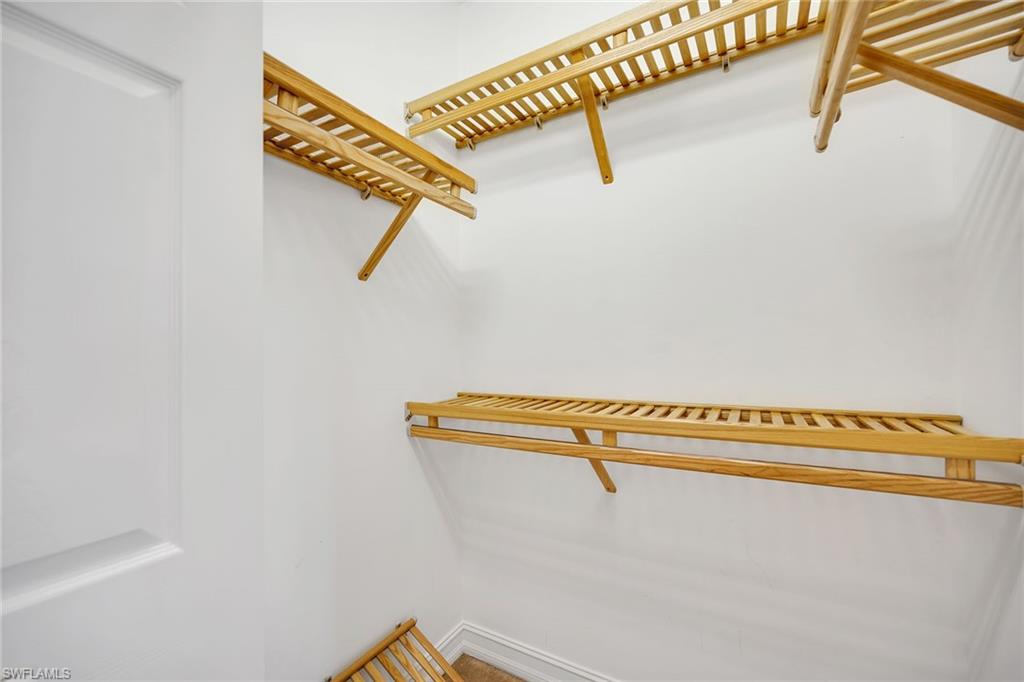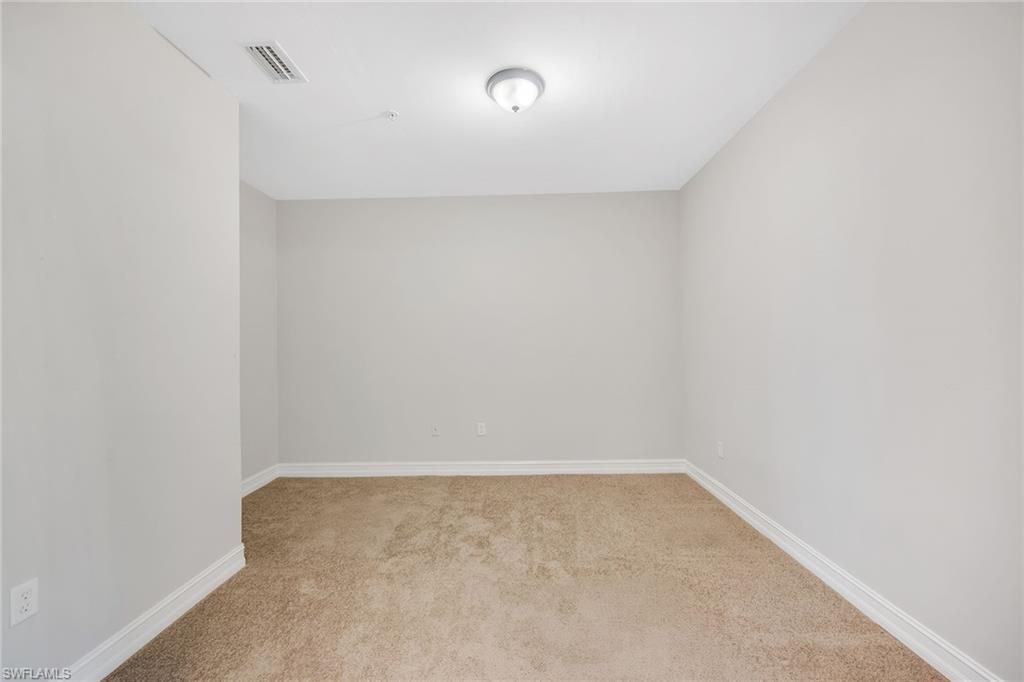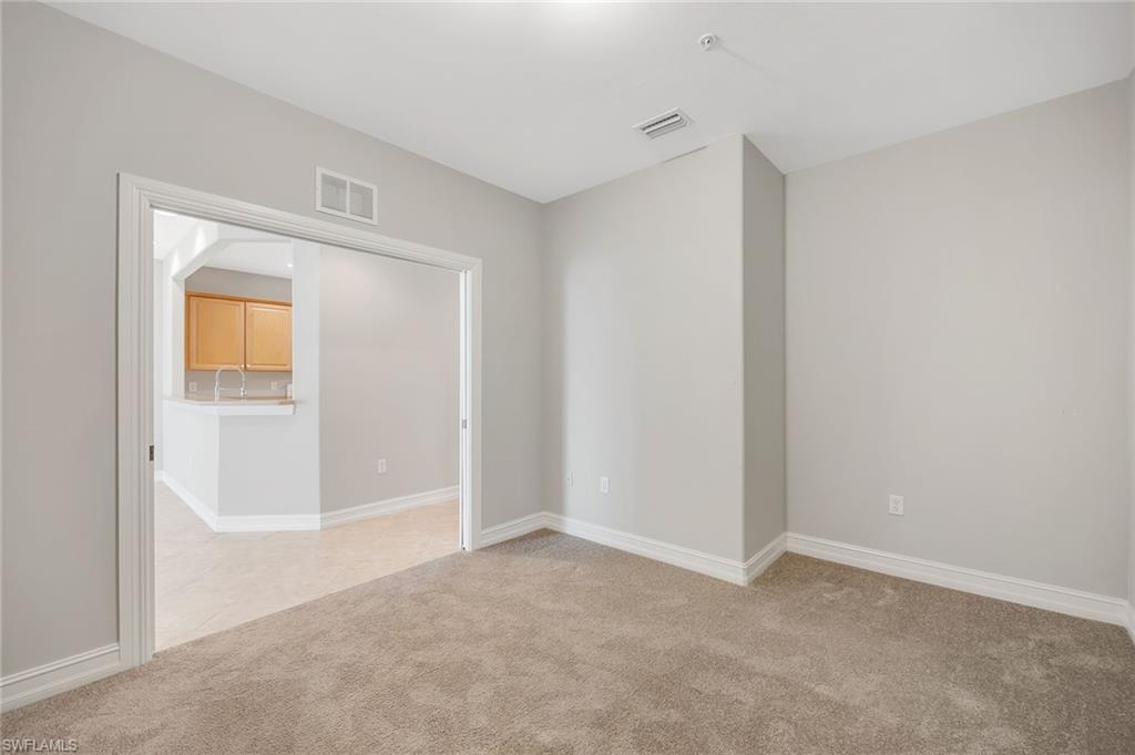 Privately positioned with tranquil lake and golf course views and desirable western exposure, this second-floor residence offers a peaceful retreat in Peridot at Sunstone on the Fairways in Lely Resort. The thoughtfully designed floor plan includes two bedrooms plus a versatile den or flex space, two baths and one assigned car space, delivering comfort, functionality and flexibility. Enjoy serene surroundings and beautiful sunsets from a quiet setting in one of Lely's desirable golfside communities. Inside, recessed lighting enhances the bright and inviting interior, while diagonal tile flooring flows throughout the main living areas. The kitchen features a convenient bar counter with a pass-through window to the living room, white appliances including a dishwasher, range, microwave and refrigerator with icemaker, a pantry and a charming breakfast area set by a window. The living room offers sliding glass door access to the screened lanai, framing peaceful lake views. The covered, screened lanai provides an inviting outdoor living space with relaxing views of the lake and golf course. The spacious primary suite enjoys lanai access along with lake and golf course views and is complemented by two walk-in closets with wooden shelving. The en-suite bath is well-appointed with dual sink vanities featuring full-width mirrors, a walk-in shower with niche and glass enclosure, and a separate soaking tub. The guest bedroom is conveniently near a full bath with a tub and shower combination, niche, and glass enclosure. A den with pocket doors functions ideally as a study or home office, while the dedicated laundry room includes a GE top-load washer and GE front-load dryer. Storm protection with shutters adds peace of mind. Residents enjoy access to a private community pool and spa, along with required membership to The Players Club and Spa, offering three resort-style pools, a full-service spa, state-of-the-art fitness center with classes and instructors, bocce, tennis and pickleball courts, two restaurants, a dog park and an expanded tiki bar. Two nearby public golf courses further enhance the lifestyle, completing the exceptional Lely Resort experience.