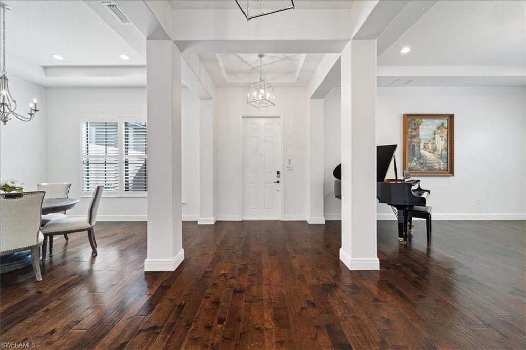 Discover the epitome of luxurious Florida living in this exquisite Duval model home, a masterpiece of refined living enhanced by an exterior casita with bathroom, located in the sought-after Maple Ridge neighborhood—premium lake views, and over $200, 000 in additional documented premium upgrades installed since 2023. From the moment you arrive, lush tropical landscaping and meticulous curb appeal envelop you. At the heart of the home lies a gourmet chef's kitchen designed for culinary enthusiasts, featuring quartz countertops, stylish tile backsplash, crown molding on cabinetry, stainless steel appliances (including dual built-in ovens and an oversized island), a butler's pantry, and a generous walk-in pantry. The open family room flows seamlessly into your private oasis: a one-of-a-kind outdoor living area unmatched in Ave Maria. The custom-built spa with waterfall leading to the saltwater pool is framed by an upgraded panoramic screen enclosure for unobstructed clear vistas of the neighborhood’s most coveted lake view. An upgraded powder-coated galvanized steel pergola with UV-protected soft sail shade canopy, enhanced by a Confederate Jasmine “living wall screen, ” provides shaded elegance and privacy. Beautifully upgraded pool pavers, including built-in fully irrigated custom stone planter inside the lanai, create a tranquil retreat for relaxation or hosting family and friends with your built-in entertainment system. The perimeter of the lanai features five mature 12-foot Sylvester and Canary palms, along with six 7-foot Robellini palms, colorful perennial flowers and shrubs, and a fully mature Clusia privacy hedge. Upstairs, the expansive master suite serves as a peaceful sanctuary, complete with a private sitting area, ensuite bathroom upgraded with glass-front doors, and a fully customized walk-in California closet. All secondary bedrooms feature large walk-in closets with extra professionally installed storage shelving. Premium finishes abound: hardwood flooring throughout main areas, tile in bathrooms, plantation shutters in formal spaces and upstairs rooms, professional blinds elsewhere, and upgraded lighting fixtures. For enhanced peace of mind, this home includes a fully installed ADT security system and impact-glass windows on the second floor. Included with the home is a stunning Yamaha Baby Grand Piano, like-new family room sofa, TVs, entertainment system, and artwork. A brand-new professionally installed, high-end custom garage shelving and organization system exceeding $3, 000 delivers premium, heavy-duty storage in both garages. Nestled in the vibrant, top-rated master-planned community of Ave Maria, enjoy resort-style amenities including a sparkling pool, expansive event room, state-of-the-art fitness center, card and billiards rooms, parks, trails, a water park, and charming town center shopping and dining. This extraordinary, elegant home is a must-see. Discover Florida living at its finest—welcome home.