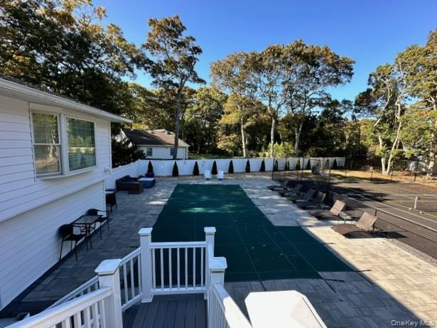 Newly Renovated Hi-Ranch with Open Concept Kitchen that includes Center Island with Quartz Countertops that can accomodate seating for 6, Wine Fridge & Microwave, Dining Area with Sliders to Large Deck, Living Room with Fireplace and Cathedral Ceiling with Recessed Lighting. The Main Level includes the Master Bedroom with Ensuite Bathroom, 2 Guest Bedrooms & Main Bathroom. The Lower Level includes 2 Bedrooms, Full Bathroom, Family Room with Sliders to the Rear Patio, Laundry Room and 1 Car Garage. The Rear Yard offers a Great Entertianing Space that includes an 18X36 Heated In Ground Pool surrounded by Paver Patio and a Tennis Court that doubles as a Pickleball Court.