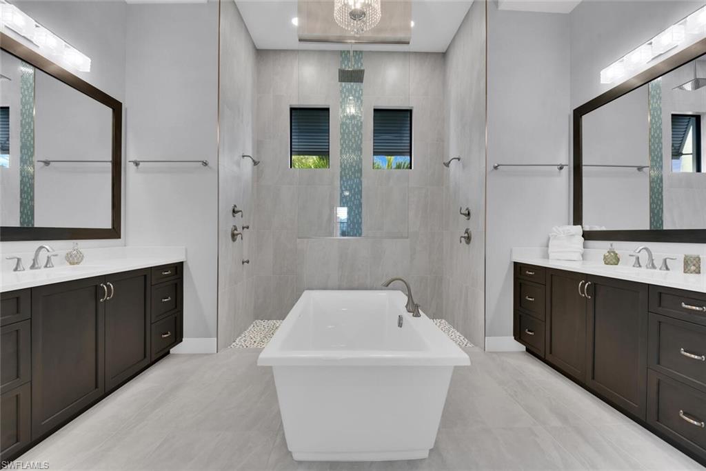 Modern coastal luxury awaits at Begonia Bay! This stunning 2020-built waterfront home was designed with enough space to comfortably host large families and all of the amenities savvy travelers seek in a Marco Island escape. Enter the home through the gracious foyer and pass the den on your way into the great room, which boasts captivating water views. A built in gas grill, fire table and oversized dock complete the package for ideal Florida outdoor living! Back inside, five bedrooms plus a den and four gorgeous bathrooms accommodate groups of up to twelve guests comfortably. On the ground floor, the primary suite is outfitted with a king size bed and has doors out to the lanai. The spacious bathroom has dual sink vanities, a sleek open tub and a dual head walk in shower. Another ground floor king bedroom is on the other side of the house, also featuring doors out to the lanai and an en suite bathroom. Upstairs, find two more king bedrooms and a large bunk bedroom with two bunk beds which sleeps four people. One of the king bedrooms has an en suite bathroom and there is second upstairs bathroom with a dual sink vanity that serves the bunk room and the other king bedroom.
