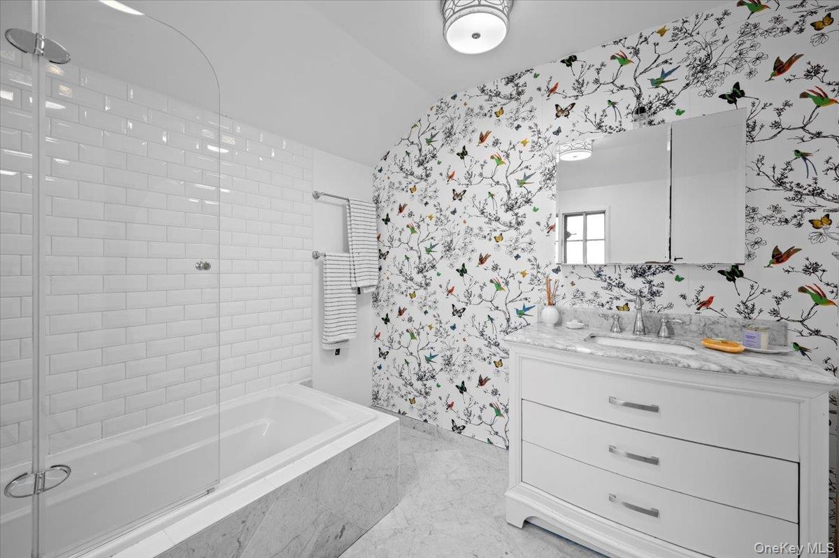 Refined Tudor elegance meets thoughtful modern updates in this exceptional residence showcasing rich hardwood oak floors throughout. The living room is distinguished by a beamed ceiling, timeless architectural details, and a dramatic wood burning stone fireplace with custom mantle, creating a warm yet sophisticated ambiance. French doors enhance the home’s classic character. The newly designed kitchen features quartz countertops, stainless steel appliances and a peninsula, seamlessly connecting to the dining room with sliding doors to the deck and yard—ideal for effortless entertaining. The first floor also incudes a well-appointed den or office with a bath nearby, offering flexible accommodations for guest or work from home living, The lower level provides additional space including a laundry area, utilities, and direct access to a tandem two-car garage. Two generously sized bedrooms plus a third bedroom on second floor are complemented by a spacious renovated hall bath. Outdoor living is enhanced by a private yard and a custom outdoor brick oven-perfect for entertaining and al fresco dining. Ideally located for today’s lifestyle with convenient access to Fleetwood or Bronxville railroad stations, transportation and major highways