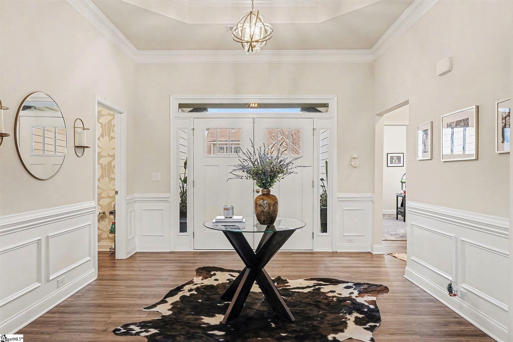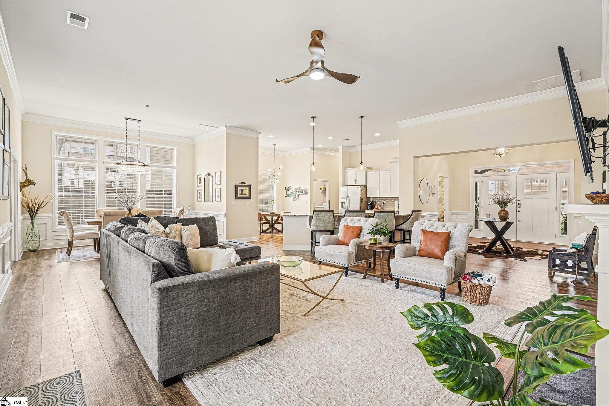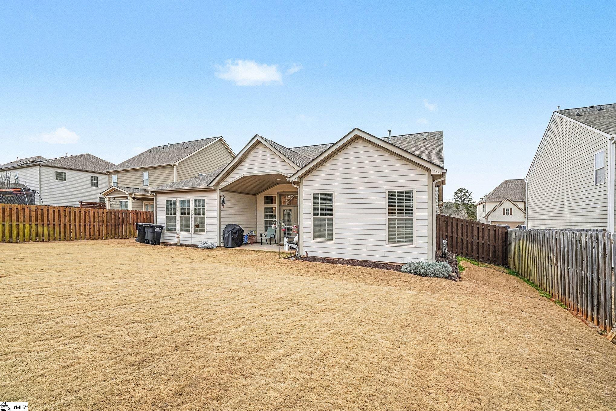 Welcome home to this beautifully maintained ranch style home. From the moment you step through the double front doors, you're greeted by a spacious foyer with trey ceiling that opens into a light filled, open concept living space designed for comfort and everyday living. Upscale finishes and details will elevate your lifestyle with beautiful trim/moldings, designer lighting and plumbing, transom windows and beautiful wallpaper in powder room. Great Room features soaring ceilings and a cozy gas log fireplace open to the kitchen with granite countertops, abundant cabinetry, gas stove and a large peninsula ideal for casual dining and entertaining. A formal DR offers flexibility for gatherings, while a private office with glass French doors provides the perfect work from home or flex space for workout room, playroom etc. . In addition, a light filled sunroom provides an inviting space filled with natural light for a den that can be used for family gatherings, entertaining or relaxing at home. Covered back porch overlooks level, fenced backyard. Primary suite features trey ceiling, dual sinks, walk in closet, a garden tub and separate shower. Two bedrooms are separated up front with a full bath in their own hall creating privacy. Located conveniently to shopping, dining and award winning schools. Easy access to I-85 with easy commuting to downtown Greenville, Clemson, Anderson and more.
